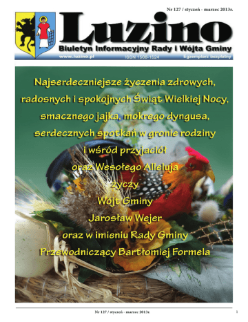 LUZINO Biuletyn Informacyjny Rady i Wójta GminyNr 127 / styczeń - marzec 2013r. Nr 127 / styczeń - marzec 2013r. 1 LUZINO Biuletyn Informacyjny Rady i Wójta Gminy INFORMACJA Z DZIAŁALNOŚCI PRZEWODNICZĄCEGO RADY GMINY za okres od 12.12.2012r. do 20.03.2013r. W okresie międzysesyjnym wykonywałem zadania przewodniczącego Rady Gminy Luzino według art. 19 ust. 2 ustawy o samorządzie gminnym i § 32 Statutu Gminy. Jako przewodniczący zajmowałem się organizacją pracy Rady Gminy Luzino. Współpracowałem z Wójtem Gminy Luzino realizując zadania tut. Rady. Pełniłem dyżury w siedzibie Rady Gminy Luzino przy ul. 10 Marca 11, raz w tygodniu w godz. 15.00 – 16.00. Przyjmowałem mieszkańców oraz radnych. W dniu 30 stycznia 2013 roku przyjąłem mieszkańca Luzina w kwestii zagospodarowania centrum Luzina. Brałem udział w naradzie Wójta z sołtysami, które odbyło się 18 grudnia 2012 roku w świetlicy wiejskiej w Kochanowie. Na dzień 27 grudnia 2012 roku zwołałem XXV sesję Rady Gminy Luzino, którą podzielono na dwie części. Pierwsza miała charakter uroczysty, a druga roboczy. Na uroczystej sesji wręczono nagrody studentom, uczniom i młodzieży szkół średnich, gimnazjum oraz szkół podstawowych. Zgodnie ze Statutem Gminy Luzino, w okresie międzysesyjnym koordynowałem pracami Komisji Rady Gminy, tj. 1. Komisji Rewizyjnej - 5 marca 2013 r. 2. Gospodarczej i Samorządu - 11 marca 2013 r. 3. Oświaty, Kultury i Sportu - 14 marca 2013 r. 4. Zdrowia i Opieki Społecznej - 12 marca 2013 r. 5. Konkursowej „Piękna Gmina” - 12 marca 2013 r. 6. Rolnictwa i Ochrony Środowiska - 15 marca 2013 r. 27 stycznia 2013 roku brałem udziałem w spotkaniu z kolędą, które zostało zorganizowane przez Stowarzyszenie „Skrzydło Anioła”. W minionym okresie uczestniczyłem w zebraniach wiejskich takich jak: Kębłowo - 14 stycznia 2013 r. i Luzino - 29 stycznia 2013 roku. Dnia 9 lutego 2013 r. uczestniczyłem w uroczystości związanej z przekazaniem samochodu ratowniczo – gaśniczego MAN TGM 18.340 4x4BB jednostce Ochotniczej Straży Pożarnej w Luzinie. W dniu 23 lutego 2013 roku wiceprzewodniczący Rady Zdzisław Koszałka reprezentował Radę Gminy Luzino w ostatnim pożegnaniu śp. Heleny Kotłowskiej, byłego kierownika Gminnej Biblioteki Publicznej w Luzinie. Na dzień 6 marca 2013 roku, na wniosek Wójta Gminy Luzino zwołałem XXVI sesję Rady Gminy Luzino. W dniu 16 marca 2013 roku brałem udział w „Dniu Jedności Kaszubów.” Bartłomiej Formela Przewodniczący Rady Gminy Luzino INFORMACJA Z DZIAŁALNOŚCI WÓJTA za okres od 13 grudnia 2012 r. do 19 marca 2013 r. 1. Dnia 4 stycznia br. odbył się doroczny koncert pn. „Luzińskie Kolędowanie” w Hali Widowiskowo-Sportowej z Zespołem „Feel”. Koncert Gmina zorganizowała 2 wspólnie ze Stowarzyszeniem Oliwskie Słoneczko. Dziękuję organizatorom tj. pracownikom GOK-u, GOSRiT-u oraz członkom OSP i Koła Gospodyń Wiejskich za doskonałą organizację. 2. Rozstrzygnięto przetargi na budowę 4 km chodników w naszej gminie. Wszystkie umowy zostały podpisane. Termin zakończenia wszystkich zadań to 30 czerwca 2013 r. Chodniki powstaną we wsiach: Sychowo 247 mb, Wyszecino 578 mb, Kochanowo 1095 mb, Kębłowie 1523mb, Milwinie 620 mb. 3. W styczniu i lutym odbyły się zebrania wiejskie we wszystkich sołectwach naszej gminy. Zebrania odbyły się w terminach: 14 stycznia – Kębłowo, 15 stycznia – Sychowo,16 stycznia – Barłomino, 17 stycznia – Wyszecino, 23 stycznia – T ępcz, 24 stycznia – Robakowo, 29 stycznia – Luzino, 30 stycznia - Milwino, 4 lutego – Luzino, 5 lutego – Zielnowo i Zelewo, 6 lutego – Dąbrówka, 11 lutego – Sychowo. Na zebraniach mieszkańcy złożyli łącznie 129 wniosków głównie inwestycyjnych. Wnioski są analizowane i na początku kwietnia przedstawię sołtysom jakie są obecnie możliwości realizacji tych wniosków. Na drugim w tym roku zebraniu we wsi Sychowo wybrano nowego sołtysa, którym został Pan Michał Kummer. 4. W dniu 9 stycznia podpisałem umowy z trzydziestoma rodzinami z naszej gminy, które zakwalifikowały się do projektu „Zapobieganie Wykluczeniu Cyfrowemu w Gminie Luzino”. Rodziny te w ramach projektu otrzymały sprzęt komputerowy wraz z oprogramowaniem, zostały przeszkolone oraz doprowadzono do ich domów internet. 5. W dniu 17 stycznia złożyłem na ręce Dyrektora Generalnej Dyrekcji Dróg i Autostrad, oddział w Gdańsku kolejny wniosek dotyczący przebudowy skrzyżowania ul. Wilczka w Luzinie z drogą krajową (prawoskręt), budowy chodnika wzdłuż drogi krajowej oraz ustawienia sygnalizacji świetlnej na skrzyżowaniu drogi krajowej z ul. Wiejską w Kębłowie. 6. W dniu 9 lutego odbyła się uroczystość przekazania nowego ciężkiego samochodu pożarniczego marki Man dla OSP w Luzinie. 7. W związku z budową przez Gminę Luzino czterech zatok autobusowych przy drogach powiatowych realizowanych przy budowie chodników (2 zatoki w Kochanowie, 2 zatoki w Sychowie) wystąpiłem do Zarządu Powiatu Wejherowskiego o wybudowanie trzech zatok przez Starostwo Wejherowo. Dyrektor Zarządu Dróg Powiatowych poinformował mnie, że jest zgoda Zarządu, a szczegóły zostaną dopracowane w najbliższym czasie. 8. W dniu 26 marca o godz. 11.00 odbędzie się spotkanie Radnych i Sołtysów z przedstawicielami spółki PGNiG dotyczące planowanego odwiertu gazu łupkowego we wsi Dąbrówka. Natomiast spotkanie z mieszkańcami wsi Dąbrówka odbędzie się 9 kwietnia o godz. 19.00 w świetlicy wiejskiej w Dąbrówce. 9. Istnieje realna szansa na zdobycie ze środków UE w ramach Lokalnej Grupy Rybackiej „Pradolina Łeby” Nr 127 / styczeń - marzec 2013r. LUZINO Biuletyn Informacyjny Rady i Wójta Gminy 1.300.000 zł na budowę nowego centrum Luzina. Wkład własny wynosi 15%, czyli około 200.000 zł. Ważne jest to, że do środków kwalifikowanych zaliczany jest koszt projektu oraz podatek VAT. Jest to jeden z najl