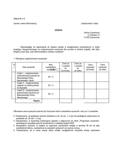 Załącznik nr 2 (nazwa i adres Wykonawcy) (miejscowość i data) OFERTA Gmina Czeremcha ul. Duboisa 14 17-240 Czeremcha Odpowiadając na zaproszenie do wzięcia udziału w postępowaniu prowadzonym w trybie przetargu nieograniczonego na zorganizowanie wycieczek dla uczniów w ramach projektu „Nie tylko książką uczeń żyje, czyli wykorzystujemy wiedzę w praktyce” 1. Oferujemy zorganizowanie wycieczek: N r Opis wycieczki Część I – zorganizowanie czterodniowej wycieczki do Słowińskiego Parku Narodowego i okolic Część II – zorganizowanie wyjazdu na zieloną szkołę do Supraśla Część III –zorganizowanie jednodniowej wycieczki do Białowieskiego Parku Narodowego Ilość uczestników wycieczki Cena za 1 uczestni ka (zł brutto) Cena za 1 uczestni ka (zł netto) Cena wycieczki (zł brutto) Cena wycieczki (zł netto) 40 + 3 22 + 2 25 + 2 Razem: Oferowana cena wycieczki powinna być iloczynem ilości uczestników wycieczki i ceny za 1 uczestnika. 2. Oświadczamy, że spełniamy warunki określone w art. 22 ust. 1, w tym nie podlegamy wykluczeniu na podstawie art. 24 ust.1 i 2 uzp. 3. Oświadczamy, iż wycieczkę zrealizujemy zgodnie z załączonym do oferty „Programem wycieczki”, spełniającym wszystkie warunki wymienione w rozdziale drugim SIWZ. 4. Akceptujemy warunek, iż zapłata za wykonane zamówienie nastąpi w terminie 30 dni od daty przedłożenia faktury, wystawionej na zasadach opisanych we wzorze umowy. 5. Oświadczamy, że w cenie naszej oferty zostały uwzględnione wszystkie koszty wykonania zamówienia. 6. Oświadczamy, że zapoznaliśmy się z treścią SIWZ (w tym ze wzorem umowy) i nie wnosimy do niej zastrzeżeń oraz przyjmujemy warunki w niej zawarte. 7. Oświadczamy, że uważamy się za związanych z niniejszą ofertą na czas wskazany w SIWZ. 8. W przypadku przyznania nam zamówienia, zobowiązujemy się do zawarcia umowy w miejscu i terminie wskazanym przez Zamawiającego. 9. Oferta została złożona na ................. stronach kolejno ponumerowanych od nr ....... do nr ......... 10. Integralną część oferty stanowią następujące dokumenty*: a)............................................................................................................................................................ b)............................................................................................................................................................ c)............................................................................................................................................................ d)............................................................................................................................................................ e)............................................................................................................................................................ 11. Tajemnicą przedsiębiorstwa w rozumieniu przepisów ustawy o zwalczaniu nieuczciwej konkurencji, która nie będzie podlegać udostępnieniu, są następujące informacje**: a)............................................................................................................................................................ b)............................................................................................................................................................ c)............................................................................................................................................................ .......................................................................... (podpis upełnomocnionego(ych) przedstawiciela(i) Wykonawcy) Uwaga: * jeżeli dołączone są kopie dokumentów, to muszą być one poświadczone przez Wykonawcę za zgodność z oryginałem, ** należy wymienić dokumenty lub ich części albo podać numery stron, na których znajdują się informacje będące tajemnicą przedsiębiorstwa w rozumieniu ustawy o zwalczaniu nieuczciwej konkurencji.