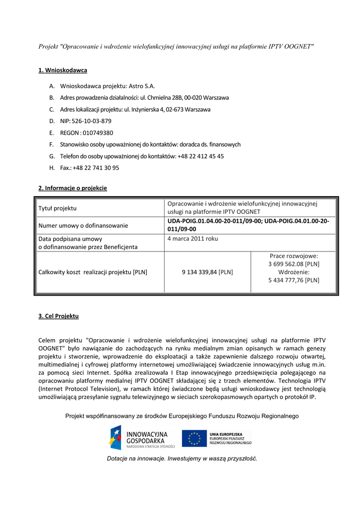 Projekt "Opracowanie i wdrożenie wielofunkcyjnej innowacyjnej usługi na platformie IPTV OOGNET" 1. Wnioskodawca A. Wnioskodawca projektu: Astro S.A. B. Adres prowadzenia działalności: ul. Chmielna 28B, 00-020 Warszawa C. Adres lokalizacji projektu: ul. Inżynierska 4, 02-673 Warszawa D. NIP: 526-10-03-879 E. REGON : 010749380 F. Stanowisko osoby upoważnionej do kontaktów: doradca ds. finansowych G. Telefon do osoby upoważnionej do kontaktów: +48 22 412 45 45 H. Fax.: +48 22 741 30 95 2. Informacje o projekcie Tytuł projektu Numer umowy o dofinansowanie Data podpisana umowy o dofinansowanie przez Beneficjenta Całkowity koszt realizacji projektu [PLN] Opracowanie i wdrożenie wielofunkcyjnej innowacyjnej usługi na platformie IPTV OOGNET UDA-POIG.01.04.00-20-011/09-00; UDA-POIG.04.01.00-20011/09-00 4 marca 2011 roku 9 134 339,84 [PLN] Prace rozwojowe: 3 699 562.08 [PLN] Wdrożenie: 5 434 777,76 [PLN] 3. Cel Projektu Celem projektu "Opracowanie i wdrożenie wielofunkcyjnej innowacyjnej usługi na platformie IPTV OOGNET" było nawiązanie do zachodzących na rynku medialnym zmian opisanych w ramach genezy projektu i stworzenie, wprowadzenie do eksploatacji a także zapewnienie dalszego rozwoju otwartej, multimedialnej i cyfrowej platformy internetowej umożliwiającej świadczenie innowacyjnych usług m.in. za pomocą sieci Internet. Spółka zrealizowała I Etap innowacyjnego przedsięwzięcia polegającego na opracowaniu platformy medialnej IPTV OOGNET składającej się z trzech elementów. Technologia IPTV (Internet Protocol Television), w ramach której świadczone będą usługi wnioskodawcy jest technologią umożliwiającą przesyłanie sygnału telewizyjnego w sieciach szerokopasmowych opartych o protokół IP. Projekt współfinansowany ze środków Europejskiego Funduszu Rozwoju Regionalnego Dotacje na innowacje. Inwestujemy w waszą przyszłość.