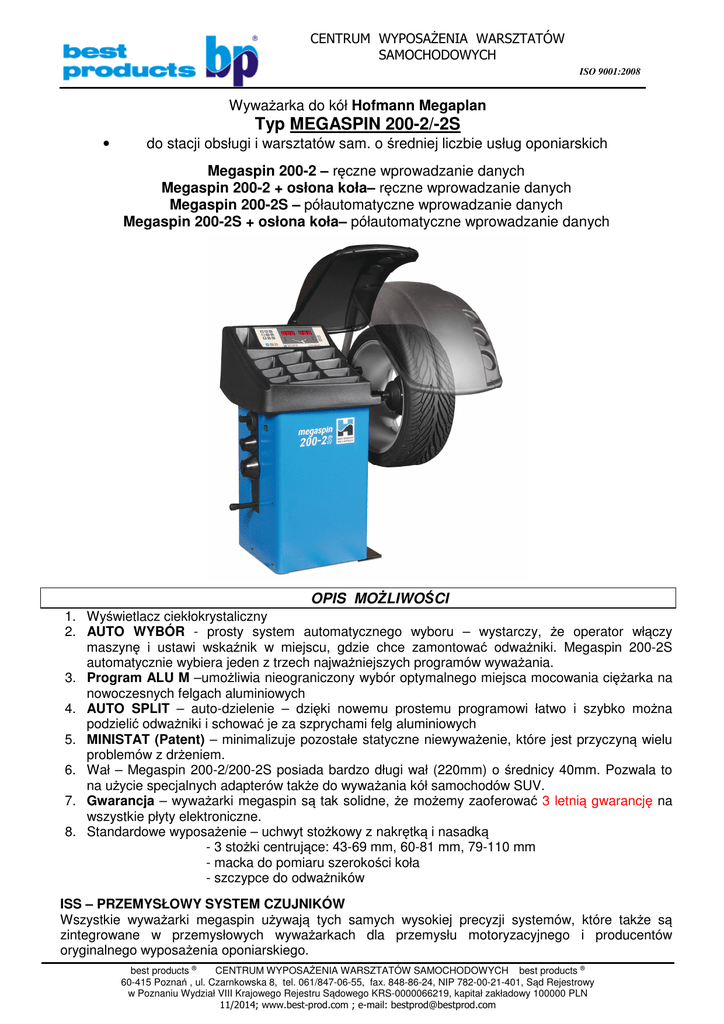 CENTRUM WYPOSAŻENIA WARSZTATÓW SAMOCHODOWYCH ISO 9001:2008 Wyważarka do kół Hofmann Megaplan Typ MEGASPIN 200-2/-2S • do stacji obsługi i warsztatów sam. o średniej liczbie usług oponiarskich Megaspin 200-2 – ręczne wprowadzanie danych Megaspin 200-2 + osłona koła– ręczne wprowadzanie danych Megaspin 200-2S – półautomatyczne wprowadzanie danych Megaspin 200-2S + osłona koła– półautomatyczne wprowadzanie danych OPIS MOŻLIWOŚCI 1. Wyświetlacz ciekłokrystaliczny 2. AUTO WYBÓR - prosty system automatycznego wyboru – wystarczy, że operator włączy maszynę i ustawi wskaźnik w miejscu, gdzie chce zamontować odważniki. Megaspin 200-2S automatycznie wybiera jeden z trzech najważniejszych programów wyważania. 3. Program ALU M –umożliwia nieograniczony wybór optymalnego miejsca mocowania ciężarka na nowoczesnych felgach aluminiowych 4. AUTO SPLIT – auto-dzielenie – dzięki nowemu prostemu programowi łatwo i szybko można podzielić odważniki i schować je za szprychami felg aluminiowych 5. MINISTAT (Patent) – minimalizuje pozostałe statyczne niewyważenie, które jest przyczyną wielu problemów z drżeniem. 6. Wał – Megaspin 200-2/200-2S posiada bardzo długi wał (220mm) o średnicy 40mm. Pozwala to na użycie specjalnych adapterów także do wyważania kół samochodów SUV. 7. Gwarancja – wyważarki megaspin są tak solidne, że możemy zaoferować 3 letnią gwarancję na wszystkie płyty elektroniczne. 8. Standardowe wyposażenie – uchwyt stożkowy z nakrętką i nasadką - 3 stożki centrujące: 43-69 mm, 60-81 mm, 79-110 mm - macka do pomiaru szerokości koła - szczypce do odważników ISS – PRZEMYSŁOWY SYSTEM CZUJNIKÓW Wszystkie wyważarki megaspin używają tych samych wysokiej precyzji systemów, które także są zintegrowane w przemysłowych wyważarkach dla przemysłu motoryzacyjnego i producentów oryginalnego wyposażenia oponiarskiego. best products ® CENTRUM WYPOSAŻENIA WARSZTATÓW SAMOCHODOWYCH best products ® 60-415 Poznań , ul. Czarnkowska 8, tel. 061/847-06-55, fax. 848-86-24, NIP 782-00-21-401, Sąd Rejestrowy w Poznaniu Wydział VIII Krajowego Rejestru Sądowego KRS-0000066219, kapitał zakładowy 100000 PLN 11/2014; www.best-prod.com ; e-mail: [email protected] CENTRUM WYPOSAŻENIA WARSZTATÓW SAMOCHODOWYCH ISO 9001:2008 OPCJONALNIE (płatne dodatkowo) 1. Osłona koła zapewniająca bezpieczną i czystą pracę. 2. Uniwersalny uchwyt mocujący do felg nie przelotowych z 3,4 lub 5 otworami i rozstawem śrub 95-210 mm. Zawiera specjalny stożek (patent) do centrowania felgi przez jej otwór. 3. Pokrywa dociskowa do felg aluminiowych 4. Pierścień centrujący do średnic 56,5; 57; 66,5; i 72,5 mm 5. Zestaw podkładek dla kół z bardzo dużych przesunięciach (SUV, 4WD) 6. Pierścienie i stożki do Vanów, aut z napędem na 4 koła i lekkich ciężarówek z otworami 97-180mm 7. uchwyt do kół motocyklowych ŁATWOŚĆ OBSŁUGI Megaspin 200-2S: automatycznie stalowe / ALU M / ALU 3M Megaspin 200-2: ręcznie Wprowadzanie danych felg aluminiowych Megaspin 200-2S: automatyczne Megaspin 200-2: ręcznie Pozycje odważników na felgach Nieograniczone aluminiowych Program podziału odważników AUTO SPLIT Zawarty MINISTAT (patent) Zawarty Wielu operatorów 2 operatorów Wprowadzanie danych dla felg stalowych: Odległość Megaspin 200-2S: automatyczne Megaspin 200-2: ręcznie Średnica Megaspin 200-2S: automatyczne Megaspin 200-2: ręcznie Szerokość ręcznie DANE TECHNICZNE Szerokość felgi 1,5 – 20 cali Średnica felgi 10 - 30 cali Max. średnica koła 1200 mm Max. szerokość koła 530 mm Max. waga koła 70 kg Obroty (rpm) 100 Wymiary opakowania (SxDxW) 1080 x 880 x 1140 mm Waga brutto 138 kg Zasilanie 115-230 V / 50/60 Hz / 1 Ph / 500 W AUTO WYBÓR best products ® CENTRUM WYPOSAŻENIA WARSZTATÓW SAMOCHODOWYCH best products ® 60-415 Poznań , ul. Czarnkowska 8, tel. 061/847-06-55, fax. 848-86-24, NIP 782-00-21-401, Sąd Rejestrowy w Poznaniu Wydział VIII Krajowego Rejestru Sądowego KRS-0000066219, kapitał zakładowy 100000 PLN 11/2014; www.best-prod.com ; e-mail: [email protected]