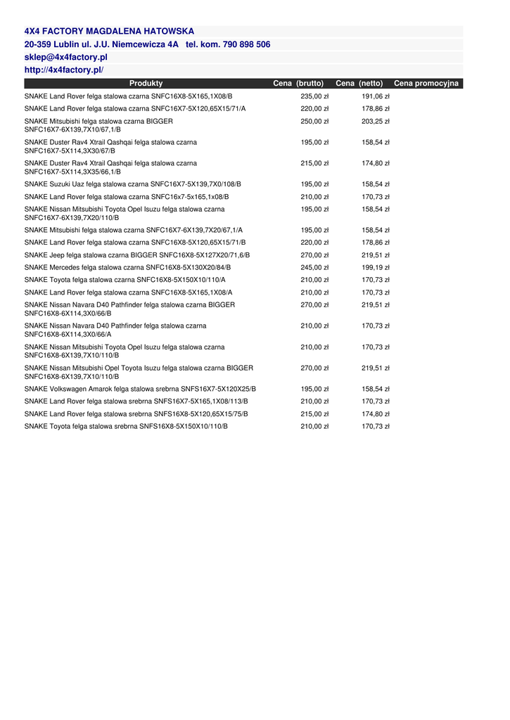 4X4 FACTORY MAGDALENA HATOWSKA 20-359 Lublin ul. J.U. Niemcewicza 4A tel. kom. 790 898 506 [email protected] http://4x4factory.pl/ Produkty Cena (brutto) Cena (netto) SNAKE Land Rover felga stalowa czarna SNFC16X8-5X165,1X08/B 235,00 zł 191,06 zł SNAKE Land Rover felga stalowa czarna SNFC16X7-5X120,65X15/71/A 220,00 zł 178,86 zł SNAKE Mitsubishi felga stalowa czarna BIGGER SNFC16X7-6X139,7X10/67,1/B 250,00 zł 203,25 zł SNAKE Duster Rav4 Xtrail Qashqai felga stalowa czarna SNFC16X7-5X114,3X30/67/B 195,00 zł 158,54 zł SNAKE Duster Rav4 Xtrail Qashqai felga stalowa czarna SNFC16X7-5X114,3X35/66,1/B 215,00 zł 174,80 zł SNAKE Suzuki Uaz felga stalowa czarna SNFC16X7-5X139,7X0/108/B 195,00 zł 158,54 zł SNAKE Land Rover felga stalowa czarna SNFC16x7-5x165,1x08/B 210,00 zł 170,73 zł SNAKE Nissan Mitsubishi Toyota Opel Isuzu felga stalowa czarna SNFC16X7-6X139,7X20/110/B 195,00 zł 158,54 zł SNAKE Mitsubishi felga stalowa czarna SNFC16X7-6X139,7X20/67,1/A 195,00 zł 158,54 zł SNAKE Land Rover felga stalowa czarna SNFC16X8-5X120,65X15/71/B 220,00 zł 178,86 zł SNAKE Jeep felga stalowa czarna BIGGER SNFC16X8-5X127X20/71,6/B 270,00 zł 219,51 zł SNAKE Mercedes felga stalowa czarna SNFC16X8-5X130X20/84/B 245,00 zł 199,19 zł SNAKE Toyota felga stalowa czarna SNFC16X8-5X150X10/110/A 210,00 zł 170,73 zł SNAKE Land Rover felga stalowa czarna SNFC16X8-5X165,1X08/A 210,00 zł 170,73 zł SNAKE Nissan Navara D40 Pathfinder felga stalowa czarna BIGGER SNFC16X8-6X114,3X0/66/B 270,00 zł 219,51 zł SNAKE Nissan Navara D40 Pathfinder felga stalowa czarna SNFC16X8-6X114,3X0/66/A 210,00 zł 170,73 zł SNAKE Nissan Mitsubishi Toyota Opel Isuzu felga stalowa czarna SNFC16X8-6X139,7X10/110/B 210,00 zł 170,73 zł SNAKE Nissan Mitsubishi Opel Toyota Isuzu felga stalowa czarna BIGGER SNFC16X8-6X139,7X10/110/B 270,00 zł 219,51 zł SNAKE Volkswagen Amarok felga stalowa srebrna SNFS16X7-5X120X25/B 195,00 zł 158,54 zł SNAKE Land Rover felga stalowa srebrna SNFS16X7-5X165,1X08/113/B 210,00 zł 170,73 zł SNAKE Land Rover felga stalowa srebrna SNFS16X8-5X120,65X15/75/B 215,00 zł 174,80 zł SNAKE Toyota felga stalowa srebrna SNFS16X8-5X150X10/110/B 210,00 zł 170,73 zł Cena promocyjna