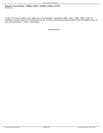 Szkoła Podstawowa Wijewo Zjazd roczników 1966,1967,1968,1969,1970 21.06.2010. W dniu 19 czerwca 2010 roku odbył się I-sze spotkanie roczników 1966, 1967, 1968, 1969, 1970. W spotkaniu wzięło udział 10 nauczycieli oraz 80 uczniów. Wszyscy bawili się świetnie aż do białego rana. Ja sam też tam byłem i miód, i wino piłem... administrator http://spwijewo.intmedia.pl Kreator PDF Utworzono 3 March, 2017, 15:53