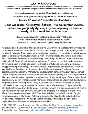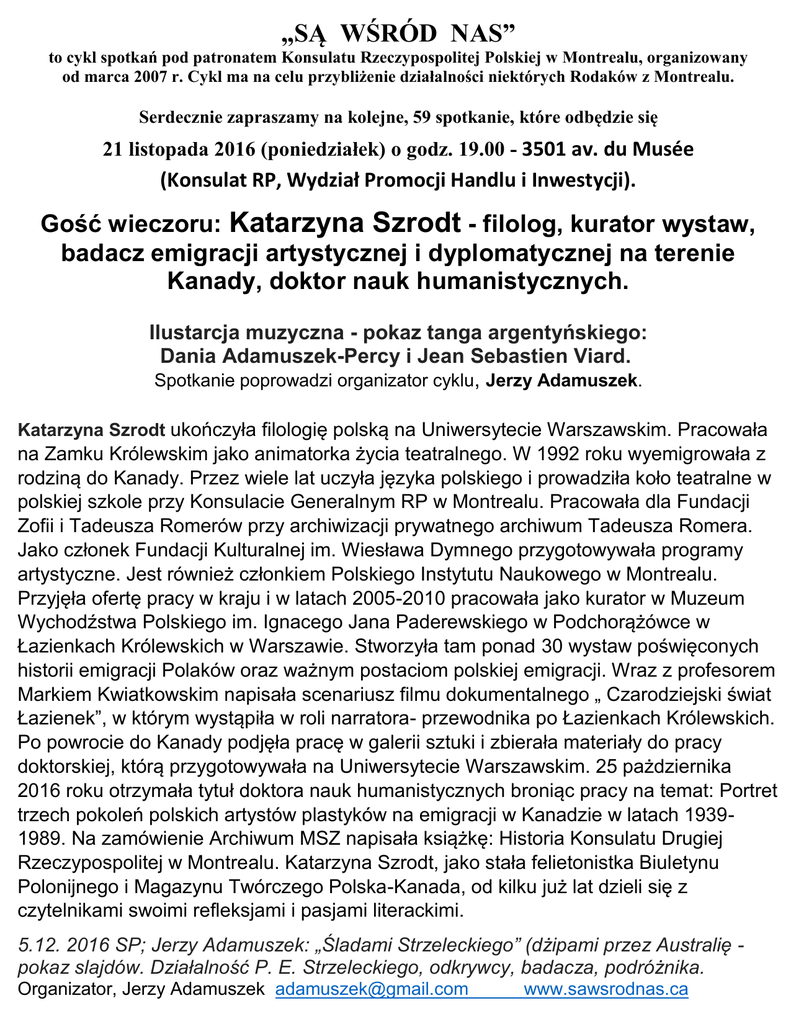 „SĄ WŚRÓD NAS” to cykl spotkań pod patronatem Konsulatu Rzeczypospolitej Polskiej w Montrealu, organizowany od marca 2007 r. Cykl ma na celu przybliżenie działalności niektórych Rodaków z Montrealu. Serdecznie zapraszamy na kolejne, 59 spotkanie, które odbędzie się 21 listopada 2016 (poniedziałek) o godz. 19.00 - 3501 av. du Musée (Konsulat RP, Wydział Promocji Handlu i Inwestycji). Gość wieczoru: Katarzyna Szrodt - filolog, kurator wystaw, badacz emigracji artystycznej i dyplomatycznej na terenie Kanady, doktor nauk humanistycznych. Ilustarcja muzyczna - pokaz tanga argentyńskiego: Dania Adamuszek-Percy i Jean Sebastien Viard. Spotkanie poprowadzi organizator cyklu, Jerzy Adamuszek. Katarzyna Szrodt ukończyła filologię polską na Uniwersytecie Warszawskim. Pracowała na Zamku Królewskim jako animatorka życia teatralnego. W 1992 roku wyemigrowała z rodziną do Kanady. Przez wiele lat uczyła języka polskiego i prowadziła koło teatralne w polskiej szkole przy Konsulacie Generalnym RP w Montrealu. Pracowała dla Fundacji Zofii i Tadeusza Romerów przy archiwizacji prywatnego archiwum Tadeusza Romera. Jako członek Fundacji Kulturalnej im. Wiesława Dymnego przygotowywała programy artystyczne. Jest również członkiem Polskiego Instytutu Naukowego w Montrealu. Przyjęła ofertę pracy w kraju i w latach 2005-2010 pracowała jako kurator w Muzeum Wychodźstwa Polskiego im. Ignacego Jana Paderewskiego w Podchorążówce w Łazienkach Królewskich w Warszawie. Stworzyła tam ponad 30 wystaw poświęconych historii emigracji Polaków oraz ważnym postaciom polskiej emigracji. Wraz z profesorem Markiem Kwiatkowskim napisała scenariusz filmu dokumentalnego „ Czarodziejski świat Łazienek”, w którym wystąpiła w roli narratora- przewodnika po Łazienkach Królewskich. Po powrocie do Kanady podjęła pracę w galerii sztuki i zbierała materiały do pracy doktorskiej, którą przygotowywała na Uniwersytecie Warszawskim. 25 pażdziernika 2016 roku otrzymała tytuł doktora nauk humanistycznych broniąc pracy na temat: Portret trzech pokoleń polskich artystów plastyków na emigracji w Kanadzie w latach 19391989. Na zamówienie Archiwum MSZ napisała książkę: Historia Konsulatu Drugiej Rzeczypospolitej w Montrealu. Katarzyna Szrodt, jako stała felietonistka Biuletynu Polonijnego i Magazynu Twórczego Polska-Kanada, od kilku już lat dzieli się z czytelnikami swoimi refleksjami i pasjami literackimi. 5.12. 2016 SP; Jerzy Adamuszek: „Śladami Strzeleckiego” (dżipami przez Australię pokaz slajdów. Działalność P. E. Strzeleckiego, odkrywcy, badacza, podróżnika. Organizator, Jerzy Adamuszek [email protected] www.sawsrodnas.ca