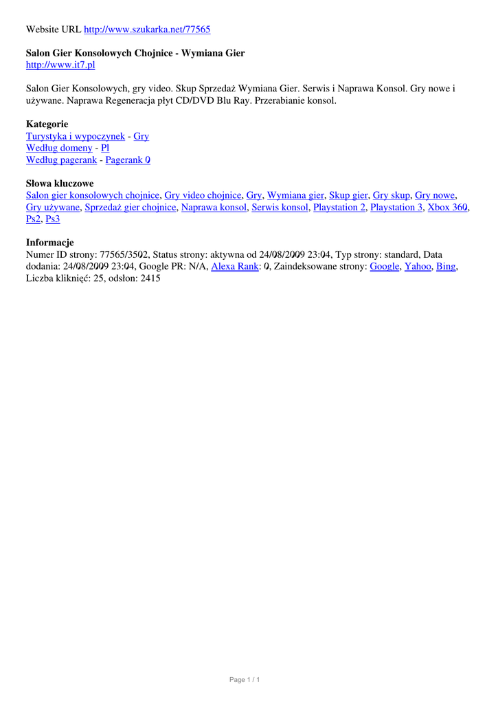 Website URL http://www.szukarka.net/77565 Salon Gier Konsolowych Chojnice - Wymiana Gier http://www.it7.pl Salon Gier Konsolowych, gry video. Skup Sprzedaż Wymiana Gier. Serwis i Naprawa Konsol. Gry nowe i używane. Naprawa Regeneracja płyt CD/DVD Blu Ray. Przerabianie konsol. Kategorie Turystyka i wypoczynek - Gry Według domeny - Pl Według pagerank - Pagerank 0 Słowa kluczowe Salon gier konsolowych chojnice, Gry video chojnice, Gry, Wymiana gier, Skup gier, Gry skup, Gry nowe, Gry używane, Sprzedaż gier chojnice, Naprawa konsol, Serwis konsol, Playstation 2, Playstation 3, Xbox 360, Ps2, Ps3 Informacje Numer ID strony: 77565/3502, Status strony: aktywna od 24/08/2009 23:04, Typ strony: standard, Data dodania: 24/08/2009 23:04, Google PR: N/A, Alexa Rank: 0, Zaindeksowane strony: Google, Yahoo, Bing, Liczba kliknięć: 25, odsłon: 2415 Page 1 / 1