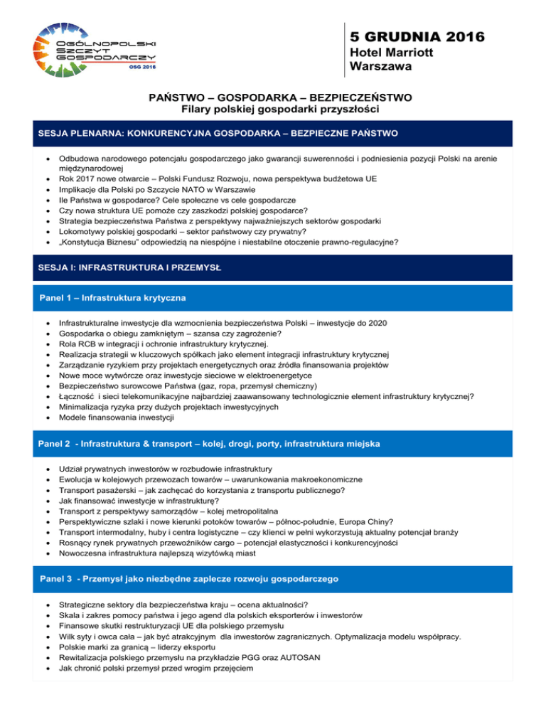 5 GRUDNIA 2016 Hotel Marriott Warszawa PAŃSTWO – GOSPODARKA – BEZPIECZEŃSTWO Filary polskiej gospodarki przyszłości SESJA PLENARNA: KONKURENCYJNA GOSPODARKA – BEZPIECZNE PAŃSTWO Odbudowa narodowego potencjału gospodarczego jako gwarancji suwerenności i podniesienia pozycji Polski na arenie międzynarodowej Rok 2017 nowe otwarcie – Polski Fundusz Rozwoju, nowa perspektywa budżetowa UE Implikacje dla Polski po Szczycie NATO w Warszawie Ile Państwa w gospodarce? Cele społeczne vs cele gospodarcze Czy nowa struktura UE pomoże czy zaszkodzi polskiej gospodarce? Strategia bezpieczeństwa Państwa z perspektywy najważniejszych sektorów gospodarki Lokomotywy polskiej gospodarki – sektor państwowy czy prywatny? „Konstytucja Biznesu” odpowiedzią na niespójne i niestabilne otoczenie prawno-regulacyjne? SESJA I: INFRASTRUKTURA I PRZEMYSŁ Panel 1 – Infrastruktura krytyczna Infrastrukturalne inwestycje dla wzmocnienia bezpieczeństwa Polski – inwestycje do 2020 Gospodarka o obiegu zamkniętym – szansa czy zagrożenie? Rola RCB w integracji i ochronie infrastruktury krytycznej. Realizacja strategii w kluczowych spółkach jako element integracji infrastruktury krytycznej Zarządzanie ryzykiem przy projektach energetycznych oraz źródła finansowania projektów Nowe moce wytwórcze oraz inwestycje sieciowe w elektroenergetyce Bezpieczeństwo surowcowe Państwa (gaz, ropa, przemysł chemiczny) Łączność i sieci telekomunikacyjne najbardziej zaawansowany technologicznie element infrastruktury krytycznej? Minimalizacja ryzyka przy dużych projektach inwestycyjnych Modele finansowania inwestycji Panel 2 - Infrastruktura & transport – kolej, drogi, porty, infrastruktura miejska Udział prywatnych inwestorów w rozbudowie infrastruktury Ewolucja w kolejowych przewozach towarów – uwarunkowania makroekonomiczne Transport pasażerski – jak zachęcać do korzystania z transportu publicznego? Jak finansować inwestycje w infrastrukturę? Transport z perspektywy samorządów – kolej metropolitalna Perspektywiczne szlaki i nowe kierunki potoków towarów – północ-południe, Europa Chiny? Transport intermodalny, huby i centra logistyczne – czy klienci w pełni wykorzystują aktualny potencjał branży Rosnący rynek prywatnych przewoźników cargo – potencjał elastyczności i konkurencyjności Nowoczesna infrastruktura najlepszą wizytówką miast Panel 3 - Przemysł jako niezbędne zaplecze rozwoju gospodarczego Strategiczne sektory dla bezpieczeństwa kraju – ocena aktualności? Skala i zakres pomocy państwa i jego agend dla polskich eksporterów i inwestorów Finansowe skutki restrukturyzacji UE dla polskiego przemysłu Wilk syty i owca cała – jak być atrakcyjnym dla inwestorów zagranicznych. Optymalizacja modelu współpracy. Polskie marki za granicą – liderzy eksportu Rewitalizacja polskiego przemysłu na przykładzie PGG oraz AUTOSAN Jak chronić polski przemysł przed wrogim przejęciem Przemysł metalurgiczny i metali kolorowych – ekspansja i konkurencja na rynkach światowych Polska węglem stoi? Panel 4 – Infrastruktura samorządowa: Smart city Efektywność energetyczna; Transport publiczny: inteligentne systemy zarządzania ruchem Inteligentny dom; Paliwa przyszłości; Przyjazna administracja: e-administracja na szczeblu samorządowym Rola bezpieczeństwa i polityka prywatności w projektach smart city Smart lighting Technologie IT w projektach infrastrukturalnych SESJA II: INNOWACYJNE FIRMY I ROZWIĄZANIA Panel 1 – Najlepsze praktyki – Liderzy zmian Ewolucja czy rewolucja? Kapitał na badania i rozwój – od pomysłu do produktu Budowanie Marki – inwestycje w świadomość klienta Świat to za mało- jak przekraczać granice w poszukiwaniu rynków w dobie Internetu? Informatyzacja to nie wszystko: Produkty 21: forma a nie trwałość? - dlaczego klient tęskni za dawną jakością i prostotą urządzeń? Klient na rynku nowoczesnych technologii. Program Witelo Panel 2 - Prezentacje innowacyjnych technologii i rozwiązań w przemyśle – case studies Panel 3 – Innowacyjność w projektach naukowo-przemysłowych Rola samorządów i szkolnictwa wyższego Komercjalizacja prac B+R Od pomysłu do produktu – bariery w rozwoju projektów B+R: kontrole projektów, podatki, przepisy SESJA III: BEZPIECZEŃSTWO NARODOWE I GOSPODARCZE Panel 1 – AGROSEC: Bezpieczeństwo sektora rolno-spożywczego Branża rolno-spożywcza 27 lat po przemianach ustrojowych w Polsce – wykorzystane szanse, niespełnione nadzieje. Wpływ członkostwa Polski w Unii Europejskiej na kondycję branży rolno-spożywczej – czy przyszłość branży zależy nadal od rynku unijnego? o Unia Europejska to już za mało – konieczność dywersyfikacji eksportu. o Odradzający się protekcjonizm w UE, zagrożenie dla polskiej ekspansji na rynkach wspólnotowych. Polski eksport rolno-spożywczy od wprowadzenia embarga przez Rosję. Polskie firmy w roli liderów w Europie Środkowo – Wschodniej – na ile polskie spółki są stanie konsolidować rynek w regionie, a na ile skazane na połknięcie przez globalne koncerny. Nowe regulacje a przyszłość branży – podatek obrotowy, eliminacja nieuczciwych praktyk przez sieci Czy sektor rolno-spożywczy potrzebuje większego wsparcia rządu – znacznie branży dla realizacji Planu na rzecz Odpowiedzialnego Rozwoju. Niebezpieczeństwo anonimowości polskiej żywności zagranicą – promocja polskiej marki. Przemysł mięsny – drób czy wieprzowina, redefinicja priorytetów o Porozumienie TTiP – co to oznacza dla przyszłości branży – szanse i zagrożenia Panel 2 – ECONSEC – Bezpieczeństwo narodowe Kształtowanie polityki bezpieczeństwa państwa w aktualnej sytuacji międzynarodowej Czy Polska jest krajem bezpiecznym – priorytetowe obszary bezpieczeństwa narodowego Polityka unijna a polska racja stanu, ocena wpływu na bezpieczeństwo ze względu na członkostwo w UE Polityka międzynarodowa, e