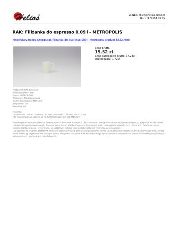 e-mail: [email protected] tel. : (17) 854 91 85 RAK: Filiżanka do espresso 0,09 l - METROPOLIS http://stary.helios-szklo.pl/rak-filizanka-do-espresso-009-l--metropolis-produkt-5322.html Cena brutto: 15.52 zł Cena katalogowa brutto: 17.24 zł Oszczędzasz: 1,72 zł Producent: RAK Porcelain Kolor porcelany: ecru Fason: METROPOLIS Zdobienie: Niedekorowana Numer katalogowy: MECU09 Zmywarka: tak Mikrofala: tak Filiżanka: - pojemność – 90 ml, średnica – 54 mm, wysokość – 75 mm, ilość – 1 szt. *do filiżanki pasuje spodek 13 cm RAK/Metropolis (nr kat. MESA13) Wysokogatunkowa porcelana ze Zjednoczonych Emiratów Arabskich „RAK Porcelain” swoją formą i ponadczasową elegancją, zaspokoi każde nawet najbardziej wyrafinowane gusta. Szeroka gama form i gładkość glazury doceniło już wielu managerów największych restauracji i hoteli na całym świecie. Bardzo mocna i wytrzymała, w subtelnym kolorze ecru ozdobi każdy stół (nie tylko w restauracji). Ze względu na trwałość oferta RAK Porcelain jest skierowana głównie do gastronomii, mimo to ze delikatne kształty i subtelna barwa sprawia, że bez obaw można ją użytkować we własnym domu. Wszystkie naczynia RAK Porcelain mogą być używane w zmywarkach, piecach konwekcyjno-parowych, salamandrach i kuchenkach mikrofalowych.