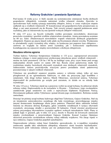 Reformy Grakchów i powstanie Spartakusa Pod koniec II wieku p.n.e. w Italii zaczęła się systematycznie zmniejszać liczba drobnych gospodarstw chłopskich, wzrastała natomiast wielka własność ziemska. Zjawisko to spowodowane było trudną sytuacją materialną chłopów, którzy w coraz większym stopniu zadłużali się u wielkich właścicieli. W konsekwencji ich gospodarstwa były przejmowane za długi, a oni sami przenosili się do Rzymu. Taki rozwój sytuacji zagrażał podstawom armii rzymskiej, jako że rekrutowała się ona spośród wolnych chłopów-właścicieli. W roku 137 p.n.e. na Sycylii wybuchło wielkie powstanie niewolników, skierowane przeciwko rzymskim i greckim wielkim właścicielom ziemskim. Armię powstańczą oceniano na 60 tys. ludzi. Zbuntowanych niewolników wsparli właściciele drobnych gospodarstw chłopskich. Dopiero po pięciu latach walk udało się Rzymianom stłumić rewoltę. Wydarzenia te uświadomiły części rzymskiej elity władzy, że konieczna jest poprawa losu chłopstwa – zarówno ze względu na interes armii rzymskiej, jak i konieczność zapobieżenia kształtującemu się sojuszowi między niewolnikami a drobnym chłopstwem. Nieudana reforma agrarna Trybun ludowy Tyberiusz Semproniusz Grakchus w 133 p.n.e. zaproponował utworzenie funduszu rolnego z ziemi państwowej użytkowanej dotychczas przez wielkich właścicieli – można im było pozostawić 120 ha i 60 ha na każdego syna, przy czym brano pod uwagę maksymalnie dwóch synów (w sumie 240 ha). Reszta ziemi państwowej miała być rozdzielona między bezrolnych obywateli rzymskich oraz drobnych właścicieli ziemskich. Jednocześnie ustawa przewidywała wieczyste prawo posiadania ziemi państwowej pozostawionej w rękach wielkich właścicieli. Tyberiusz nie przedłożył senatowi projektu ustawy o reformie rolnej, tylko od razu przegłosował ją na zgromadzeniu ludowym, co stało się przyczyną jego konfliktu z senatorami. Gdy drugi trybun ludowy, Marek Oktawiusz, zawetował ustawę, Tyberiusz doprowadził do pozbawienia go urzędu pod zarzutem, że działa on na szkodę ludu rzymskiego. W roku 132 p.n.e. Tyberiusz starał się o ponowny wybór na urząd trybuna, by pilnować dzieła reformy rolnej. Doprowadziło to do rozruchów w Rzymie – Tyberiusza i jego zwolenników zaatakowała grupa senatorów na czele z najwyższym kapłanem Scypionem Nasicą. Drewnianymi pałkami zabito Tyberiusza i ponad dwustu jego zwolenników. Reforma została zaniechana. Dziesięć lat później urząd trybuna ludowego objął brat Tyberiusza, Gajusz Grakchus. Stał się on inicjatorem ustawodawstwa socjalnego dla ludu rzymskiego, przewidującego między innymi dostarczanie bezpłatnego zboża przez państwo. Planował także założenie kolonii Junonia na obszarze dawnej Kartaginy, gdzie zostałoby osiedlonych 6 tysięcy obywateli rzymskich, otrzymując działki o powierzchni 50 hektarów. Chciał również przeforsować ustawę przyznającą obywatelstwo rzymskie ogółowi wolnych mieszkańców Italii. Plany te jednak legły w gruzach, gdy w roku 121 p.n.e. doszło w Rzymie do krwawych zamieszek między zwolennikami a przeciwnikami Gajusza Grakcha. Konsul Lucjusz Opimiusz skierował przeciwko zwolennikom reformy rolnej oddziały wojskowe. Nie chcąc wpaść w ręce żołnierzy, Gajusz Grakchus popełnił samobójstwo. Niepowodzenie reformy rolnej braci Grakchów spowodowało, że w republice rzymskiej ostatecznie upadła idea odrodzenia chłopskiej własności ziemi kosztem latyfundystów. Ponownych prób wdrożenia reformy już nie podejmowano. Niemożliwe więc stało się utrzymywanie armii rzymskiej z poboru, składającej się w zdecydowanej większości z właścicieli samodzielnych gospodarstw chłopskich. Ugrupowania polityczne w Rzymie W II wieku p.n.e. ukształtowały się w Rzymie dwa ostro rywalizujące ze sobą ugrupowania polityczne. Pierwszym z nich byli popularzy (od populus – lud), zwolennicy reform społecznych oraz zwiększenia uprawnień zgromadzeń kosztem senatu. Mieli oni poparcie wśród średnich i niższych warstw społeczeństwa rzymskiego oraz wśród mieszkańców prowincji. Drugim ugrupowaniem byli optymaci (od optimus – najlepszy), zwolennicy republiki arystokratycznej i dominującej roli senatu. Cieszyli się oni poparciem rzymskiej nobilitas. Reforma wojskowa Przywódcą popularów był Gajusz Mariusz, który od roku 107 p.n.e. przez sześć lat (z roczną przerwą) sprawował urząd konsula. Jego trwałą zasługą stało się przeprowadzenie reformy armii rzymskiej. Niepowodzenie reformy rolnej powodowało bowiem coraz większy niedostatek chłopskiego rekruta wobec zanikania własności chłopskiej. Zamiast chłopskiej armii z poboru Gajusz Mariusz utworzył armię zawodową, której żołnierze otrzymywali od państwa żołd i pełny ekwipunek. W armii tej służyli głównie ochotnicy-proletariusze. Okres służby trwał minimum szesnaście lat. Legion, liczący w założeniach ok. 6200 żołnierzy, stał się całkowicie jednolitą jednostką ciężkiej piechoty. W efekcie tej reformy nastąpiły zmiany w taktyce armii rzymskiej. Jej podstawową jednostką taktyczną stała się kohorta, złożona z trzech manipułów (czyli sześciu centurii). Legion składał się z dziesięciu kohort, zdolnych do wykonywania samodzielnych zadań. Reforma Gajusza Mariusza przyniosła jednak także ujemne skutki: żołnierzom nie zapewniono żadnego zabezpieczenia na starość, co skłaniało ich do gromadzenia majątku metodą grabieży. Ponadto stała armia (w odróżnieniu od poprzedniej obywatelskiej armii z poboru, zwoływanej tylko na okres kampanii wojennych) coraz częściej była wykorzystywana przez swych wodzów do celów politycznych. Dyktatura Sulli Lucjusz Korneliusz Sulla, przywódca stronnictwa optymatów, uzyskał w roku 88 p.n.e. decyzją senatu dowództwo w wojnie z królem Pontu Mitrydatesem VI i namiestnictwo Azji. Przeciwko tej decyzji
