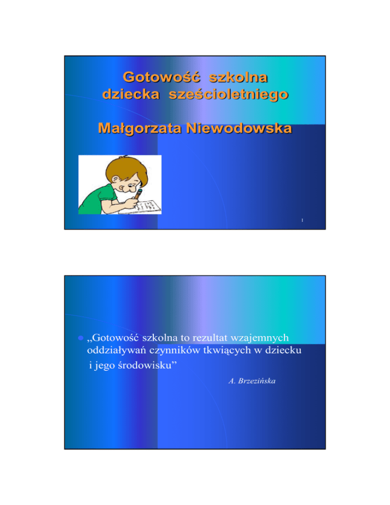 2012-02-14 Gotowość szkolna dziecka sześcioletniego Małgorzata Niewodowska 1 „Gotowość szkolna to rezultat wzajemnych oddziaływań czynników tkwiących w dziecku i jego środowisku” A. Brzezińska 1 2012-02-14 Rozpoczęcie nauki szkolnej jest ważnym momentem w życiu każdego dziecka. To jak jest przygotowane do tego wyzwania w znacznym stopniu decyduje o przebiegu i wynikach nauki w szkole, a w odległej perspektywie, o jakości jego życia. 3 Do tej pory sześciolatek idący do szkoły musiał spełniać wymagania właściwe dla rozwoju siedmiolatka. Obecnie program nauczania w klasie pierwszej jest dostosowany do poziomu dziecka sześcioletniego. 4 2 2012-02-14 Gotowość szkolna Gotowość szkolna to inaczej stopień rozwoju dziecka niezbędny do podjęcia obowiązków związanych z rozpoczęciem nauki w szkole. To zespół tych cech psychofizycznych ukształtowanych w okresie pierwszych 6 lat życia, które umożliwiają dziecku przystosowanie się do nauki w szkole. Dojrzałym do podjęcia nauki szkolnej jest dziecko, o takim stopniu rozwoju, który umożliwi mu naukę czytania, pisania i liczenia, przystosowanie się do wymagań szkoły, zgodne współżycie z grupą rówieśniczą. 5 Gotowość do podjęcia nauki w szkole uzależniona jest od wielu czynników, m.in. 1. 2. 3. Czynniki indywidualne związane z osobą dziecka: Stan zdrowia, Płeć, Właściwości psychiczne. Czynniki zewnętrzne związane rodziną: Warunki materialne, Warunki kulturalne, Warunki społeczne. Czynniki zewnętrzne związane ze środowiskiem: Udział w zorganizowanych zajęciach przedszkolnych. 6 3 2012-02-14 Czynniki indywidualne Badania gotowości szkolnej sześciolatków przeprowadzone w 2008 r. wykazały, że istotnym czynnikiem różnicującym osiąganie gotowości szkolnej przez dzieci był stan zdrowia. Wpływ tego czynnika zaznaczył się najwyraźniej w grupie dziewczynek. Istotne różnice w wynikach uzyskano również przy porównaniu badanych sześciolatków za względu na płeć. Wyższe wyniki uzyskano w grupie dziewczynek. Spośród właściwości psychicznych wpływających na osiąganie przez dzieci dojrzałości szkolnej wymieniane są : cechy pamięci, poziom rozwoju percepcji wzrokowej, sprawność myślenia, poziom wypowiedzi słownych, sprawność operowania słownictwem. Jako istotne determinanty osiągania przez dzieci dojrzałości szkolnej wymieniane są również zainteresowania dziecka. 7 Środowisko rodzinne Oprócz warunków materialnych czynnikami, które najbardziej różnicowały osiąganie przez dzieci gotowości szkolnej okazały się: Warunki kulturalne rodzin takie jak: wykształcenie rodziców, dysponowanie biblioteką, czytanie dzieciom książek, chodzenie z dziećmi do teatru, udział w zorganizowanych zajęciach, itp. Spośród warunków społecznych na osiąganie dojrzałości szkolnej dzieci wpływ mają: organizacja życia rodziny, stosowany w rodzinie system kar i nagród, system i struktura komunikowania się w rodzinie. 8 4 2012-02-14 Wymagania stawiane dziecku, które ma rozpocząć naukę szkolną dotyczą głównie: Rozwoju fizycznego, Rozwoju ruchowego, Rozwoju poznawczego, Rozwoju emocjonalnego, Rozwoju społecznego, Rozwoju mowy, Przygotowania do czytania, pisania i liczenia. 9 Właściwości rozwojowe i kompetencje jakie powinno posiadać dziecko rozpoczynające naukę Dziecko jest ogólnie zdrowe Rozwój fizyczny Jego wzrost i waga są odpowiednie do wieku Jest odporne na zmęczenie Prawidłowo funkcjonują narządy zmysłów, głównie wzrok i słuch 10 5 2012-02-14 Jest sprawne ruchowo: biega, skacze, jeździ na rowerze Chętnie bawi się klockami, odtwarza konstrukcje według wzoru Rozwój ruchowy Potrafi w sposób celowy posługiwać się przedmiotami i narzędziami, np. wycina nożyczkami, wiąże sznurowadła, kokardki, zapina guziki Samodzielnie wykonuje podstawowe czynności samoobsługowe : je, ubiera się, dba o higienę Uzyskało podstawową orientację w schemacie własnego ciała, potrafi różnicować prawą i lewą stronę Najczęściej wykonuje czynności jedną, tą samą ręką (uformowała się dominacja czynnościowa ręki) 11 Dziecko jest spostrzegawcze, zauważa istotne elementy przedmiotów, wskazuje braki w obrazkach Ma zasób wiadomości umożliwiający orientację w najbliższym otoczeniu, potrafi np. podać swoje imię, nazwisko, wiek, adres zamieszkania Rozumie podstawowe pojęcia abstrakcyjne (kształt, wielkość, kierunek, odległość) Zaczyna rozumieć znaczenie symboli Rozwój poznawczy Jest dociekliwe, aktywne poznawczo, poszukuje odpowiedzi na intrygujące je pytania Formułuje proste wnioski dotyczące zaobserwowanych zjawisk Dostrzega następstwo zdarzeń Zapamiętuje krótkie wierszyki, piosenki, aktywnie przypomina sobie informacje użyteczne w konkretnym działaniu Potrafi przez dłuższą chwilę skupić uwagę na wykonywanej czynności 12 6 2012-02-14 Dziecko potrafi rozpoznawać uczucia innych, jest coraz bardziej świadome własnych uczuć Rozwój emocjonalny Stopniowo opanowuje społeczne reguły wyrażania emocji Pojawiają się próby kontroli własnych emocji 13 Nawiązuje kontakty społeczne z rówieśnikami i z osobami dorosłymi Współdziała z rówieśnikami w grupie, potrafi wyczekać na swoją kolej, dzieli się zabawkami Przebywanie z rówieśnikami i wspólna aktywność sprawiają mu przyjemność Rozwój społeczny Dostosowuje swoje zachowanie do obowiązujących reguł np. podporządkowuje się regułom zabawy, pełni role Rozumie znaczenie podstawowych norm i łatwych przepisów, dostosowuje się do nakazów i zakazów Słucha poleceń osoby dorosłej, w tym nauczyciela Zaczyna przejawiać poczucie obowiązku 14 7 2012-02-14 Wymowa pod względem artykulacyjnym doskonali się Dziecko wymawia głoski sz, ż, cz, dż, r Nieprawidłowości gramatyczne zanikają Rozwój mowy Dziecko dokonuje autokorekty Wypowiedzi przyjmują formę realizacji wielozdaniowej W wypowiedziach uwzgl