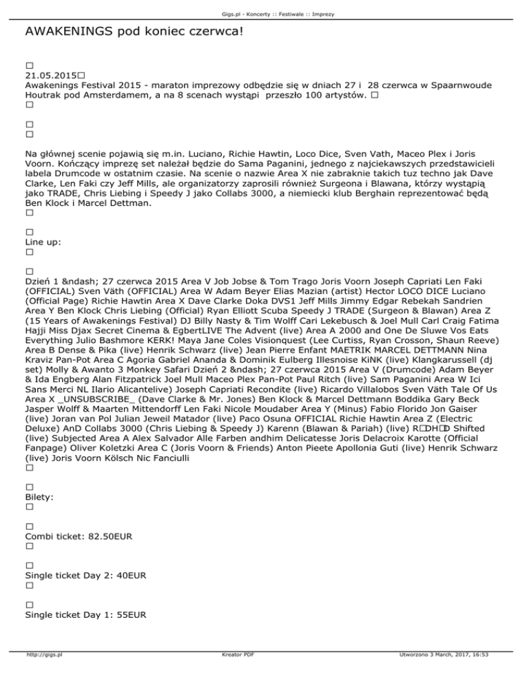 Gigs.pl - Koncerty :: Festiwale :: Imprezy AWAKENINGS pod koniec czerwca! 21.05.2015 Awakenings Festival 2015 - maraton imprezowy odbędzie się w dniach 27 i 28 czerwca w Spaarnwoude Houtrak pod Amsterdamem, a na 8 scenach wystąpi przeszło 100 artystów. Na głównej scenie pojawią się m.in. Luciano, Richie Hawtin, Loco Dice, Sven Vath, Maceo Plex i Joris Voorn. Kończący imprezę set należał będzie do Sama Paganini, jednego z najciekawszych przedstawicieli labela Drumcode w ostatnim czasie. Na scenie o nazwie Area X nie zabraknie takich tuz techno jak Dave Clarke, Len Faki czy Jeff Mills, ale organizatorzy zaprosili również Surgeona i Blawana, którzy wystąpią jako TRADE, Chris Liebing i Speedy J jako Collabs 3000, a niemiecki klub Berghain reprezentować będą Ben Klock i Marcel Dettman. Line up: Dzień 1 – 27 czerwca 2015 Area V Job Jobse & Tom Trago Joris Voorn Joseph Capriati Len Faki (OFFICIAL) Sven Väth (OFFICIAL) Area W Adam Beyer Elias Mazian (artist) Hector LOCO DICE Luciano (Official Page) Richie Hawtin Area X Dave Clarke Doka DVS1 Jeff Mills Jimmy Edgar Rebekah Sandrien Area Y Ben Klock Chris Liebing (Official) Ryan Elliott Scuba Speedy J TRADE (Surgeon & Blawan) Area Z (15 Years of Awakenings Festival) DJ Billy Nasty & Tim Wolff Cari Lekebusch & Joel Mull Carl Craig Fatima Hajji Miss Djax Secret Cinema & EgbertLIVE The Advent (live) Area A 2000 and One De Sluwe Vos Eats Everything Julio Bashmore KERK! Maya Jane Coles Visionquest (Lee Curtiss, Ryan Crosson, Shaun Reeve) Area B Dense & Pika (live) Henrik Schwarz (live) Jean Pierre Enfant MAETRIK MARCEL DETTMANN Nina Kraviz Pan-Pot Area C Agoria Gabriel Ananda & Dominik Eulberg Illesnoise KiNK (live) Klangkarussell (dj set) Molly & Awanto 3 Monkey Safari Dzień 2 – 27 czerwca 2015 Area V (Drumcode) Adam Beyer & Ida Engberg Alan Fitzpatrick Joel Mull Maceo Plex Pan-Pot Paul Ritch (live) Sam Paganini Area W Ici Sans Merci NL Ilario Alicantelive) Joseph Capriati Recondite (live) Ricardo Villalobos Sven Väth Tale Of Us Area X _UNSUBSCRIBE_ (Dave Clarke & Mr. Jones) Ben Klock & Marcel Dettmann Boddika Gary Beck Jasper Wolff & Maarten Mittendorff Len Faki Nicole Moudaber Area Y (Minus) Fabio Florido Jon Gaiser (live) Joran van Pol Julian Jeweil Matador (live) Paco Osuna OFFICIAL Richie Hawtin Area Z (Electric Deluxe) AnD Collabs 3000 (Chris Liebing & Speedy J) Karenn (Blawan & Pariah) (live) RØDHÅD Shifted (live) Subjected Area A Alex Salvador Alle Farben andhim Delicatesse Joris Delacroix Karotte (Official Fanpage) Oliver Koletzki Area C (Joris Voorn & Friends) Anton Pieete Apollonia Guti (live) Henrik Schwarz (live) Joris Voorn Kölsch Nic Fanciulli Bilety: Combi ticket: 82.50EUR Single ticket Day 2: 40EUR Single ticket Day 1: 55EUR http://gigs.pl Kreator PDF Utworzono 3 March, 2017, 16:53