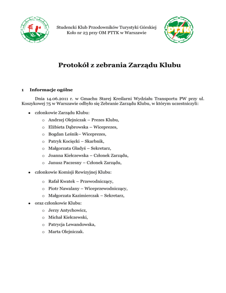 Studencki Klub Przodowników Turystyki Górskiej Koło nr 23 przy OM PTTK w Warszawie Protokół z zebrania Zarządu Klubu 1 Informacje ogólne Dnia 14.06.2011 r. w Gmachu Starej Kreślarni Wydziału Transportu PW przy ul. Koszykowej 75 w Warszawie odbyło się Zebranie Zarządu Klubu, w którym uczestniczyli: członkowie Zarządu Klubu: o Andrzej Olejniczak – Prezes Klubu, o Elżbieta Dąbrowska – Wiceprezes, o Bogdan Leśnik– Wiceprezes, o Patryk Kocięcki – Skarbnik, o Małgorzata Gładyś – Sekretarz, o Joanna Kiełczewska – Członek Zarządu, o Janusz Paczesny – Członek Zarządu, członkowie Komisji Rewizyjnej Klubu: o Rafał Kwatek – Przewodniczący, o Piotr Nawalany – Wiceprzewodniczący, o Małgorzata Kazimierczak – Sekretarz, oraz członkowie Klubu: o Jerzy Antychowicz, o Michał Kiełczewski, o Patrycja Lewandowska, o Marta Olejniczak. Protokół z zebrania Zarządu Klubu 2 14.06.2011 r. Przebieg Zebrania: 1. Podział obowiązków pomiędzy członkami Zarządu Klubu 2. Przyjęcie nowych osób w poczet członków SKPTG 3. Utworzenie kalendarza imprez na rok akademicki 2011/2012 2.1 Podział obowiązków pomiędzy członkami Zarządu Klubu Zarząd Klubu stosunkiem głosów 7 za, 0 wstrzymujących, 0 przeciw przyjął uchwałę 2/2011 ustalającą podział obowiązków pomiędzy członkami Zarządu Klubu. 2.2 Przyjęcie nowych osób w poczet członków Klubu Zarząd Klubu stosunkiem głosów 7 za, 0 wstrzymujących, 0 przeciw przyjął uchwałę 3/2011 przyjmującą nowych członków SKPTG. 2.3 Ustalenie Kalendarza imprez na rok akademicki 2011/2012 Zarząd Klubu ustalił następujący wstępny kalendarz imprez na rok akademicki 2011/2012, który w ciągu roku akademickiego będzie podlegał uzupełnieniu / modyfikacjom: 1-2.10.2011 r., III Rajd na dobry początek, organizator: Joanna Kiełczewska, 4.10.2011 r. otwarty pokaz zdjęć podsumowujący Akcję Lato, organizator: Elżbieta Dąbrowska, 22-23.10.2011 r., wyjazd inauguracyjny kursu OT, organizator: Patryk Kocięcki, 11-13.11.2011 r., wyjazd listopadowy, organizator: Rafał Kwatek, 26-27.11.2011 r., impreza z okazji 10-lecia SKPTG, organizator: Bogdan Leśnik, 10-12.12.2011 r., wyjazd klubowy, organizator: vacat, 21.12.2011 r., wigilia klubowa, organizator: vacat, 27.12-1.01.2012 r., Sylwester Klubowy, organizator: vacat, 6-8.06.2012 r., wyjazd rakietowy na Trzech Króli, organizator: Patrycja Lewandowska, jeden dzień w weekend styczeń lub luty, wyjazd na biegówki, organizator: Andrzej Olejniczak, weekend pod koniec lutego, wjazd zimowy w Tatry, organizator: Andrzej Olejniczak, SKPTG Koło nr 23 przy OM PTTK w Warszawie 2 Protokół z zebrania Zarządu Klubu 14.06.2011 r. 17-18.03.2012 r., wyjazd wiosenny przyrodniczy, organizator: Małgorzata Kazimierczak, 3.04.2012 r., Jajeczko Klubowe, organizator: vacat, 21-22.04.2012 r., wyjazd kolarski, organizator: Marta Olejniczak, 28.04-6.05.2012 r. Majówka Klubowa, organizator: Małgorzata Gładyś, koniec maja, Walne SKPTG, organizator: Zarząd Klubu, 7-10.06.2012 r. Rajd na Boże Ciało, organizator: vacat. 3 Ustalenie terminu następnego zebrania Zarząd Klubu ustalił termin kolejnego Zebrania na 21.06.2011 r. 4 Załączniki uchwała 2/2011 ustalająca podział obowiązków pomiędzy członkami Zarządu Klubu, uchwała 3/2011 przyjmująca nowe osoby w poczet członków SKPTG Prezes Sekretarz SKPTG Koła nr 23 przy OM PTTK w Warszawie SKPTG Koła nr 23 przy OM PTTK w Warszawie Andrzej Olejniczak SKPTG Koło nr 23 przy OM PTTK w Warszawie Małgorzata Gładyś 3