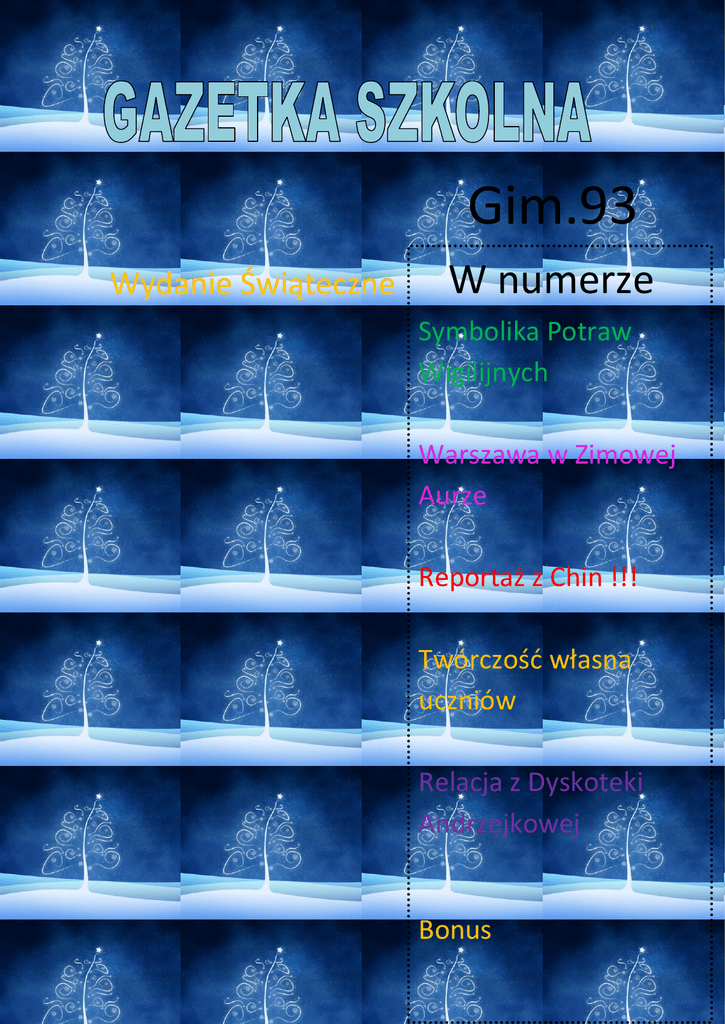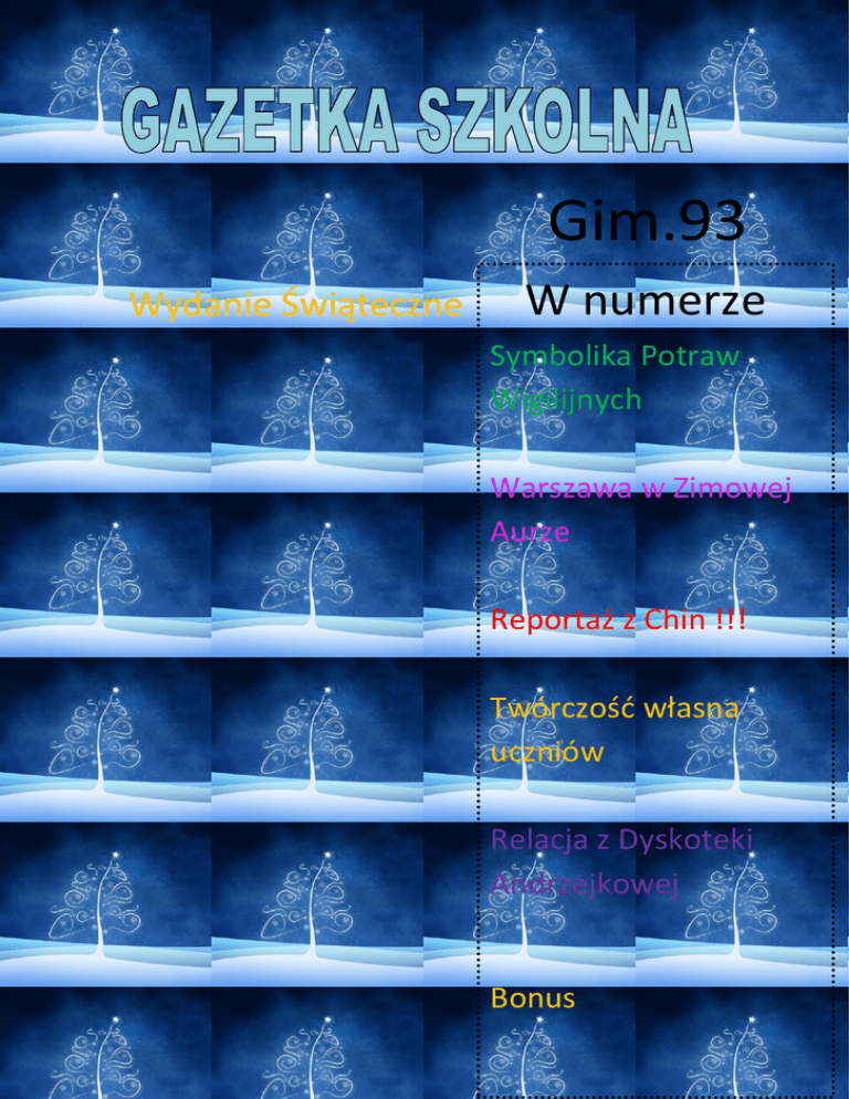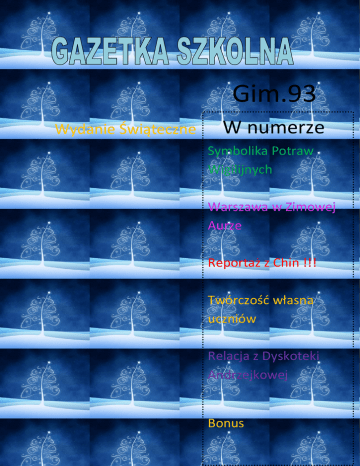 Gim.93 Wydanie Świąteczne W numerze Symbolika Potraw Wigilijnych Warszawa w Zimowej Aurze Reportaż z Chin !!! Twórczość własna uczniów Relacja z Dyskoteki Andrzejkowej Bonus Symbolika Potraw Wigilijnych Dlaczego akurat dwanaście potraw powinno znaleźć się na stole podczas tradycyjnej Wigilii? Według tradycji chrześcijańskich symbolizowały dwunastu apostołów. Z kolei według wierzeń ludowych nawiązywały do liczby miesięcy w roku. Co powinno więc znaleźć się na wigilijnym stole…? KOMPOT Z SUSZU Owoce w niemal każdej kulturze kojarzone są z płodnością i witalnością. Poszczególnym rodzajom owoców przypisywane są rozmaite cechy: jabłka zapewniają miłość, zdrowie i pokój, gruszki gwarantują długowieczność, a suszone śliwki odpędzają złe moce. BARSZCZ CZERWONY Nasi przodkowie wierzyli, że buraki zapewniają długowieczność i urodę. Dzięki nim świąteczny barszczyk zachwyca pięknym kolorem, jednocześnie są bardzo zdrowym dodatkiem. KAPUSTA Z GROCHEM Kapustę dawniej przede wszystkim kiszono na zimę, dlatego też naszym przodkom kojarzyła się z dostatkiem, trwałością sił życiowych i ogromną życiodajną mocą sprawiającą, że przyroda budziła się do życia na wiosnę. SAŁATKA JARZYNOWA Tutaj raczej trudno doszukiwać się symboliki. Sałatka jest po prostu popularną przekąską. KARP Zdecydowanie najważniejszą potrawą na wigilijnym stole jest ryba. Przypisuje jej się znaczenie religijne, symbolizuje bowiem Chrystusa i odradzanie się życia. Tego wieczoru najczęściej jemy karpia, który jest typowo "świąteczną" rybą. ŚLEDZIE Jeden gatunek ryb w czasie wigilijnej wieczerzy to za mało. Dlatego na stole nie powinno zabraknąć również śledzi, które są symbolem postu i wyczekiwania. CHLEB Nie można o nim zapomnieć pośród wigilijnych przysmaków. Chleb symbolizuje dobrobyt i początek nowego życia. Jego obecność na wigilijnym stole ma zapewnić pomyślność w nadchodzącym roku. MAKOWIEC Ziarna maku są symbolem dostatku i płodności, były także symbolem nieśmiertelności. Mak ma zwiastować spokojny sen i odrodzenie, a także łączność z zaświatami. ZUPA GRZYBOWA Grzyby mają bogatą symbolikę. Nasi przodkowie kojarzyli je ze zdrowiem i siłami witalnymi. KUTIA Miód ma symbolizować wszystko co najlepsze, zapewnić radość i dostatek, szczęście oraz miłość. Orzechy natomiast miały chronić przed wypadaniem i psuciem się zębów PIERNIK To kolejna potrawa z wigilijnego stołu. Twarde ciemnobrązowe ciasto pachnące miodem, przyprawami korzennymi i wszelakimi bakaliami, było dla naszych przodków symbolem dobrobytu i wysokiego statusu społecznego. PIEROGI Z KAPUSTĄ I GRZYBAMI Dawniej wierzono, że kapusta ma życiodajną moc. Podobnym symbolem są grzyby, one również mają zapewnić szczęście. Julia Sokołowska,2b 6 grudnia spadł długo wyczekiwany przez warszawiaków śnieg. To chyba prezent na Mikołajki. Silny wiatr zwany Ksawerym, nie zniechęcił ludzi do rozkoszowania się atmosferą świąteczną, która panowała na Nowym Świecie. Mieszkańcy Warszawy spacerowali po pięknie udekorowanej Starówce, na której już pojawiły się ozdoby świąteczne. Można podziwiać wielką choinkę, lampki i inne niesamowite dekoracje, które przypominają nam o zbliżającym się wydarzeniu. Agnieszka Barciak i Aleksandra Kubiczek ,2d Chiny Moimi Oczami w Maju 2013 Dzień Pierwszy i Drugi O GODZINIE 6 RANO ZOSTALIŚMY ODEBRANI PRZEZ MAMĘ Z NAJNOWOCZEŚNIEJSZ EGO LOTNISKA CHIN PUDONG MAMA POKAZUJE NAM STARY ZABYTKOWY SZANGHAJ .W TLE WIDAĆ McDONALD`S , A ZANIM ZABYTKOWE CHINSKIE DACHY KRÓTKI ODPOCZYNEK W OGRODACH CESARSKICH WYSPA PUDONG TO NAJNOWACZEŚNIEJSZA CZĘŚĆ SZANGHAJU. ZNAJDUJE SIĘ NA NIEJ SYMBOL SZANGHAJU -PERŁA ORIENTU . NOCĄ PO RZECE HUANGPU KURSUJĄ WYCIECZKOWE STATKI. NA NADBRZEŻNYM DEPTAKU BUNDZIE SPACERUJĄ TURYŚCI. TEGO WIECZORU BYŁO MI DANE JEDNO I DRUGIE . Dzień Trzeci HANGZHOU ZWIEDZALIŚMY Z PRZEWODNIKIEM OKOLICE HANGZOU,DO KTÓREGO DOSTALISMY SIĘ Z SZANGHAJU SUPER SZYBKIM POCIĄGIEM. NA ZACHODNIM JEZIORZE ZOBACZYLIŚMY ‘’TRZY PAGODY”-TAK SŁYNNE, ŻE SĄ ZILUSTROWANE NA PODSTAWOWYM BANKNOCIE W CHINACHJEDEN YUAN. OBEJRZELIŚMY POSĄG ŚMIEJĄCEGO SIĘ BUDDYBUDDYŚCI WIERZĄ, ŻE GÓRA PRZYFRUNĘŁA TU Z INDII Dzień Czwarty i Piąty GUILIN ZWIEDZALIŚMY PAGODY SŁOŃCA I KSIĘŻYCA Obszar Guilin zalany był całkowicie wodami morza, ale wynurzył się w wyniku gwałtownego wypiętrzenia. Został zasiedlony ponad 2000 lat temu, kiedy wybudowano kanał Ling, łączący rzekę Jangcy z Rzeką Perłową. Przez wiele lat miasto było stolicą prowincji. W 1944 roku Guilin został zrównany z ziemią przez armię japońską. Dzisiaj miasto, odbudowane ze zniszczeń wojennych, intensywnie się rozwija. Dzień Siódmy YANGSHUO REJS ŁÓDKĄ PO RZECE YANGCY I OGLĄDANIE MOGOTÓW-FORM KRASOWYCH Okolica odznacza się dużym nagromadzeniem krasowych ostańców, stanowiących atrakcję turystyczną (spływy rzeką Li, możliwości uprawiania wspinaczki, zwiedzanie pobliskich jaskiń, połowy ryb z kormoranami, itd.). Wynajęliśmy łódź, aby móc podziwiać krajobraz, który był natchnieniem dla twórców „Avatara’’ . Dzień Ósmy GUANGZHOU WSZYSCY OGLĄDAMY WIELKI TARG RYBNY I RÓŻNE POCZWARY, KTÓRE TAM SPRZEDAJĄ-CHIŃCZYCY ZE WZGLĘDU NA ICH OGROMNĄ POPULACJĘ (JEST ICH PONAD 1,3 MILIARDA). JEDZĄ WSZYSTKIE STWORZENIA, KTÓRE ZŁOWIĄ I ZŁAPIĄ. NA NOCNYM TARGU ”RYBNYM” BYŁEM ŚWIADKIEM HANDLU TAKIMI STWORZENIAMI JAK : ŻÓŁWIE , WĘŻE MORSKIE , OGROMNIE MORSKIE ŚLIMAKI W 1711 roku Brytyjska Kompania Wschodnioindyjska założyła placówkę handlową w Guangzhou, nazywanym wówczas Kanton. Kanton był następnie jednym z pięciu chińskich "portów traktatowych", otwartych dla handlu z zagranicą na skutek traktatu w Nankinie z 1842 roku, podpisanego po pierwszej wojnie opiumowej. Dzięki temu miasto stanowiło jeden z głównych ośro
