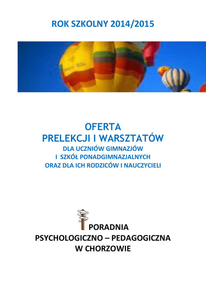 ROK SZKOLNY 2014/2015 OFERTA PRELEKCJI I WARSZTATÓW DLA UCZNIÓW GIMNAZJÓW I SZKÓŁ PONADGIMNAZJALNYCH ORAZ DLA ICH RODZICÓW I NAUCZYCIELI PORADNIA PSYCHOLOGICZNO – PEDAGOGICZNA W CHORZOWIE Prelekcje i warsztaty dla Uczniów PROGRAM PROFILAKTYCZNY TAK CZY NIE - zajęcia dla uczniów klas II i III gimnazjum ZAWARTOŚĆ MERYTORYCZNA: Celem zajęć z młodzieżą jest dostarczenie podstawowej wiedzy o mechanizmach uzależnień, kształtowanie postaw sprzyjających podejmowaniu racjonalnych decyzji związanych z zażywaniem alkoholu i środków odurzających oraz kształtowanie umiejętności umożliwiających obronę własnych praw – ćwiczenia asertywnych zachowań PROWADZĄCA: Irena Świerczyńska, pedagog ZAJĘCIA INTEGRACYJNE ZAWARTOŚĆ MERYTORYCZNA: Celem zajęć jest skrócenie procesu adaptacji do nowych warunków, wzbudzenie poczucia bezpieczeństwa i akceptacji, wypracowanie wspólnych norm i zasad, wzbudzenie wrażliwości na potrzeby, a także sukcesy i porażki innych osób, wykształcenie umiejętności współpracy oraz integracja uczniów PROWADZĄCA: Irena Świerczyńska, pedagog AGRESJA, OFIARA, ŚWIADEK – TRIADA W AKCIE PRZEMOCY ZAWARTOŚĆ MERYTORYCZNA: Warsztat porusza zagadnienia dotyczące zachowań prowokujących agresję, wyzwalające się wówczas uczucia u agresora, świadka i ofiary przemocy. Przedstawia również środki zaradcze dotyczące radzenia sobie z emocjami. PROWADZĄCY: Sabina Lorek, pedagog 2 JAK SOBIE RADZIĆ ZE ZŁOŚCIĄ I LĘKIEM? ZAWARTOŚĆ MERYTORYCZNA: Warsztat zapoznaje uczniów z paletą różnorodnych emocji, jakich mogą doświadczać dzieci i młodzież z uwzględnieniem lęku i złości, a także sposobów radzenia sobie z nimi w różnych sytuacjach szkolnych i pozaszkolnych. PROWADZĄCY: Sabina Lorek, pedagog STRES OKIEŁZNANY - trening antystresowy ZAWARTOŚĆ MERYTORYCZNA: Warsztat pozwala na zapoznanie ze zjawiskiem stresu, a nade wszystko pozwala nauczyć się różnych technik relaksacyjnych przydatnych w sytuacjach stresowych. PROWADZĄCY: Sabina Lorek, pedagog ONI SIĘ NIE UCZĄ CZY NIE POTRAFIĄ SIĘ UCZYĆ ZAWARTOŚĆ MERYTORYCZNA: Warsztaty dla uczniów gimnazjum nakierowane na zapoznanie się z podstawowymi metodami usprawniającymi naukę szkolną. PROWADZĄCY: Joanna Hajduk pedagog, Katarzyna Rosa logopeda UCZYMY SIĘ ROZWIĄZYWAĆ KONFLIKTY ZAWARTOŚĆ MERYTORYCZNA: Podczas zajęć uczniowie zostaną zapoznani z różnymi sposobami radzenia sobie ze złością, istotą konfliktu, z zasadami i sposobami konstruktywnego rozwiązania konfliktu. PROWADZĄCY: Anita Jurczyk – Gniełka 3 ZGRANA KLASA - BUDOWANIE DOBRYCH RELACJI W KLASIE ZAWARTOŚĆ MERYTORYCZNA: Celem warsztatu jest zbudowanie dobrych relacji w zespole klasowym poprzez dobre poznanie się uczniów (szczególnie na etapie budowania zespołu klasowego), poszukiwanie elementów łączących zespół klasowy, budowanie zaufania i norm klasowych, budowanie pozytywnego obrazu siebie. PROWADZĄCY: Anna Bigaj, psycholog, Anita Jurczyk -Gniełka TEN OKROPNY STRES ZAWARTOŚĆ MERYTORYCZNA: Celem warsztatu jest zapoznanie uczniów z pojęciami lęku i stresu, ich pozytywnym i negatywnym działaniem oraz sposobami radzenia sobie nimi. A także poszukiwanie indywidualnych metod radzenia sobie ze stresem oraz omówienie metod radzenia sobie ze stresem przed egzaminem. PROWADZĄCY: Anna Bigaj, psycholog, Anita Jurczyk – Gniełka BĄDŹ MĄDRY I NIE PAL ZAWARTOŚĆ MERYTORYCZNA: Prelekcja porusza zagadnienia dotyczące przyczyn i skutków uzależnienia od nikotyny, przedstawia fizyczne i psychiczne objawy zespołu odstawiennego, portret osoby uzależnionej (co myśli, co czuje, jaką przyjmuje postawę). Zostaną także przedstawione strategie zaradcze, aby nie palić i nauczyć się różnych sposobów radzenia sobie ze stresem. PROWADZĄCY: Anita Jurczyk – Gniełka, psycholog 4 TYTOŃ, NARKOTYKI, DOPALACZE -JAK SIĘ PRZED TYM BRONIĆ? ZAWARTOŚĆ MERYTORYCZNA: Uczniowie na tych zajęciach zostaną zapoznani z zagrożeniami społecznymi i osobistymi płynącymi z używania tytoniu, narkotyków, dopalaczy. Uzyskają podstawowe informacje dotyczące profilaktyki uzależnień, zostaną przedstawione im argumenty dotyczące potrzeby walki z uzależnieniem. PROWADZĄCY: Anita Jurczyk – Gniełka STOP CYBERPRZEMOCY! ZAWARTOŚĆ MERYTORYCZNA: Warsztat zapoznaje uczniów z formami cyberprzemocy, zasadami odpowiedzialnego korzystania z internetu czy telefonu komórkowego oraz sposobami obrony przed cyberprzemocą. PROWADZĄCY: Anita Jurczyk – Gniełka DOGOŃ SIEBIE ZAWARTOŚĆ MERYTORYCZNA: Warsztaty dotyczące usprawniania koncentracji uwagi i szybkiego selekcjonowania informacji podawanych różnymi kanałami PROWADZĄCY: Joanna Hajduk, pedagog, Katarzyna Rosa, pedagog, logopeda 5 STOP NARKOTYKOM – współczesna profilaktyka uzależnień ZAWARTOŚĆ MERYTORYCZNA: Prelekcja porusza zagadnienia dotyczące profilaktyki uzależnień oraz przedstawia informacje dotyczące samego uzależnienia, substancji psychoaktywnych oraz miejsc w których można szukać pomocy. PROWADZĄCY: Adrianna Wieczorek, psycholog MIKROEDUKACJA HIV/AIDS ZAWARTOŚĆ MERYTORYCZNA: Prelekcja porusza zagadnienia dotyczące wirusa HIV, dróg zakażenia, przebiegu zakażenia jak i możliwej profilaktyki oraz leczenia. PROWADZĄCY: Adrianna Wieczorek, psycholog BUDUJĄC SWOJĄ PRZYSZŁOŚĆ ZAWARTOŚĆ MERYTORYCZNA: Warsztat adresowany jest do uczniów II klas gimnazjum, stanowi pomoc dla uczniów przygotowujących się w niedalekiej perspektywie do wyboru zawodu oraz szkoły ponadgimnazjalnej. PROWADZĄCY: Brygida Breguła pedagog, Joanna Pieniążek psycholog 6 JA I MÓJ ZAWÓD ZAWARTOŚĆ MERYTORYCZNA: Trening adresowany jest dla uczniów III klas gimnazjum, ma na celu dostarczyć uczniom niezbędnych informacji do podjęcia ostatecznej decyzji o przyszłym zawodzie i szkole ponadgimnazjalnej. PROWADZĄCY: Brygida Breguła pedagog, Joanna Pieniążek psycholog POZNAJ SIEBIE ZAWARTOŚĆ MERYTORYC