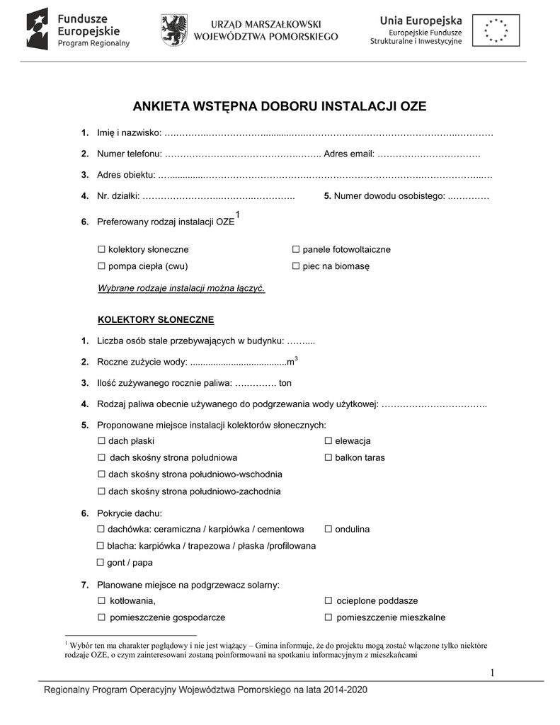 ANKIETA WSTĘPNA DOBORU INSTALACJI OZE 1. Imię i nazwisko: ….………..………………...........…..…………………………………………..………… 2. Numer telefonu: ………………….………………….…….. Adres email: ……………………………. 3. Adres obiektu: .…..............…………………………….……………………………….………………...… 4. Nr. działki: ……………………..………..………….. 6. Preferowany rodzaj instalacji OZE 5. Numer dowodu osobistego: ..………… 1 □ kolektory słoneczne □ pompa ciepła (cwu) □ panele fotowoltaiczne □ piec na biomasę Wybrane rodzaje instalacji można łączyć. KOLEKTORY SŁONECZNE 1. Liczba osób stale przebywających w budynku: …….... 2. Roczne zużycie wody: ......................................m 3 3. Ilość zużywanego rocznie paliwa: ….………. ton 4. Rodzaj paliwa obecnie używanego do podgrzewania wody użytkowej: …………………………….. 5. Proponowane miejsce instalacji kolektorów słonecznych: □ dach płaski □ dach skośny strona południowa □ dach skośny strona południowo-wschodnia □ dach skośny strona południowo-zachodnia □ elewacja □ balkon taras 6. Pokrycie dachu: □ dachówka: ceramiczna / karpiówka / cementowa □ ondulina □ blacha: karpiówka / trapezowa / płaska /profilowana □ gont / papa 7. Planowane miejsce na podgrzewacz solarny: □ kotłowania, □ pomieszczenie gospodarcze □ ocieplone poddasze □ pomieszczenie mieszkalne 1 Wybór ten ma charakter poglądowy i nie jest wiążący – Gmina informuje, że do projektu mogą zostać włączone tylko niektóre rodzaje OZE, o czym zainteresowani zostaną poinformowani na spotkaniu informacyjnym z mieszkańcami 1 8. Wymiary pomieszczenia na podgrzewacz solarny: szerokość …... długość…..… wysokość…….. 9. Szerokość drzwi pomieszczenia przygotowanego na podgrzewacz solarny:………,….. m 10. Czy w pomieszczeniu, gdzie będzie znajdował się zbiornik c.w.u. doprowadzony jest prąd? □ Tak □ Nie 11. Czy w pomieszczeniu, gdzie będzie znajdował się zbiornik c.w.u., jest możliwość podłączenia się □ Tak □ Nie – podać szacunkową odległość……m 12. Czy obecnie na instalacji jest zamontowany reduktor ciśnienia? □ tak □ nie 13. Czy istnieje instalacja odgromowa w budynku? □ tak □ nie 14. Istniejące źródło ciepła dla podgrzania ciepłej wody użytkowej: □ kocioł gazowy 1-funkcyjny z wolnostojącym zasobnikiem □ kocioł gazowy 1-funkcyjny ze zintegrowanym zasobnikiem □ kocioł na paliwo stałe węgiel □ kocioł olejowy □ kocioł gazowy 2-funkcyjny □ kocioł gazowy gaz ziemny/płynny □ kocioł na paliwo stałe opalany biomasą □ przepływowy podgrzewacz wody □ pojemnościowy podgrzewacz wody PANELE FOTOWOLTAICZNE 2 1. Moc umowna (przyłączeniowa) ………. Zużycie energii elektrycznej w gospodarstwie domowym na podstawie rachunków za energię elektryczną 2015 r. Wyszczególnienie 3 Zużycie w okresach rozliczeniowych w 2015 r. Zużycie rzeczywiste [kWh] Zużycie prognozowane [kWh] Styczeń Luty Marzec Kwiecień Maj Czerwiec 2 Moc umowna wynika z podpisanej umowy z operatorem systemu dystrybucyjnego oraz jest wyrażona w [kW]. Często występuje w fakturach za energię elektryczną pod pozycją „moc umowna” lub w pozycji „ilość” przy opłacie sieciowej stałej lub przy opłacie przejściowej 3 Zużycie proszę podać na poszczególne okresy obliczeniowe (miesięczne, dwumiesięczne, kwartalne, roczne) 2 Lipiec Sierpień Wrzesień Październik Listopad Grudzień Razem w roku 2. Proponowane miejsce instalacji paneli fotowoltaicznych □ dach płaski □ dach skośny strona południowa □ dach skośny strona południowo-wschodnia □ dach skośny strona południowo-zachodnia □ elewacja □ balkon taras 3. Pokrycie dachu: □ dachówka: ceramiczna / karpiówka / cementowa □ ondulina □ blacha: karpiówka / trapezowa / płaska /profilowana □ gont / papa POMPA CIEPŁA 2 1. Powierzchnia / kubatura domu: .……..m / ….……m 3 2. Moc istniejącego kotła: ……………………….…... kW 3. Ilość zużywanego rocznie paliwa: ….………. ton 4. Liczba osób stale przebywających w budynku:…….... 5. Roczne zużycie wody: ......................................m 3 6. Rodzaj paliwa obecnie używanego do podgrzewania wody użytkowej: …………………….……………………….. 7. Rodzaj paliwa obecnie używanego do ogrzewania domu: ………………………………………………………….…. 3 KOCIOŁ NA BIOMASĘ 2 1. Powierzchnia / kubatura domu: .……..m / ….……m 3 2. Ilość zużywanego rocznie paliwa: ….………. ton 3. Moc istniejącego kotła: ……………………….…... kW 4. Rodzaj paliwa obecnie używanego do podgrzewania wody użytkowej: ………………………………………….. 5. Rodzaj paliwa obecnie używanego do ogrzewania domu: ……………………………………………………….…. 6. Wymiary kotłowni lub miejsca przeznaczonego na kocioł: szerokość….…. długość….…. wysokość…….. 7. Czy kocioł grzeje ciepłą wodę użytkową? □ tak □ nie …………………………..…………………………………………….. DATA I CZYTELNY PODPIS BENEFICJENTA Niniejszym wyrażam zgodę na przetwarzanie danych osobowych zawartych w niniejszej ankiecie na potrzeby prawidłowej realizacji projektu zgodnie z ustawą z dnia 29.08.1997 r. o ochronie danych osobowych (Dz.U. 2015, poz. 2135). 4