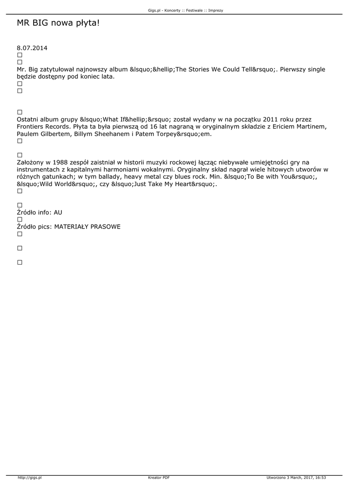 Gigs.pl - Koncerty :: Festiwale :: Imprezy MR BIG nowa płyta! 8.07.2014 Mr. Big zatytułował najnowszy album ‘…The Stories We Could Tell’. Pierwszy single będzie dostępny pod koniec lata. Ostatni album grupy ‘What If…’ został wydany w na początku 2011 roku przez Frontiers Records. Płyta ta była pierwszą od 16 lat nagraną w oryginalnym składzie z Ericiem Martinem, Paulem Gilbertem, Billym Sheehanem i Patem Torpey’em. Założony w 1988 zespół zaistniał w historii muzyki rockowej łącząc niebywałe umiejętności gry na instrumentach z kapitalnymi harmoniami wokalnymi. Oryginalny skład nagrał wiele hitowych utworów w różnych gatunkach; w tym ballady, heavy metal czy blues rock. Min. ‘To Be with You’, ‘Wild World’, czy ‘Just Take My Heart’. Źródło info: AU Źródło pics: MATERIAŁY PRASOWE http://gigs.pl Kreator PDF Utworzono 3 March, 2017, 16:53