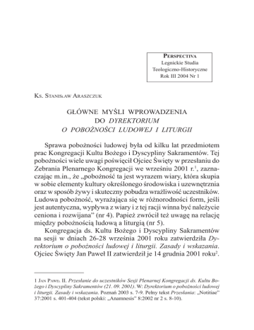 Główne myśli wprowadzenia do Dyrektorium 175 Perspectiva Legnickie Studia Teologiczno-Historyczne Rok III 2004 Nr 1 Ks. Stanisław Araszczuk Główne myśli Wprowadzenia do Dyrektorium o pobożności ludowej i liturgii Sprawa pobożności ludowej była od kilku lat przedmiotem prac Kongregacji Kultu Bożego i Dyscypliny Sakramentów. Tej pobożności wiele uwagi poświęcił Ojciec Święty w przesłaniu do Zebrania Plenarnego Kongregacji we wrześniu 2001 r.1, zaznaczając m.in., że „pobożność ta jest wyrazem wiary, która skupia w sobie elementy kultury określonego środowiska i uzewnętrznia oraz w sposób żywy i skuteczny pobudza wrażliwość uczestników. Ludowa pobożność, wyrażająca się w różnorodności form, jeśli jest autentyczna, wypływa z wiary i z tej racji winna być należycie ceniona i rozwijana” (nr 4). Papież zwrócił też uwagę na relację między pobożnością ludową a liturgią (nr 5). Kongregacja ds. Kultu Bożego i Dyscypliny Sakramentów na sesji w dniach 26-28 września 2001 roku zatwierdziła Dyrektorium o pobożności ludowej i liturgii. Zasady i wskazania. Ojciec Święty Jan Paweł II zatwierdził je 14 grudnia 2001 roku2. 1 Jan Paweł II. Przesłanie do uczestników Sesji Plenarnej Kongregacji ds. Kultu Bożego i Dyscypliny Sakramentów (21. 09. 2001). W: Dyrektorium o pobożności ludowej i liturgii. Zasady i wskazania. Poznań 2003 s. 7-9. Pełny tekst Przesłania: „Notitiae” 37:2001 s. 401-404 (tekst polski: „Anamnesis” 8:2002 nr 2 s. 8-10). Ks. Stanisław Araszczuk 176 Dokument został zaprezentowany dziennikarzom 9 kwietnia 2002 r., w czasie konferencji prasowej na Watykanie. Prezentacji dokonali: prefekt Kongregacji kard. Jorge Arturo Medina Estévez i jej sekretarz arcybiskup Francesco Tamburino. Dyrektorium rodziło się oddolnie. Jak zauważa B. Nadolski, w odnowie liturgii po Soborze Watykańskim II sygnalizowano wie-lokrotnie przeintelektualizowanie służby Bożej Kościoła, wskazywano na zbyt duże uproszczenia. Z drugiej strony dokonywały się zmiany w strukturach społeczeństw w różnych dziedzinach życia. Człowiek zyskał większą wolność, ale równocześnie dokonały się głębokie pęknięcia w rodzinie, polityce, szkole. Skutkiem tych przemian jest dystansowanie się i sceptycyzm wzajemny ludzi. Dalsza sprawa to technizacja i specjalizacja życia, zerwanie kontaktu z naturą. Spowodowało to pomniejszenie znaczenia elementów pobożności ludowej. Powstało napięcie, niedopuszczalna dychotomia pomiędzy liturgią i formami pobożności ludowej3. W reakcji na zaistniałą sytuację duchowieństwo próbowało różnych eksperymentów, by odrzuciwszy pewne praktyki i nabożeństwa, liturgię uczynić bardziej atrakcyjną. Tymczasem okazało się, że człowiek potrzebuje zaangażowania wszystkich zmysłów, by uczestniczyć w czymś co jest transcendentne. 1. Natura i struktura dokumentu. Dyrektorium składa się z dwóch części. Pierwsza – zatytułowana: Wnioski wynikające z historii, nauczania Kościoła i teologii – przedstawia te elementy, które mogą stanowić pomoc w ułożeniu harmonijnych relacji między kultem liturgicznym 2 Congregazione per il Culto Divino e la Disciplina dei Sacramenti. Direttorio su pietà popolare e liturgia. Principi e orientamenti. Città del Vaticano 9. 04. 2002. Tekst w języku polskim: Dyrektorium o pobożności ludowej i liturgii. Tłum. J. Sroka, Poznań 2003 (Dalej skrót: DPLiL). 3 B. N a d o l s k i . Te o l o g i c z n e zasa- Główne myśli wprowadzenia do Dyrektorium 177 i pobożnością ludową. Druga część, Wskazania, przedstawia szereg propozycji działań duszpasterskich, chociaż nie obejmuje ona wszystkich zwyczajów i praktyk pobożności stosowanych w poszczególnych wspólnotach lokalnych. W swej całości Dyrektorium stawia sobie za cel nie tylko zapobieganie możliwym nadużyciom i dewiacjom, lecz chce przede wszystkim dawać wskazania konstruktywne i mieć pozytywną wymowę. Dokument liczy 299 stron. Wprowadzenie porusza sprawy terminologii używanej w odniesieniu do różnych form pobożności ludowej, przypomina o pierwszeństwie liturgii i o har-monii między pobożnością a liturgią oraz wskazuje na różne formy wyrazu tej pobożności (gesty, teksty, śpiew i muzyka, obrazy, miejsca i czasy). W części pierwszej, obejmującej trzy rozdziały, przedstawiono liturgię i pobożność ludową w historii, w nauczaniu Kościoła oraz zasady mające na celu dowartościowanie i odnowę pobożności ludowej. Część druga daje w pięciu rozdziałach wskazówki dotyczące zharmonizowania pobożności ludowej z liturgią. Rozdział czwarty ukazuje formy pobożności ludowej w roku liturgicznym. Mowa w nim m.in. o wieńcu adwentowym, nowennie przed Bożym Narodzeniem i o żłóbku, o nabożeństwach w okresie Narodzenia Pańskiego, o nabożeństwach związanych z Wielkim Postem, Triduum Paschalnym, okresem wielkanocnym i okresem zwykłym w ciągu roku. Rozdział piąty poświęcony kultowi Matki Bożej traktuje o obchodzie świąt maryjnych, o sobocie poświęconej Matce Bożej, o triduach i nowennach do Matki Bożej oraz o miesiącach maryjnych. Przedstawiono tu także niektóre nabożeństwa maryjne zalecane przez Kościół. Osobno mowa jest o Akatyście. Rozdział szósty daje wskazówki dotyczące kultu świętych i błogosławionych. W rozdziale siódmym znajdują się refleksje dotyczące modlitw za zmarłych, a ósmy nosi tytuł Sanktuaria i pielgrzymki. Ukazuje on sanktuaria jako miejsca celebracji kultycznych, miejsca ewangelizacji, miłosierdzia, kultury i ruchu ekumenicznego. Przybliża znaczenie pielgrzymek, ich duchowość i rozwój. Całość dokumentu zamykają indeksy: 178 Ks. Stanisław Araszczuk tekstów biblijnych, imion i indeks rzeczowy. 2. Adresaci dokumentu. Jan Paweł II zwraca uwagę na znaczenie pobożności ludowej w rozwoju życia religijnego nie pierwszy raz. W adhortacji apostolskiej Catechesi tradend