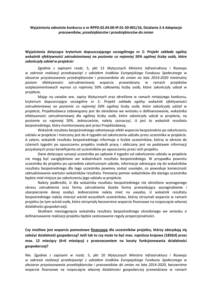 Wyjaśnienia odnośnie konkursu o nr RPPD.02.04.00-IP.01-20-001/16, Działanie 2.4 Adaptacja pracowników, przedsiębiorstw i przedsiębiorców do zmian Wyjaśnienia dotyczące kryterium dopuszczającego szczególnego nr 2: Projekt zakłada ogólny wskaźnik efektywności zatrudnieniowej na poziomie co najmniej 50% ogólnej liczby osób, które zakończyły udział w projekcie: Zgodnie z zapisami rozdz. 5, pkt 13 Wytycznych Ministra Infrastruktury i Rozwoju w zakresie realizacji przedsięwzięć z udziałem środków Europejskiego Funduszu Społecznego w obszarze przystosowania przedsiębiorców i pracowników do zmian na lata 2014-2020 minimalny poziom efektywności zatrudnieniowej wsparcia przewidziany w ramach projektów outplacementowych wynosi co najmniej 50% całkowitej liczby osób, które zakończyły udział w projekcie. Mając na uwadze ww. zapisy Wytycznych oraz określone w ramach niniejszego konkursu, kryterium dopuszczające szczególne nr 2: Projekt zakłada ogólny wskaźnik efektywności zatrudnieniowej na poziomie co najmniej 50% ogólnej liczby osób, które zakończyły udział w projekcie, Projektodawca zobowiązany jest do określenia we wniosku o dofinansowanie, wskaźnika efektywności zatrudnieniowej dla ogólnej liczby osób, które zakończyły udział w projekcie, na poziomie co najmniej 50%. Jednocześnie, należy zaznaczyć, iż jest to wskaźnik rezultatu bezpośredniego, który monitorowany jest przez Projektodawcę. Wskaźnik rezultatu bezpośredniego odnotowuje efekt wsparcia bezpośrednio po zakończeniu udziału w projekcie i mierzony jest do 4 tygodni od zakończenia udziału przez uczestnika w projekcie. A zatem, wskaźnik rezultatu bezpośredniego informuje o liczbie uczestników, którzy w okresie do czterech tygodni po opuszczeniu projektu znaleźli pracę i obliczany jest na podstawie informacji pozyskanych przez beneficjenta od uczestników po opuszczeniu przez nich projektu. Dane dotyczące sytuacji uczestnika po upływie 4 tygodni od zakończenia udziału w projekcie nie mogą być uwzględnione we wskaźnikach rezultatu bezpośredniego. W przypadku powrotu uczestnika do projektu po uprzednio zakończonym udziale, informacje odnoszące się do wskaźników rezultatu bezpośredniego dla tego uczestnika powinny zostać usunięte, co powoduje konieczność zaktualizowania wartości wskaźników rezultatu. Ponowny pomiar wskaźników dla danego uczestnika będzie miał miejsce po zakończeniu jego udziału w projekcie. Należy podkreślić, iż dla wskaźnika rezultatu bezpośredniego nie określono wymaganego okresu zatrudnienia oraz formy zatrudnienia (każda forma przewidująca wynagrodzenie i ubezpieczenie danej osoby). Jednocześnie należy mieć na uwadze, iż wskaźnik rezultatu bezpośredniego należy mierzyć wśród wszystkich uczestników, którzy otrzymali wsparcie w ramach projektu (w tym wśród osób, które otrzymały bezzwrotne wsparcie finansowe na rozpoczęcie własnej działalności gospodarczej). Skutkiem nieosiągnięcia wskaźnika rezultatu bezpośredniego określonego we wniosku o dofinansowanie realizacji projektu będzie zastosowanie reguły proporcjonalności. Czy możliwe jest wsparcie pomostowe finansowe dla uczestników projektu, którzy zdecydują się założyć działalność gospodarczą? Jeśli tak to czy może to być max. najniższa krajowa (1850zł) przez max. 12 miesięcy (6+6 miesięcy) z przeznaczeniem na koszty funkcjonowania działalności gospodarczej? Nie. Zgodnie z zapisami w rozdz. 5, pkt 10 Wytycznych Ministra Infrastruktury i Rozwoju w zakresie realizacji przedsięwzięć z udziałem środków Europejskiego Funduszu Społecznego w obszarze przystosowania przedsiębiorców i pracowników do zmian na lata 2014-2020, bezzwrotne wsparcie finansowe na rozpoczęcie własnej działalności gospodarczej przewidziane w ramach Działania 2.4 RPOWP na lata 2014-2020 może zostać uzupełnione o wsparcie pomostowe w postaci usług doradczo – szkoleniowych udzielanych na etapie poprzedzającym rozpoczęcie działalności gospodarczej (przygotowanie do samodzielnego prowadzenia działalności gospodarczej) lub w okresie pierwszych 12 miesięcy prowadzenia działalności gospodarczej (pomoc w efektywnym wykorzystaniu wsparcia finansowego wspomagająca rozwój działalności gospodarczej). Reasumując, wsparcie pomostowe w ramach niniejszego konkursu może być wniesione jedynie w postaci usług doradczo – szkoleniowych udzielanych na etapie poprzedzającym rozpoczęcie działalności gospodarczej lub w okresie pierwszych 12 miesięcy prowadzenia działalności gospodarczej. Jak wyliczany jest wkład własny w projekcie? Wkład własny = 5% x wydatki kwalifikowane ogółem Każdy podmiot ubiegający się o dofinansowanie w ramach niniejszego konkursu jest zobowiązany do wniesienia wkładu własnego w wysokości stanowiącej nie mniej niż 5% wydatków kwalifikowalnych projektu. Wkład własny mogą zapewnić środki finansowe lub wkład niepieniężny zabezpieczone przez wnioskodawcę, które zostaną przeznaczone na pokrycie wydatków kwalifikowalnych i nie zostaną wnioskodawcy przekazane w formie dofinansowania. Wartość wkładu własnego stanowi różnicę między kwotą wydatków kwalifikowalnych a kwotą dofinansowania przekazaną wnioskodawcy, zgodnie z poziomem dofinansowania dla projektu, rozumianą jako procent dofinansowania wydatków kwalifikowalnych. Wkład własny beneficjenta jest wykazywany we wniosku o dofinansowanie, przy czym to beneficjent określa formę wniesienia wkładu własnego. Wkład własny niekoniecznie musi być wnoszony przez beneficjenta. Może być wniesiony także przez partnera, jak również uczestników projektu, o ile zostało to uwzględnione we wniosku o dofinansowanie. Wkład własny lub jego część może być wniesiony w ramach kosztów pośrednich jak i bezpośrednich. Wkład własny wnoszony przez beneficjenta, na rzecz projektu, w postaci nieruchomości, urządz