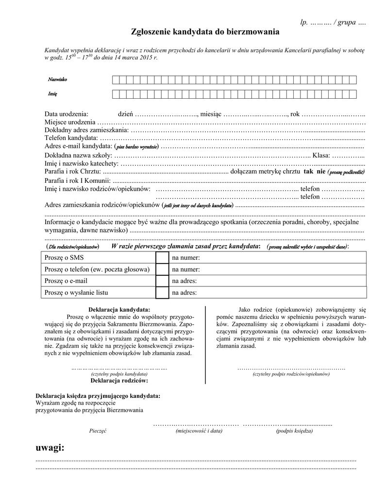 lp. ………. / grupa …. Zgłoszenie kandydata do bierzmowania Kandydat wypełnia deklarację i wraz z rodzicem przychodzi do kancelarii w dniu urzędowania Kancelarii parafialnej w sobotę w godz. 1500 – 1730 do dnia 14 marca 2015 r. Nazwisko Imię Data urodzenia: dzień ……………….….….., miesiąc ………..…...…..…….., rok ………………...…….. Miejsce urodzenia ……………………………………………………………………………………………………… Dokładny adres zamieszkania: ……………………………….…………………………………................................... Telefon kandydata: ………………………………………………………………………………….............................. Adres e-mail kandydata: (pisz bardzo wyraźnie) ………………………………….................................................................. Dokładna nazwa szkoły: ………………………………………………………………………….. Klasa: …………... Imię i nazwisko katechety: ………………………………………………………………………….............................. Parafia i rok Chrztu: ......................................................................... dołączam metrykę chrztu tak nie (proszę podkreślić) Parafia i rok I Komunii: ................................................................................................................................................... Imię i nazwisko rodziców/opiekunów: ……………………………………………………... telefon ………………. ……………………………………………………... telefon ………………. Adres zamieszkania rodziców/opiekunów (jeśli jest inny od danych kandydata) ........................................................................... .......................................................................................................................................................................................... Informacje o kandydacie mogące być ważne dla prowadzącego spotkania (orzeczenia poradni, choroby, specjalne wymagania, dawne nazwisko) ........................................................................................................................................ .......................................................................................................................................................................................... (Dla rodziców/opiekunów) W razie pierwszego złamania zasad przez kandydata: (proszę zakreślić wybór i uzupełnić dane): Proszę o SMS na numer: Proszę o telefon (ew. poczta głosowa) na numer: Proszę o e-mail na adres: Proszę o wysłanie listu na adres: Deklaracja kandydata: Proszę o włączenie mnie do wspólnoty przygotowującej się do przyjęcia Sakramentu Bierzmowania. Zapoznałem się z obowiązkami i zasadami dotyczącymi przygotowania (na odwrocie) i wyrażam zgodę na ich zachowanie. Zgadzam się także na przyjęcie konsekwencji związanych z nie wypełnieniem obowiązków lub złamania zasad. Jako rodzice (opiekunowie) zobowiązujemy się pomóc naszemu dziecku w spełnieniu powyższych warunków. Zapoznaliśmy się z obowiązkami i zasadami dotyczącymi przygotowania (na odwrocie) oraz konsekwencjami związanymi z nie wypełnieniem obowiązków lub złamania zasad. ……………………………………………. ……………………………………………. (czytelny podpis kandydata) (czytelny podpis rodziców/opiekunów) Deklaracja rodziców: Deklaracja księdza przyjmującego kandydata: Wyrażam zgodę na rozpoczęcie przygotowania do przyjęcia Bierzmowania ……….…….………………… ………………............................ Pieczęć (miejscowość i data) (podpis księdza) uwagi: .......................................................................................................................................................................................... .......................................................................................................................................................................................... PRZYGOTOWANIE do bierzmowania Obowiązki i zasady * Bierzmowanie może przyjąć osoba wierząca, ochrzczona, praktykująca systematycznie wiarę (niedzielna Msza Święta, rekolekcje, spowiedź, Komunia Święta, codzienna modlitwa), żyjąca w zgodzie z zasadami moralności chrześcijańskiej, biorąca udział w spotkaniach przygotowujących do udzielenia tego sakramentu. Brak któregokolwiek z tych warunków powoduje odłożenie przyjęcia sakramentu do czasu osiągnięcia należytej dojrzałości. Kandydat do bierzmowania przyjmuje następujące obowiązki i zasady: 1. Systematyczny i zaangażowany udział w szkolnej katechezie (dotyczy uczniów). Katecheta na prośbę przygotowującego się do bierzmowania na koniec roku szkolnego wydaje opinię o przygotowującym się do bierzmowania. Opinia negatywna oznacza przełożenie przygotowania na kolejny rok. 2. Świadectwo chrześcijańskiego życia. Dotyczy to nie tylko Parafii, ale także rodziny, szkoły i innych miejsc. Brak właściwego świadectwa oznacza przełożenie przygotowania na kolejny rok. 3. Systematyczny i zaangażowany udział w spotkaniach dla kandydatów. Trzykrotna nieusprawiedliwiona nieobecność na spotkaniach w ciągu roku powoduje przełożenie przygotowania na kolejny rok. Ewentualne nieobecności należy usprawiedliwiać w ciągu siedmiu następujących po spotkaniu dni. Usprawiedliwienie telefonicznie lub e-mailem księdza prowadzącego przygotowanie. 4. Kandydat zachowujący się nieodpowiednio na spotkaniu (np.: rozmowy, śmiechy, przepychania, przeszkadzanie innym, niewykonywanie poleceń prowadzącego) może zostać wyproszony. Sytuację taką traktuje się jako ni