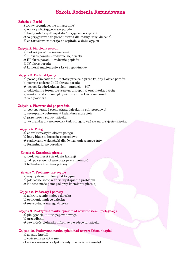Szkoła Rodzenia Refundowana Zajęcia 1. Poród Sprawy organizacyjne a następnie: a) objawy zbliżającego się porodu b) kiedy udać się do szpitala / przyjęcie do szpitala c) co przygotować do porodu (torba dla mamy, taty, dziecka) d) co tatusiowe zabierają do szpitala w dniu wypisu Zajęcia 2. Fizjologia porodu a) I okres porodu – rozwierania b) II okres porodu – rodzenie się dziecka c) III okres porodu – rodzenie popłodu d) IV okres porodu e) komórki macierzyste z krwi pępowinowej Zajęcia 3. Poród aktywny a) poród jako zadanie – metody przejścia przez trudny I okres porodu b) pozycje podczas I i II okresu porodu c) zespół Reada-Lukasa „lęk – napięcie – ból” d) oddychanie torem brzusznym (przeponą) oraz nauka parcia e) nauka relaksu pomiędzy skurczami w I okresie porodu f) rola partnera Zajęcia 4. Pierwsze dni po porodzie a) postępowanie i ocena stanu dziecka na sali porodowej b) szczepienia ochronne + kalendarz szczepień c) prawidłowy rozwój dziecka d) wyprawka dla noworodka (jak przygotować się na przyjęcie dziecka) Zajęcia 5. Połóg a) charakterystyka okresu połogu b) baby blues a depresja poporodowa c) praktyczne wskazówki dla świeżo upieczonego taty d) formalności po porodzie Zajęcia 6. Karmienie piersią a) budowa piersi i fizjologia laktacji b) jak powstaje pokarm oraz jego zmienność c) technika karmienia piersią Zajęcia 7. Problemy laktacyjne a) najczęstsze problemy laktacyjne b) jak radzić sobie w razie wystąpienia problemu c) jak tata może pomagać przy karmieniu piersią Zajęcia 8. Podstawy I pomocy a) zakrztuszenie małego dziecka b) oparzenie małego dziecka c) resuscytacja małego dziecka Zajęcia 9. Praktyczna nauka opieki nad noworodkiem - pielęgnacja a) pielęgnacja kikuta pępowinowego b) przewijanie c) zawartość pieluszki informacją o zdrowiu dziecka Zajęcia 10. Praktyczna nauka opieki nad noworodkiem - kąpiel a) zasady kąpieli b) ćwiczenia praktyczne c) masaż noworodka (jak i kiedy masować niemowlę)