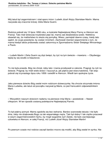 Rodzina katolicka - Św. Teresa z Lisieux. Dziecko państwa Martin poniedziałek, 22 czerwca 2009 15:20 Mój tatuś był zegarmistrzem i miał sporo imion: Ludwik Józef Alojzy Stanisław Martin. Mama nazywała się znacznie krócej: Zelia Maria Guerin. Rodzice pobrali się 13 lipca 1858 roku, w kościele Najświętszej Maryi Panny w Alencon we Francji. Tato miał wówczas trzydzieści pięć lat, mama zaś dwadzieścia sześć. Niektórzy obawiali się, że małżeństwo to okaże się pomyłką. Wiesz, pamiętali dawne czasy, kiedy tato sądził, że czuje powołanie, by zostać mnichem. Zachowali również wspomnienie o tym, że mama kiedyś także próbowała zostać zakonnicą w Zgromadzeniu Sióstr Świętego Wincentego a Paulo. – Ludwik Martin i Zelia Guerin są zbyt święci, by żyć na tym świecie – mawiano. – Obydwojgu lepiej by się wiodło w klasztorze. To nie była prawda. Bóg nie chciał, żeby tato i mama przebywali w zakonie. Pragnął, by żyli na świecie. Pragnął, by mieli wiele dzieci i nauczyli je, jak piękna jest wiara katolicka. Tak więc pobrali się trzynastego lipca roku 1858 i osiedlili w Alencon. Wiedli tam spokojne życie. Jako pierwsze dziecko Bóg zesłał moim rodzicom dziewczynkę. Na chrzcie otrzymała imiona Maria Ludwika, ale tatuś od początku nazywał ją Marie, co jest francuskim odpowiednikiem Marii. – Wszystkim naszym dzieciom nadamy na pierwsze imię Maria – powiedział. – Nawet chłopcom. W ten sposób zostaną poświęcone Najświętszej Pannie. To był piękny pomysł. Mama zgodziła się bez wahania. Bardzo szanowała tatusia i nie było dnia, żeby nie dziękowała Bogu za tak wspaniałego męża. Taki był dobry! I tak ciężko pracował w swym zegarmistrzowskim fachu, by mogli wygodnie żyć! Zaiste, nie było zacniejszego człowieka w Alencon, w całej Francji, niż Ludwik Józef Alojzy Stanisław Martin! Po pewnym czasie moi rodzice zaczęli bardzo mocno się modlić, aby Bóg zesłał im synka. Nie 1 / 10 Rodzina katolicka - Św. Teresa z Lisieux. Dziecko państwa Martin poniedziałek, 22 czerwca 2009 15:20 mogli doczekać się chłopczyka. Chcieli oddać go do stanu kapłańskiego. Jednak trójka następnych potomków okazała się dziewczynkami. Były to Maria Paulina, Maria Leonia oraz Maria Helena. Wydawało się, że liczne modlitwy o syna, „małego misjonarza”, nigdy nie zostaną wysłuchane, lecz po pewnym czasie narodził się Maria Józef Ludwik. Przyszedł na świat pięknego dnia i uradował wszystkie serca. – Oto nasz mały ksiądz! – powiedział tatuś z radością. Niestety! Niemowlę żyło tylko przez pięć miesięcy. Potem Bóg wezwał je do nieba. To samo stało się z Marią Józefem Janem Chrzcicielem, szóstym dzieckiem, które narodziło się w naszej rodzinie. Braciszek ten z kolei dożył wieku ośmiu miesięcy. Potem także zmarł. Biedny tatuś! Biedna mama! Głęboko dotknęła ich strata dwóch synków. Kochali jednak Boga naprawdę uczciwie. To znaczy, że kochali Jego wolę i ufali jej bardziej niż własnej. Dlatego też ich głęboka żałoba nie trwała długo. Poza tym wiara mówiła im, że dali światu nowych świętych, aby kochali Boga w niebie. – Chłopcy będą się za nas modlić – powiedział tatuś. – Tylko pomyślcie! Poszli do Boga bez najmniejszej skazy na duszy! Potem w naszej rodzinie urodziła się kolejna dziewczynka, Maria Celina. Rok później przyszła na świat kolejna, Maria Melania Teresa. Maleństwo żyło bardzo krótko. Wkrótce śmierć zawitała ponownie. Bóg wezwał do siebie czwarte dziecko z naszej rodziny, pięcioletnią Marię Helenę. Sąsiedzi byli wstrząśnięci tragedią, która nawiedziła nasz dom. – Zmarło czworo dzieci z ośmiorga! – mówili, smutno kiwając głowami. – Doprawdy, lepiej by było, gdyby te maleństwa nigdy się nie narodziły. Wtedy ich rodzicom oszczędzono by tak strasznego bólu. 2 / 10 Rodzina katolicka - Św. Teresa z Lisieux. Dziecko państwa Martin poniedziałek, 22 czerwca 2009 15:20 – Nie, nie! – protestowała mama. – Ja nie straciłam dzieci. Życie jest krótkie. Spotkamy się ponownie w niebie. – A poza tym przecież nadal mamy Marię, Paulinę, Leonię i Celinę. Będą podtrzymywały nas na duchu – dodawał tatuś pocieszająco. – W dodatku mój warsztat dobrze prosperuje. Dlaczego mielibyśmy narzekać? Wszystkich zdumiewało to, jak wspaniale tato i mama przyjmowali bolesne doświadczenia. Śmierć nawiedziła ich dom czterokrotnie w ciągu dwunastu lat, a i tak w domu państwa Martin gościła radość. Również w warsztacie, w którym tatuś wykonywał zawód zegarmistrza i jubilera. Odwiedziny w obydwu miejscach obfitowały w przyjemności. Czas mijał. Wkrótce nadszedł rok 1873. Maria i Paulina, wówczas uczennice szkoły przy klasztorze wizytek w Le Mans, spędzały ferie z okazji Bożego Narodzenia w domu w Alencon. Późno w nocy 2 stycznia tatuś udał się na górę do pokoiku, w którym spały. – Obudźcie się dzieciaki! – zawołał przejęty. – Mam dla was wiadomość! Dziewczynki natychmiast usiadły. Mrugały, oślepione światłem z lampy, którą trzymał tatuś. Co się wydarzyło? Dlaczego ojciec stał w drzwiach z takim szerokim uśmiechem na twarzy? – O co chodzi, tatusiu? – zapytała Maria z napięciem. – Czy mama znowu zachorowała? Również Paulinie cisnęło się na usta mnóstwo pytań, ale nie zdążyła ich zadać. – Nie, Mario. Z mamą wszystko w porządku. Macie nową siostrzyczkę – piękną maleńką dziewczynkę! 3 / 10 Rodzina katolicka - Św. Teresa z Lisieux. Dziecko państwa Martin poniedziałek, 22 czerwca 2009 15:20 Tak, to był 2 stycznia 1873 roku. Bóg zesłał mnie wreszcie na ziemię, do wspaniałej chrześcijańskiej rodziny Ludwika Martin, zegarmistrza z Alencon! Oczywiście po odwiedzinach taty niełatwo było Marii i Paulinie po prostu pójść spać. Zadawały sobie wiele pytań na mój temat. Na przykład: czy 