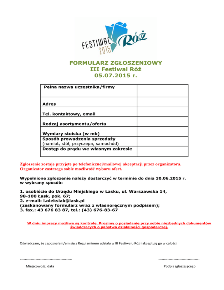 FORMULARZ ZGŁOSZENIOWY III Festiwal Róż 05.07.2015 r. Pełna nazwa uczestnika/firmy Adres Tel. kontaktowy, email Rodzaj asortymentu/oferta Wymiary stoiska (w mb) Sposób prowadzenia sprzedaży (namiot, stół, przyczepa, samochód) Dostęp do prądu we własnym zakresie Zgłoszenie zostaje przyjęte po telefonicznej/mailowej akceptacji przez organizatora. Organizator zastrzega sobie możliwość wyboru ofert. Wypełnione zgłoszenie należy dostarczyć w terminie do dnia 30.06.2015 r. w wybrany sposób: 1. osobiście do Urzędu Miejskiego w Łasku, ul. Warszawska 14, 98-100 Łask, pok. 67; 2. e-mail: [email protected] (zeskanowany formularz wraz z własnoręcznym podpisem); 3. fax.: 43 676 83 87, tel.: (43) 676-83-67 W dniu imprezy możliwe są kontrole. Prosimy o posiadanie przy sobie niezbędnych dokumentów świadczących o państwa działalności gospodarczej. Oświadczam, że zapoznałam/em się z Regulaminem udziału w III Festiwalu Róż i akceptuję go w całości. …………………………………………………… …...…………………………………… Miejscowość, data Podpis zgłaszającego