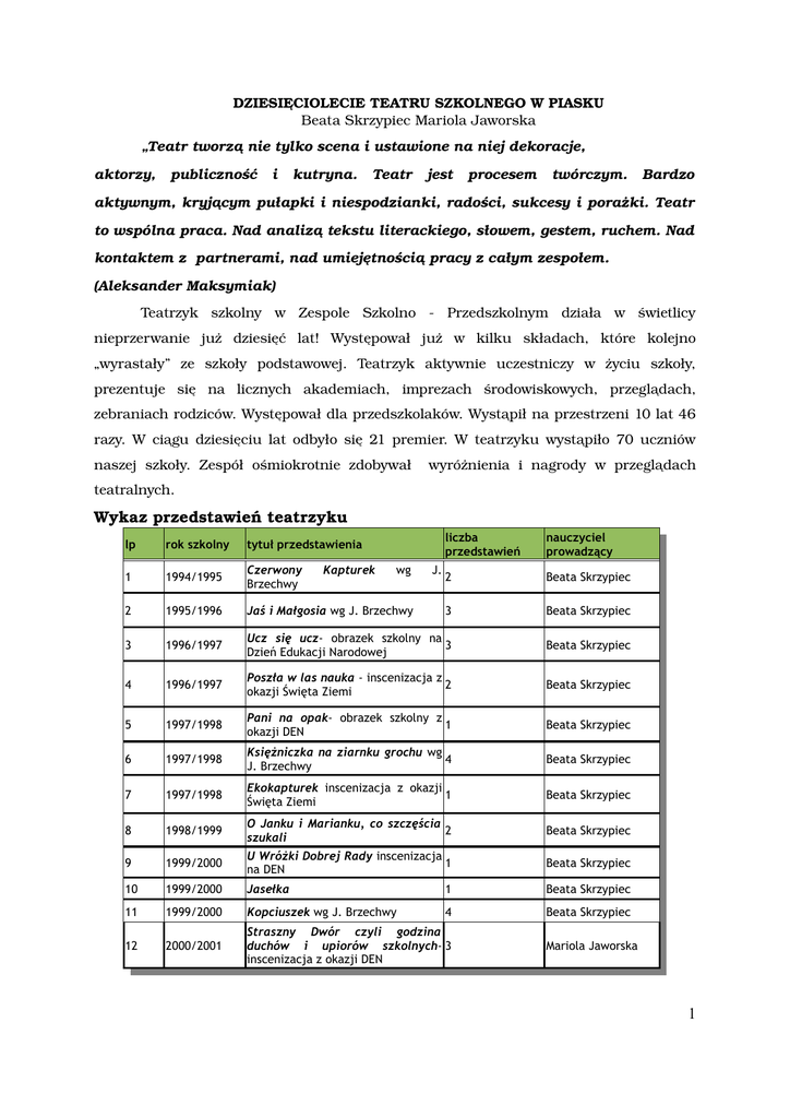 DZIESIĘCIOLECIE TEATRU SZKOLNEGO W PIASKU Beata Skrzypiec Mariola Jaworska „Teatr tworzą nie tylko scena i ustawione na niej dekoracje, aktorzy, publiczność i kutryna. Teatr jest procesem twórczym. Bardzo aktywnym, kryją cym pułapki i niespodzianki, radości, sukcesy i porażki. Teatr to wspólna praca. Nad analizą tekstu literackiego, słowem, gestem, ruchem. Nad kontaktem z partnerami, nad umiejętnością pracy z całym zespołem. (Aleksander Maksymiak) Teatrzyk szkolny w Zespole Szkolno Przedszkolnym działa w świetlicy nieprzerwanie już dziesięć lat! Występował już w kilku składach, które kolejno „wyrastały” ze szkoły podstawowej. Teatrzyk aktywnie uczestniczy w życiu szkoły, prezentuje się na licznych akademiach, imprezach środowiskowych, przeglądach, zebraniach rodziców. Występował dla przedszkolaków. Wystąpił na przestrzeni 10 lat 46 razy. W ciągu dziesięciu lat odbyło się 21 premier. W teatrzyku wystąpiło 70 uczniów naszej szkoły. Zespół ośmiokrotnie zdobywał wyróżnienia i nagrody w przeglądach teatralnych. Wykaz przedstawień teatrzyku liczba przedstawień nauczyciel prowadzący 2 Beata Skrzypiec 3 Beata Skrzypiec 1996/1997 Ucz się ucz- obrazek szkolny na 3 Dzień Edukacji Narodowej Beata Skrzypiec 4 1996/1997 Poszła w las nauka - inscenizacja z 2 okazji Święta Ziemi Beata Skrzypiec 5 1997/1998 Pani na opak- obrazek szkolny z 1 okazji DEN Beata Skrzypiec 6 1997/1998 Księżniczka na ziarnku grochu wg 4 J. Brzechwy Beata Skrzypiec 7 1997/1998 Ekokapturek inscenizacja z okazji 1 Święta Ziemi Beata Skrzypiec 8 1998/1999 O Janku i Marianku, co szczęścia 2 szukali Beata Skrzypiec 9 1999/2000 U Wróżki Dobrej Rady inscenizacja 1 na DEN Beata Skrzypiec 10 1999/2000 Jasełka 1 Beata Skrzypiec 11 1999/2000 Kopciuszek wg J. Brzechwy 4 Beata Skrzypiec 12 2000/2001 Straszny Dwór czyli godzina duchów i upiorów szkolnych- 3 inscenizacja z okazji DEN lp rok szkolny tytuł przedstawienia 1 1994/1995 Czerwony Brzechwy 2 1995/1996 Jaś i Małgosia wg J. Brzechwy 3 Kapturek wg J. Mariola Jaworska 1 lp rok szkolny tytuł przedstawienia liczba przedstawień nauczyciel prowadzący 13 2000/2001 Zabawa w jasełka 2 Mariola Jaworska 14 2001/2002 Baśń o panowaniu zdrówka 5 Mariola Jaworska 15 2001/2002 Pasowanie pierwszoklasistów 1 Beata Skrzypiec 16 2001/2002 Być tam malusieńki 2 Beata Skrzypiec 17 2001/2002 Śpiaca królewna 2 Beata Skrzypiec 18 2001/2002 Taka sobie bajka 2 Beata Skrzypiec 19 2002/2003 O Janku i Marianku, co szczęścia 1 szukali Beata Skrzypiec 2003/2004 Samorząd szkolny czyli jakbyśmy szkołą rządzili inscenizacja z 2 okazji DEN Mariola Jaworska 2003/2004 Królewna Śnieżka Mariola Jaworska 20 21 gdzie TY, Jezu 2 Jak to się zaczęło? Zaczęło się we wrześniu 1994 roku w świetlicy szkolnej Szkoły Podstawowej nr 10 w Piasku. Do świetlicy uczęszczała regularnie grupa dzieci z klasy drugiej, spędzała tutaj dużo czasu czekając na rodziców. Dzieci chętnie podjęły wyzwanie, pociągając za sobą następne dzieci z ówczesnej klasy II a. Powstało pierwsze, skromne, ale jakże urocze przedstawienie „Czerwony Kapturek”. Wystąpiliśmy na przeglądzie. W małych aktorach można było dostrzec ogromne talenty i pokłady twórczej energii. Tak zrodził się zespół w swym pierwszym składzie, który przetrwał do ukończenia przez dzieci klasy VI. Obecnie są to już maturzyści... Oto I skład zespołu: Małgosia Koprowska, Martyna Pysz, Basia Wardziak, Justyna Pisarek, Miłka Kowalska, Michalina Wybrańczyk, Iza Malcher, Kasia Ożanna, Patrycja Szczotka, Arkadia Stokłosa. W pierwszych przedstawieniach zagrali również Michał Stefański oraz Nikodem Nowotyński. Co roku braliśmy udział w przeglądach, zdobywaliśmy wyróżnienia, występowaliśmy dla uczniów naszej szkoły, dla rodziców, przedszkolaków. Przeżywaliśmy radosne i trudne chwile, pracowaliśmy intensywnie, kolejne przedstawienia dawały nam motywację do dalszej pracy. Wspólnie uczyliśmy się, doskonaliliśmy nasz warsztat teatralny. We wrześniu 1999 roku powstała nowa grupa teatralna. Stworzyli ją uczniowie klasy II b oraz I b. Grupa działała prężnie, zdobywała nagrody i wyróżnienia, uczestniczyła w warsztatach teatralnych, ambitnie podejmowała nowe wyzwania. 2 Oto II skład teatrzyku: Agnieszka Cofała, Kasia Adam, Marta Pudełko, Klaudia Wagstyl, Dominika Kowalska, Magda Jaworska, Magda Młotek, Magda Drobiec, Bartek Szczęśniak, Ewa Olesz, Magda Urbańczyk, Kinga Żelezny, Amanda Olek, Kamil Witoszek , Wiktor Łaba, Agata Szromek, Karolina Pęszor, Magda Otręba, Kasia Szymlak, Zespół działał do czerwca 2004 roku, aż młodzi aktorzy ukończyli szkołę podstawową. Teraz są już gimnazjalistami..... Obecnie działa kolejny nowy zespół. Są to utalentowani czwartoklasiści. Godnie kontynuują tradycję teatralną w naszej szkole. Aktorzy teatru: Adam Katarzyna Malcher Izabela Szromek Agata Bankiel Kinga Matyśniak Damian Szymlak Katarzyna Bankiel Łukasz Mazur Sylwia Urbańczyk Magdalena Białas Marzena Młotek Magdalena Wagstyl Klaudia Błasiak Magdalena Nowotyński Nikodem Wagstyl Mirela Bojdoł Justyna Olek Amanda Wardziak Barbara Broda Kamila Olesz Ewa Wiera Dorota Cofała Agnieszka Organiściak Jacek Witoszek Kamil Czarnecka Natalia Otręba Magdalena Wolszczak Maria Ćwierz Adam Ożanna Katarzyna Wybrańczyk Michalina Drobiec Magdalena Pająk Barbara Wybrańczyk paulina Gerlich Rafał Pastuszka Szymon Żelezny Kinga Gielata Klaudia Paweł Kokot Indyk Angelika Pęszor Karolina Jaworska Magdalena Pęszor Sylwia Kania Paulina Piesiur Michael Kapias Adam Pisarek Justyna Kolny Magdalena Pojda Magdalena Kopeć Michał Pruś Patryk Koprowska Małgorzata Pudełko Marek Kowalska Dominika Pudełko Marta Kowalska Miłosława Pysz Martyna Kubacka Patrycja Rozmus Małgorzata Lazar Michał Socałą Patrycja Lazarek Katarzyna Stefański Michał Lukasek Łukasz Stokłosa Arkadia Łaba Wiktor Szczepan Klaudia Mac