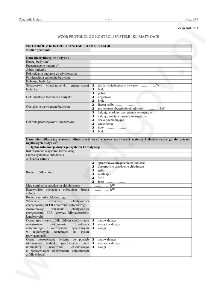 Dziennik Ustaw –5– Poz. 247 Załącznik nr 2 Załącznik nr 2 PROTOKÓŁ Z KONTROLI SYSTEMU KLIMATYZACJI Numer protokołu1) Dane identyfikacyjne budynku Rodzaj budynku2) Przeznaczenie budynku3) Adres budynku Rok oddania budynku do użytkowania Powierzchnia całkowita budynku Kubatura budynku Świadectwo charakterystyki energetycznej budynku Obciążenie wewnętrzne budynku Ochrona przed zyskami słonecznymi tak (nr świadectwa w wykazie …………….4)) brak pełna częściowa brak liczba osób: ………………… projektowe obciążenie chłodnicze: ………….. kW żaluzje, markizy, zacienienia zewnętrzne żaluzje, rolety, elementy wewnętrzne szkło pochłaniające zacienienia inne ……………….. brak .go Dokumentacja techniczna budynku v.p l WZÓR PROTOKOŁU SYSTEMUKLIMATYZACJI KLIMATYZACJI WZÓR PROTOKOŁUZZKONTROLI KONTROLI SYSTEMU ww w. rcl Dane identyfikacyjne systemu klimatyzacji wraz z oceną sprawności systemu i dostosowania go do potrzeb użytkowych budynku5) 1. Ogólne informacje dotyczące systemu klimatyzacji Rok wykonania systemu klimatyzacji Liczba systemów chłodzenia 2. Źródło chłodu sprężarkowe urządzenie chłodnicze absorpcyjne urządzenie chłodnicze split Rodzaj źródła chłodu multi split VRF inne ………………. Moc nominalna urządzenia chłodniczego …………….. kW Rzeczywiste obciążenie chłodnicze źródła …………….. kW chłodu Rodzaj czynnika chłodniczego Wskaźnik sezonowej efektywności energetycznej SEER urządzenia chłodniczego Znamionowy wskaźnik efektywności energetycznej EER (dotyczy klimatyzatorów kanałowych) Ocena sprawności źródła chłodu (porównanie zadowalająca wskaźników efektywności urządzenia niezadowalająca chłodniczego z wartościami uzyskiwanymi uwagi ………………………….. w najlepszych dostępnych na rynku rozwiązaniach) Ocena dostosowania systemu do potrzeb zadowalająca użytkowych budynku (porównanie mocy niezadowalająca nominalnej urządzenia chłodniczego uwagi ………………………….. z rzeczywistym obciążeniem chłodniczym źródła chłodu) Dziennik Ustaw –6– Nastawy regulacyjne Stan techniczny urządzenia zewnętrznego Konserwacja urządzenia dwupołożeniowa skokowa ciągła inna ………………. zadowalające niezadowalające wizualnie zadowalający wizualnie niezadowalający regularna wg potrzeb brak system wodny za pomocą czynnika chłodniczego wizualnie zadowalający wizualnie niezadowalający wizualnie zadowalająca wizualnie niezadowalająca wizualnie zadowalający wizualnie niezadowalający wizualnie zadowalający wizualnie niezadowalający 3. Rozprowadzanie chłodu Rozprowadzanie chłodu 3.1. Rurociągi Szczelność Stan izolacji Stan armatury 3.2. Pompy Całkowita moc nominalna Sposób eksploatacji Stan techniczny .go Stan powierzchni v.p l Rodzaj regulacji mocy chłodniczej Poz. 247 instalacja wentylacji i klimatyzacji klimakonwektory wentylatorowe klimatyzatory inne …………………………….7) naturalna hybrydowa mechaniczna wywiewna mechaniczna nawiewna mechaniczna nawiewno-wywiewna wymiennik obrotowy wymiennik krzyżowy wymiennik przeciwprądowy wymiennik z czynnikiem pośredniczącym pompa ciepła recyrkulacja inny ……………….. brak włącz-wyłącz czasowa według potrzeb (DCV) inny ……………….. brak centralna strefowa pomieszczeniowa inny ……………….. brak zadowalająca niezadowalająca uwagi ……………….. w. rcl 4. Przekazywanie chłodu do pomieszczeń6) ………….. kW z regulacją wg potrzeb wizualnie zadowalający niezadowalający uwagi …………………… Przekazywanie chłodu do pomieszczeń 4.1. Wentylacja i klimatyzacja6) Rodzaj wentylacji Rodzaj odzyskiwania ciepła ww Rodzaj układu automatycznej regulacji strumienia powietrza wentylacyjnego Rodzaj układu automatycznej regulacji mocy chłodniczej Ocena układów automatycznej regulacji Łączny strumień powietrza wentylacyjnego w budynku …………… m3/h Dziennik Ustaw –7– Poz. 247 ww w. rcl .go v.p l Łączna moc elektryczna silników do napędu …………… kW wentylatorów w budynku Moc właściwa wentylatora – średnia …………… W/(m3/s) dla budynku Ocena mocy właściwej wentylatorów wymaganie spełnione (porównanie wartości mocy właściwej wymaganie niespełnione z wartością wynikającą z przepisów techniczno-budowlanych) 4.1.1. Centrale klimatyzacyjne lub oddzielne urządzenia do uzdatniania powietrza6) wizualnie zadowalający Stan techniczny wizualnie niezadowalający uwagi …………………… regularna Konserwacja wg potrzeb brak zadowalająca Ocena działania niezadowalająca uwagi …………………… 4.1.2. Przewody wentylacyjne6) wizualnie zadowalający Stan powierzchni wizualnie niezadowalający uwagi …………………… wizualnie zadowalająca Szczelność wizualnie niezadowalająca wizualnie zadowalający Stan izolacji wizualnie niezadowalający wizualnie zadowalający Stan wyposażenia wizualnie niezadowalający bez zastrzeżeń lokalny dyskomfort nieefektywne usuwanie zanieczyszczeń Ocena rozdziału powietrza wentylacyjnego nieprawidłowe kierunki przepływu powietrza nie dotyczy inne uwagi ……………….. 4.2. Klimakonwektory wentylatorowe6) Liczba Moc chłodząca ……………… kW Strumień powietrza wentylacyjnego ……………… m3/h Moc silnika wentylatora ……………… kW Moc właściwa wentylatora ……………… W/(m3/s) regularna Konserwacja wg potrzeb brak zadowalająca Ocena działania niezadowalająca brak Układ regulacji tak, typ………………………………. zadowalające Nastawy regulacyjne niezadowalające 4.3. Klimatyzatory (jednostki wewnętrzne klimatyzatorów typu split, multi split, VRF lub klimatyzatory jednoczęściowe)6) Liczba Moc chłodząca ……………… kW Strumień powietrza wentylacyjnego ……………… m3/h Moc silnika wentylatora ……………… kW Moc właściwa wentylatora …