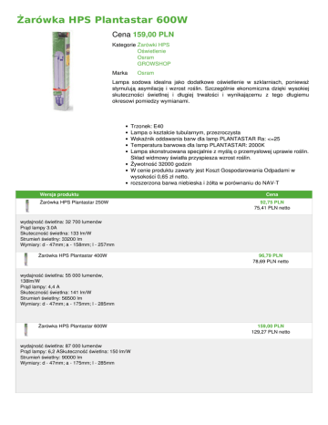 Żarówka HPS Plantastar 600W Cena 159,00 PLN Kategorie Żarówki HPS Oświetlenie Osram GROWSHOP Marka Osram Lampa sodowa idealna jako dodatkowe oświetlenie w szklarniach, ponieważ stymulują asymilację i wzrost roślin. Szczególnie ekonomiczna dzięki wysokiej skuteczności świetlnej i długiej trwałości i wynikającemu z tego długiemu okresowi pomiedzy wymianami. Trzonek: E40 Lampa o kształcie tubularnym, przezroczysta Wskaźnik oddawania barw dla lamp PLANTASTAR Ra: <=25 Temperatura barwowa dla lamp PLANTASTAR: 2000K Lampa skonstruowana specjalnie z myślą o przemysłowej uprawie roślin. Skład widmowy światła przyspiesza wzrost roślin. Żywotność 32000 godzin W cenie produktu zawarty jest Koszt Gospodarowania Odpadami w wysokości 0,65 zł netto. rozszerzona barwa niebieska i żółta w porównaniu do NAV-T Wersja produktu Żarówka HPS Plantastar 250W Cena 92,75 PLN 75,41 PLN netto wydajność świetlna: 32 700 lumenów Prąd lampy 3.0A Skuteczność świetlna: 133 lm/W Strumień świetlny: 33200 lm Wymiary: d - 47mm; a - 158mm; l - 257mm Żarówka HPS Plantastar 400W 96,79 PLN 78,69 PLN netto wydajność świetlna: 55 000 lumenów, 138lm/W Prąd lampy: 4,4 A Skuteczność świetlna: 141 lm/W Strumień świetlny: 56500 lm Wymiary: d - 47mm; a - 175mm; l - 285mm Żarówka HPS Plantastar 600W wydajność świetlna: 87 000 lumenów Prąd lampy: 6,2 ASkuteczność świetlna: 150 lm/W Strumień świetlny: 90000 lm Wymiary: d - 47mm; a - 175mm; l - 285mm 159,00 PLN 129,27 PLN netto Powered by TCPDF (www.tcpdf.org) W podobnej cenie Żarówka HPS Flower Xtreme 400W 144,00 PLN Żarówka HPS Flower Xtreme 600W 169,00 PLN Żarówka HPS Flower Xtreme Pure Bloom 400W 150,00 PLN Żarówka HPS Flower Deluxe 600W 153,00 PLN Żarówka HPS Sylvania Grolux 600W 155,00 PLN Żarówka HPS Super Plant SuperRed 600W 149,00 PLN