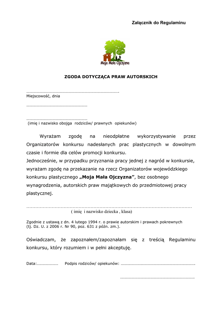Załącznik do Regulaminu ZGODA DOTYCZĄCA PRAW AUTORSKICH ………………………………………………………………………………. Miejscowość, dnia …………………………………………………… …………………………………………………… (imię i nazwisko obojga rodziców/ prawnych opiekunów) Wyrażam zgodę na nieodpłatne wykorzystywanie przez Organizatorów konkursu nadesłanych prac plastycznych w dowolnym czasie i formie dla celów promocji konkursu. Jednocześnie, w przypadku przyznania pracy jednej z nagród w konkursie, wyrażam zgodę na przekazanie na rzecz Organizatorów wojewódzkiego konkursu plastycznego „Moja Mała Ojczyzna”, bez osobnego wynagrodzenia, autorskich praw majątkowych do przedmiotowej pracy plastycznej. ………………………………………………………………………………………………… ( imię i nazwisko dziecka , klasa) Zgodnie z ustawą z dn. 4 lutego 1994 r. o prawie autorskim i prawach pokrewnych (tj. Dz. U. z 2006 r. Nr 90, poz. 631 z późn. zm.). Oświadczam, że zapoznałem/zapoznałam się z treścią Regulaminu konkursu, który rozumiem i w pełni akceptuję. Data:………………… Podpis rodziców/ opiekunów: ………………………………………………………………. ……………………………………………………………….
