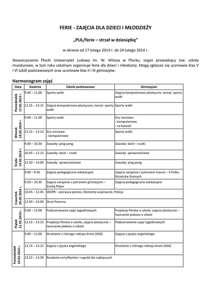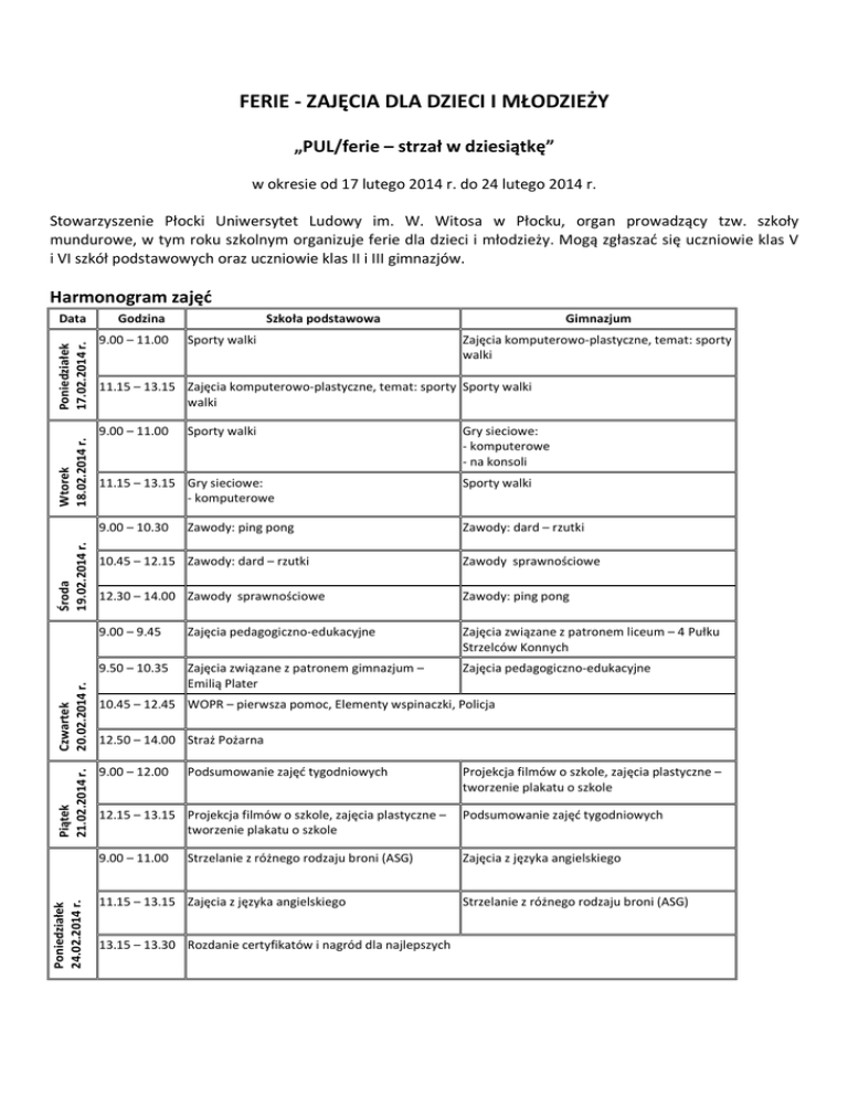 FERIE - ZAJĘCIA DLA DZIECI I MŁODZIEŻY „PUL/ferie – strzał w dziesiątkę” w okresie od 17 lutego 2014 r. do 24 lutego 2014 r. Stowarzyszenie Płocki Uniwersytet Ludowy im. W. Witosa w Płocku, organ prowadzący tzw. szkoły mundurowe, w tym roku szkolnym organizuje ferie dla dzieci i młodzieży. Mogą zgłaszać się uczniowie klas V i VI szkół podstawowych oraz uczniowie klas II i III gimnazjów. Harmonogram zajęć Poniedziałek 17.02.2014 r. Data Godzina 9.00 – 11.00 Wtorek 18.02.2014 r. Środa 19.02.2014 r. Czwartek 20.02.2014 r. Piątek 21.02.2014 r. Sporty walki Gimnazjum Zajęcia komputerowo-plastyczne, temat: sporty walki 11.15 – 13.15 Zajęcia komputerowo-plastyczne, temat: sporty Sporty walki walki 9.00 – 11.00 Poniedziałek 24.02.2014 r. Szkoła podstawowa Sporty walki Gry sieciowe: - komputerowe - na konsoli 11.15 – 13.15 Gry sieciowe: - komputerowe Sporty walki 9.00 – 10.30 Zawody: dard – rzutki Zawody: ping pong 10.45 – 12.15 Zawody: dard – rzutki Zawody sprawnościowe 12.30 – 14.00 Zawody sprawnościowe Zawody: ping pong 9.00 – 9.45 Zajęcia pedagogiczno-edukacyjne Zajęcia związane z patronem liceum – 4 Pułku Strzelców Konnych 9.50 – 10.35 Zajęcia związane z patronem gimnazjum – Emilią Plater Zajęcia pedagogiczno-edukacyjne 10.45 – 12.45 WOPR – pierwsza pomoc, Elementy wspinaczki, Policja 12.50 – 14.00 Straż Pożarna 9.00 – 12.00 Podsumowanie zajęć tygodniowych Projekcja filmów o szkole, zajęcia plastyczne – tworzenie plakatu o szkole 12.15 – 13.15 Projekcja filmów o szkole, zajęcia plastyczne – tworzenie plakatu o szkole Podsumowanie zajęć tygodniowych 9.00 – 11.00 Zajęcia z języka angielskiego Strzelanie z różnego rodzaju broni (ASG) 11.15 – 13.15 Zajęcia z języka angielskiego 13.15 – 13.30 Rozdanie certyfikatów i nagród dla najlepszych Strzelanie z różnego rodzaju broni (ASG)