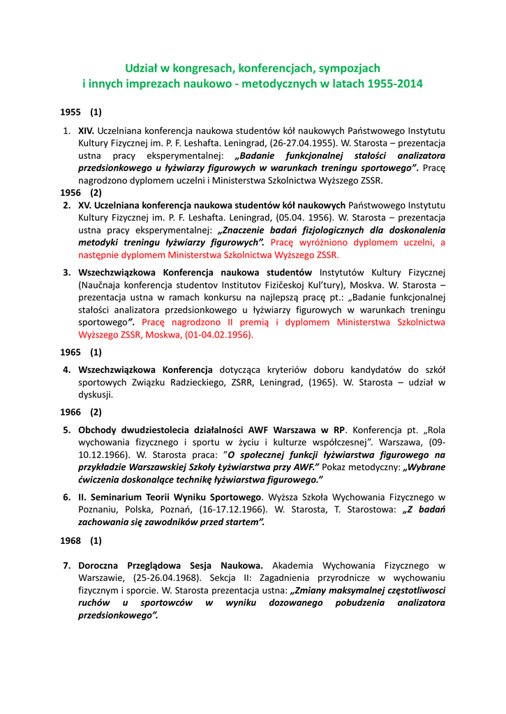 Udział w kongresach, konferencjach, sympozjach i innych imprezach naukowo - metodycznych w latach 1955-2014 1955 (1) 1. XIV. Uczelniana konferencja naukowa studentów kół naukowych Państwowego Instytutu Kultury Fizycznej im. P. F. Leshafta. Leningrad, (26-27.04.1955). W. Starosta – prezentacja ustna pracy eksperymentalnej: „Badanie funkcjonalnej stałości analizatora przedsionkowego u łyżwiarzy figurowych w warunkach treningu sportowego”. Pracę nagrodzono dyplomem uczelni i Ministerstwa Szkolnictwa Wyższego ZSSR. 1956 (2) 2. XV. Uczelniana konferencja naukowa studentów kół naukowych Państwowego Instytutu Kultury Fizycznej im. P. F. Leshafta. Leningrad, (05.04. 1956). W. Starosta – prezentacja ustna pracy eksperymentalnej: „Znaczenie badań fizjologicznych dla doskonalenia metodyki treningu łyżwiarzy figurowych”. Pracę wyróżniono dyplomem uczelni, a następnie dyplomem Ministerstwa Szkolnictwa Wyższego ZSSR. 3. Wszechzwiązkowa Konferencja naukowa studentów Instytutów Kultury Fizycznej (Naučnaja konferencja studentov Institutov Fizičeskoj Kul’tury), Moskva. W. Starosta – prezentacja ustna w ramach konkursu na najlepszą pracę pt.: „Badanie funkcjonalnej stałości analizatora przedsionkowego u łyżwiarzy figurowych w warunkach treningu sportowego”. Pracę nagrodzono II premią i dyplomem Ministerstwa Szkolnictwa Wyższego ZSSR, Moskwa, (01-04.02.1956). 1965 (1) 4. Wszechzwiązkowa Konferencja dotycząca kryteriów doboru kandydatów do szkół sportowych Związku Radzieckiego, ZSRR, Leningrad, (1965). W. Starosta – udział w dyskusji. 1966 (2) 5. Obchody dwudziestolecia działalności AWF Warszawa w RP. Konferencja pt. „Rola wychowania fizycznego i sportu w życiu i kulturze współczesnej”. Warszawa, (0910.12.1966). W. Starosta praca: ”O społecznej funkcji łyżwiarstwa figurowego na przykładzie Warszawskiej Szkoły Łyżwiarstwa przy AWF.” Pokaz metodyczny: „Wybrane ćwiczenia doskonalące technikę łyżwiarstwa figurowego.” 6. II. Seminarium Teorii Wyniku Sportowego. Wyższa Szkoła Wychowania Fizycznego w Poznaniu, Polska, Poznań, (16-17.12.1966). W. Starosta, T. Starostowa: „Z badań zachowania się zawodników przed startem”. 1968 (1) 7. Doroczna Przeglądowa Sesja Naukowa. Akademia Wychowania Fizycznego w Warszawie, (25-26.04.1968). Sekcja II: Zagadnienia przyrodnicze w wychowaniu fizycznym i sporcie. W. Starosta prezentacja ustna: „Zmiany maksymalnej częstotliwosci ruchów u sportowców w wyniku dozowanego pobudzenia analizatora przedsionkowego”. 1974 (1) 8. Congress of International Professional Skating Union. Bundes Republik Deutschland, München, (09.03.1974). W. Starosta - Hauptvortrag: „Symmetrie und Asymmetrie der Bewegungen im Eiskunstlauf”. 1976 (8) 9. Congress of International Professional Skating Union, Sweden, Goetenborg (03.1976). W. Starosta, L. Jaczynowski – prezentacja referatu w sesji plenarnej w j. angielskim: „Programowanie nauczania wybranych elementów dowolnych łyżwiarstwa figurowego”. 10. Po nieudanych dla Polski Zimowych Igrzyskach Olimpijskich w Innsbruku redakcja „Sportowca” zorganizowała „Interdyscyplinarne Forum Dyskusyjne” dotyczące stanu i przyszłości sportów zimowych w naszym kraju (Warszawa, marzec, 1976). W dyskusji prowadzonej przez red. W. Duńskiego udział wzięli: naukowcy (B. Krawczyk, I. Wojcieszak, W. Starosta), trenerzy (H. Pilejczykowa, M. Palus, J. Zubek) i działacze (E. Górski, K. Kowalczyk, J. Mulak, A. Prosałowski). Dyskusja wykazała wiele niedociągnięć w: systemie doboru i szkolenia zawodników, nieracjonalnego rozmieszczenia obiektów sportowych i ich wykorzystania, brak strategii rozwoju zimowych dyscyplin sportu, małą efektywność współpracy trenerów z naukowcami i lekarzami, brak odpowiedniej liczby szkół sportowych z internatami. Forum zakończono optymistycznym stwierdzeniem, iż „nie jesteśmy skazani na smutek”. Duże fragmenty dyskusji opublikowano w „Sportowcu” (02.03.1976) 11. II. Uczelniana konferencja Studenckich Kół Naukowych Filii AWF Warszawa w Białej Podlaskiej. Polska, Biała Podlaska, (28.04.1976). W. Starosta - Opiekun SKN Teorii Sportu, prace zareprezentowali: K. Szychowski (III miejsce), R. Łęcki, Ł. Kleszowski (I miejsce), A. Ziarko, S. Jachimczuk (II miejsce), W. Kalman, R. Makuch, G. Kodeniec. 12. XII. Ogólnopolska Konferencja Studenckich Kół Naukowych. Filia Warszawskiej Akademii Wychowania Fizycznego w Białej Podlaskiej, Polska, Serpelice, (07-09.05.1976). W. Starosta – Opiekun SKN Teorii Sportu, prace prezentowali: K. Szychowski, S. Jachimczuk (IV miejsce). 13. Międzynarodowe Seminarium naukowo-metodyczne dla trenerów różnych krajów świata w ramach Internationale Rollsport Woche. Deutscher Rollsport-Bund, OlympiaEisstadion, Bundes Republik Deutschland, Garmisch-Partenkirchen, (05-12.06.1976). W. Starosta – referaty plenarne: „Symmetrie und Asymmetrie der Bewegungen in Rollkunstlauf”; „Circuit-Training im Einzellaufen von Eis- und Rollkunstlaufen”. 14. Rozpoczęcie roku akademickiego 1976 / 1977 w Filii AWF Warszawa w Białej Podlaskiej (10.1976). W. Starosta – wykład inauguracyjny: „Znaczenie symetrii oraz asymetri ruchów w wychowaniu fizycznym i sporcie”. 15. I. Konferencja „Metody badawcze w wychowaniu fizycznym i sporcie”. AWF Poznań, (12-12.11.1976). W. Starosta: „Nowy sposób pomiaru i oceny koordynacji ruchowej.”; „Nowy sposób pomiaru tzw. skoczności.” W. Starosta, L. Jaczynowski: „Macierz obszarów dyskusyjnych w metodyce nauczania ruchu”. 16. I. Międzynarodowe Sympozjum Naukowe Studentów Wychowania Fizycznego „Olympic Idea and Achievement in Sports”. AWF we Wrocławiu, Polska, Wrocław, (16-18.12.1976). Ze Studenckiego Koła Naukowego Medycyny Sportowej i Teorii Sportu Filii AWF w Warszawie w Białej Podlaskiej uczestniczyli W. Świątek i K. Szychowski, którzy przedstawili dwie prace: „Próba modyfikacji treningu auto