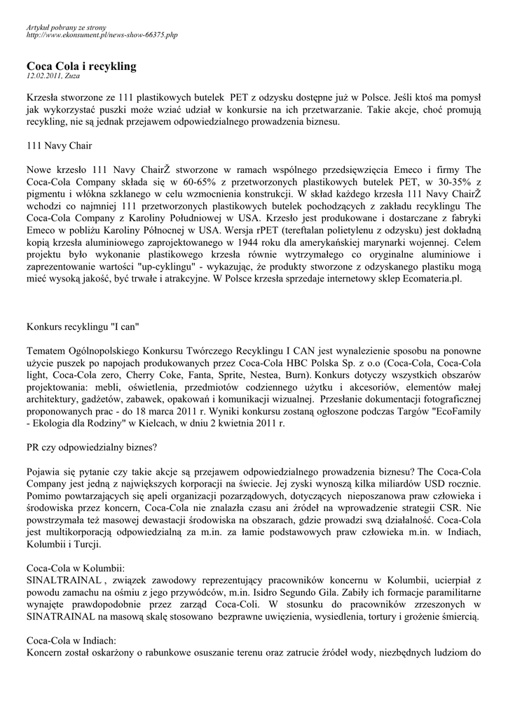 Artykuł pobrany ze strony http://www.ekonsument.pl/news-show-66375.php Coca Cola i recykling 12.02.2011, Zuza Krzesła stworzone ze 111 plastikowych butelek PET z odzysku dostępne już w Polsce. Jeśli ktoś ma pomysł jak wykorzystać puszki może wziać udział w konkursie na ich przetwarzanie. Takie akcje, choć promują recykling, nie są jednak przejawem odpowiedzialnego prowadzenia biznesu. 111 Navy Chair Nowe krzesło 111 Navy ChairŽ stworzone w ramach wspólnego przedsięwzięcia Emeco i firmy The Coca-Cola Company składa się w 60-65% z przetworzonych plastikowych butelek PET, w 30-35% z pigmentu i włókna szklanego w celu wzmocnienia konstrukcji. W skład każdego krzesła 111 Navy ChairŽ wchodzi co najmniej 111 przetworzonych plastikowych butelek pochodzących z zakładu recyklingu The Coca-Cola Company z Karoliny Południowej w USA. Krzesło jest produkowane i dostarczane z fabryki Emeco w pobliżu Karoliny Północnej w USA. Wersja rPET (tereftalan polietylenu z odzysku) jest dokładną kopią krzesła aluminiowego zaprojektowanego w 1944 roku dla amerykańskiej marynarki wojennej. Celem projektu było wykonanie plastikowego krzesła równie wytrzymałego co oryginalne aluminiowe i zaprezentowanie wartości "up-cyklingu" - wykazując, że produkty stworzone z odzyskanego plastiku mogą mieć wysoką jakość, być trwałe i atrakcyjne. W Polsce krzesła sprzedaje internetowy sklep Ecomateria.pl. Konkurs recyklingu "I can" Tematem Ogólnopolskiego Konkursu Twórczego Recyklingu I CAN jest wynalezienie sposobu na ponowne użycie puszek po napojach produkowanych przez Coca-Cola HBC Polska Sp. z o.o (Coca-Cola, Coca-Cola light, Coca-Cola zero, Cherry Coke, Fanta, Sprite, Nestea, Burn). Konkurs dotyczy wszystkich obszarów projektowania: mebli, oświetlenia, przedmiotów codziennego użytku i akcesoriów, elementów małej architektury, gadżetów, zabawek, opakowań i komunikacji wizualnej. Przesłanie dokumentacji fotograficznej proponowanych prac - do 18 marca 2011 r. Wyniki konkursu zostaną ogłoszone podczas Targów "EcoFamily - Ekologia dla Rodziny" w Kielcach, w dniu 2 kwietnia 2011 r. PR czy odpowiedzialny biznes? Pojawia się pytanie czy takie akcje są przejawem odpowiedzialnego prowadzenia biznesu? The Coca-Cola Company jest jedną z największych korporacji na świecie. Jej zyski wynoszą kilka miliardów USD rocznie. Pomimo powtarzających się apeli organizacji pozarządowych, dotyczących nieposzanowa praw człowieka i środowiska przez koncern, Coca-Cola nie znalazła czasu ani źródeł na wprowadzenie strategii CSR. Nie powstrzymała też masowej dewastacji środowiska na obszarach, gdzie prowadzi swą działalność. Coca-Cola jest multikorporacją odpowiedzialną za m.in. za łamie podstawowych praw człowieka m.in. w Indiach, Kolumbii i Turcji. Coca-Cola w Kolumbii: SINALTRAINAL , związek zawodowy reprezentujący pracowników koncernu w Kolumbii, ucierpiał z powodu zamachu na ośmiu z jego przywódców, m.in. Isidro Segundo Gila. Zabiły ich formacje paramilitarne wynajęte prawdopodobnie przez zarząd Coca-Coli. W stosunku do pracowników zrzeszonych w SINATRAINAL na masową skalę stosowano bezprawne uwięzienia, wysiedlenia, tortury i grożenie śmiercią. Coca-Cola w Indiach: Koncern został oskarżony o rabunkowe osuszanie terenu oraz zatrucie źródeł wody, niezbędnych ludziom do przetrwania oraz pracy. Mieszkańcy Plachimada w stanie Kerala od kwietnia 2001 roku czuwają przez 24 godziny na dobę przed fabryką Coca-Coli, która z ich terytorium odciąga 1,5 miliona litrów wody dziennie. Bez wody dla ich pól, tysiące ludzi straciło źródło utrzymania. Coca-Cola w Turcji: W maju 2005 roku Coca-Cola zwolniła 105 pracowników w Istambule. Dzień wcześniej każdemu z nich postawiono ultimatum: “jeśli nie odejdziesz ze związku, zerwiemy z tobą umowę". 20 lipca, podczas gdy reprezentant wyrzuconych pracowników usiłował znaleźć tymczasowe rozwiązanie, turecka policja przepuściła brutalny szturm bijąc około 150 pracowników i ich rodziny. Sytuacja ta miała miejsce na terenie fabryki Coca-Coli i za zgodą jej władz. Więcej kontrowersji nt. Coca Coli znajdziecie tutaj. Niestety trzeba przyznać, że takie akcje jak konkursy "ekologiczne" na produkty z recyklingu stają się coraz częstszym przejawem strategii PR koncernów. Zamiast orgnazować tego typu akcje dużo lepiej by było, gdyby Coca Cola stworzyła długotrwałą strategię uwzględniającą bardziej zrównoważone praktyki (w tym powtórne wykorzystanie butelek) i stopniowo wprowadzała je w życie. Na podstawie: Criticism of Coca-Cola (http://en.wikipedia.org/wiki/Criticism_of_Coca-Cola), Ecomateria.pl (http://www.ecomateria.pl), Targi (http://www.targikielce.pl/index.html?k=ecofamily&s=konkurs_ican)