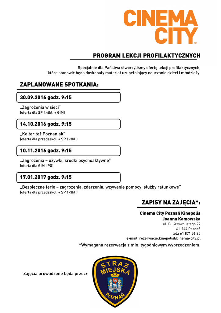 PROGRAM LEKCJI PROFILAKTYCZNYCH Specjalnie dla Państwa stworzyliśmy ofertę lekcji profilaktycznych, które stanowić będą doskonały materiał uzupełniający nauczanie dzieci i młodzieży. ZAPLANOWANE SPOTKANIA: 30.09.2016 godz. 9:15 „Zagrożenia w sieci” (oferta dla SP 4-6kl. + GIM) 14.10.2016 godz. 9:15 „Kejter też Poznaniak” (oferta dla przedszkoli + SP 1-3kl.) 10.11.2016 godz. 9:15 „Zagrożenia – używki, środki psychoaktywne” (oferta dla GIM i PG) 17.01.2017 godz. 9:15 „Bezpieczne ferie – zagrożenia, zdarzenia, wzywanie pomocy, służby ratunkowe” (oferta dla przedszkoli + SP 1-3kl.) ZAPISY NA ZAJĘCIA*: Cinema City Poznań Kinepolis Joanna Kamowska ul. B. Krzywoustego 72 61-144 Poznań tel.: 61 871 56 25 e-mail: [email protected] *Wymagana rezerwacja z min. tygodniowym wyprzedzeniem. Zajęcia prowadzone będą przez: