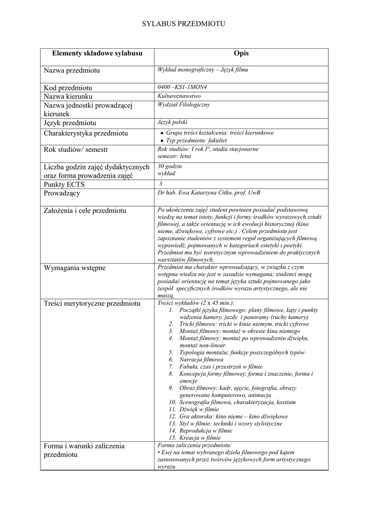 SYLABUS PRZEDMIOTU Elementy składowe sylabusu Opis Nazwa przedmiotu Wykład monograficzny – Język filmu Kod przedmiotu Nazwa kierunku Nazwa jednostki prowadzącej kierunek Język przedmiotu Charakterystyka przedmiotu 0400 –KS1-1MON4 Kulturoznawstwo Wydział Filologiczny Rok studiów/ semestr Język polski Grupa treści kształcenia: treści kierunkowe Typ przedmiotu: fakultet Rok studiów: I rok I°, studia stacjonarne semestr: letni Liczba godzin zajęć dydaktycznych oraz forma prowadzenia zajęć Punkty ECTS Prowadzący 30 godzin wykład Założenia i cele przedmiotu Po ukończeniu zajęć student powinien posiadać podstawową wiedzę na temat istoty, funkcji i formy środków wyrazowych sztuki filmowej, a także orientację w ich ewolucji historycznej (kino nieme, dźwiękowe, cyfrowe etc.) . Celem przedmiotu jest zapoznanie studentów z systemem reguł organizujących filmową wypowiedź, pojmowanych w kategoriach estetyki i poetyki. Przedmiot ma być teoretycznym wprowadzeniem do praktycznych warsztatów filmowych. Przedmiot ma charakter wprowadzający, w związku z czym wstępna wiedza nie jest w zasadzie wymagana; studenci mogą posiadać orientację na temat języka sztuki pojmowanego jako zespół specyficznych środków wyrazu artystycznego, ale nie muszą. Treści wykładów (2 x 45 min.): 1. Początki języka filmowego: plany filmowe, kąty i punkty widzenia kamery, jazdy i panoramy (ruchy kamery) 2. Tricki filmowe: tricki w kinie niemym, tricki cyfrowe 3. Montaż filmowy: montaż w okresie kina niemego 4. Montaż filmowy: montaż po wprowadzeniu dźwięku, montaż non-linear 5. Typologia montażu; funkcje poszczególnych typów 6. Narracja filmowa 7. Fabuła, czas i przestrzeń w filmie 8. Koncepcja formy filmowej: forma i znaczenie, forma i emocje 9. Obraz filmowy: kadr, ujęcie, fotografia, obrazy generowane komputerowo, animacja 10. Scenografia filmowa, charakteryzacja, kostium 11. Dźwięk w filmie 12. Gra aktorska: kino nieme – kino dźwiękowe 13. Styl w filmie: techniki i wzory stylistyczne 14. Reprodukcja w filmie 15. Kreacja w filmie Forma zaliczenia przedmiotu: • Esej na temat wybranego dzieła filmowego pod kątem zastosowanych przez twórców językowych form artystycznego wyrazu Wymagania wstępne Treści merytoryczne przedmiotu Forma i warunki zaliczenia przedmiotu 3 Dr hab. Ewa Katarzyna Citko, prof. UwB Wykaz literatury podstawowej i uzupełniającej Literatura podstawowa: D. Bordwell, K. Thompson, Film Art. Sztuka filmowa, Warszawa 2010 J. Płażewski, Język filmu, Warszawa 1982 M. Przylipiak, Kino stylu zerowego, Warszawa 1998 red. E. Nurczyńska-Fidelska, K. Klejsa, T. Kłys, P. Sitarski, Kino bez tajemnic, Warszawa 2009 A. Helman, A. Pitrus, Podstawy wiedzy o filmie, Gdańsk 2008 M. Hendrykowski, Język ruchomych obrazów, Poznań 1999 S.D. Katz, Reżyseria filmowa ujęcie po ujęciu, Warszawa 2007 D. Arijon, Gramatyka języka filmowego, Warszawa 2008 Literatura uzupełniająca: red. T. Lubelski (i in.), Encyklopedia kina, Kraków 2003 A. Zalewski, Strategiczna dezorientacja. Perypetie rozumu w fabularnym filmie postmodernistycznym, Warszawa 1998 red. K. Klejsa, T. Kłys, Film: fabryka emocji, Kraków 2003 Katarzyna Citko