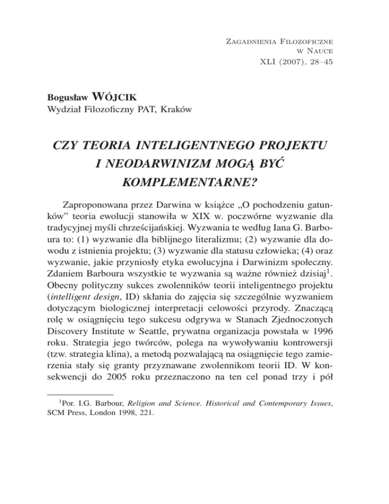 Zagadnienia Filozoficzne w Nauce XLI (2007), 28–45 Bogusław WÓJCIK Wydział Filozoficzny PAT, Kraków CZY TEORIA INTELIGENTNEGO PROJEKTU I NEODARWINIZM MOGĄ BYĆ KOMPLEMENTARNE? Zaproponowana przez Darwina w książce „O pochodzeniu gatunków” teoria ewolucji stanowiła w XIX w. poczwórne wyzwanie dla tradycyjnej myśli chrześcijańskiej. Wyzwania te według Iana G. Barboura to: (1) wyzwanie dla biblijnego literalizmu; (2) wyzwanie dla dowodu z istnienia projektu; (3) wyzwanie dla statusu człowieka; (4) oraz wyzwanie, jakie przyniosły etyka ewolucyjna i Darwinizm społeczny. Zdaniem Barboura wszystkie te wyzwania są ważne również dzisiaj1 . Obecny polityczny sukces zwolenników teorii inteligentnego projektu (intelligent design, ID) skłania do zajęcia się szczególnie wyzwaniem dotyczącym biologicznej interpretacji celowości przyrody. Znaczącą rolę w osiągnięciu tego sukcesu odgrywa w Stanach Zjednoczonych Discovery Institute w Seattle, prywatna organizacja powstała w 1996 roku. Strategia jego twórców, polega na wywoływaniu kontrowersji (tzw. strategia klina), a metodą pozwalającą na osiągnięcie tego zamierzenia stały się granty przyznawane zwolennikom teorii ID. W konsekwencji do 2005 roku przeznaczono na ten cel ponad trzy i pół 1 Por. I.G. Barbour, Religion and Science. Historical and Contemporary Issues, SCM Press, London 1998, 221. Czy teoria inteligentnego projektu i neodarwinizm... 29 miliona dolarów, dzięki czemu wydano między innymi 50 opracowań książkowych poświęconych teorii ID2 . 1. ZAŁOŻENIA TEORII ID Zwolenników teorii ID oskarża się o nadnaturalizm. Przypisują oni bowiem często Bogu pewien zamiar wobec świata, którego nie można odkryć w ramach badań przyrodniczych, ze względu na ograniczenia metodologiczne. Tym samym pomijają oni jednak fakt, że współczesne opracowania z zakresu filozofii nauki wyraźnie odróżniają naturalizm metodologiczny od naturalizmu ontologicznego (metafizycznego). Zgodnie z założeniami naturalizmu metodologicznego, nauka nie zajmuje się Bogiem, ponieważ ze względu na aparat badawczy jest On poza jej zasięgiem. Nauki przyrodnicze dostarczają więc wiedzy o świecie i w tym przypadku nie można podważać ich skuteczności, tylko dlatego, że nie mówią o wszystkim. Zwolennicy teorii ID zniekształcając metodologiczny status nauki, sami formułują swoje argumenty odwołując się do danych naukowych. Sytuacja ta pozostaje następstwem związków teorii ID z kreacjonizmem, którego zwolennicy utrzymują, że świat w dzisiejszym kształcie został powołany do istnienia w jednym boskim akcie stwórczym. Ponieważ wraz z postępem naukowym stawało się oczywiste, że jest to scenariusz nieprawdopodobny, zwolennicy teorii ID, jako słabszej wersji kreacjonizmu3 , zmienili taktykę eksplanacyjną. Jednorazowy akt stwórczy zastąpiono w tym podejściu koncepcją projektu, która stwierdza, że 2 Por. M. Hewlett, T. Peters, „Who Sets the Evolution Agenda?”, Theology and Science, Vol. 4, No. 1 (2006), 1. 3 „Ruch ID z pewnością można uznać za grupę na ogół głoszącą poglądy kreacjonistyczne — na ogół, ponieważ niektórzy jego członkowie są agnostykami. Istnieją dwie główne formy kreacjonizmu: biblijny i naukowy. Kreacjonizm biblijny opiera się wyłącznie na analizie tekstów zawartych w Biblii, a kreacjonizm naukowy stara się swoje twierdzenia uzasadniać tak, jak to się robi w naukach przyrodniczych, a przynajmniej takie wygłasza deklaracje. Kreacjonizm naukowy może, co prawda, inspirować się Biblią, ale nie musi. Kreacjonizm naukowy nie inspirowany Biblią odwołuje się do interpretowania faktów naukowych bez uprzedniego kierowania się jakimiś religijnymi założeniami (deklaracja ta jest przedmiotem ostrej krytyki ze strony 30 Bogusław Wójcik złożoność wszechświata oraz cechy żyjących organizmów można wyjaśnić odwołując się jedynie do „inteligentnej przyczyny”, a nie „ślepych” i „przypadkowych” mechanizmów przyrodniczych. Zwolennicy teorii ID uznają tym samym, że istnieją pewne procesy przyrodnicze, które można ująć w ramach opisów naturalistycznych, lecz należy odróżnić je od tych, w których konieczny był jakiś czynnik rozumny. Należy jednak zauważyć, że obok tej najbardziej rozpowszechnionej interpretacji teorii ID pojawiają się inne ujęcia. Kazimierz Jodkowski uważa, że „oskarżenie teorii ID o zamaskowany kreacjonizm jest nadużyciem i próbą łatwego zdyskredytowania tej teorii”4 . W tym podejściu teoria ID nie jest antyewolucjonistyczna, jest zgodna z naturalizmem metodologicznym, a ponadto „nie tylko nie identyfikuje projektanta z Bogiem, ale twierdzi też, że taka identyfikacja — gdyby ktoś chciał ją przeprowadzić na podstawie samej tylko analizy przedmiotowej — jest niemożliwa, a przynajmniej bardzo trudna”5 . Antynaturalizm teorii ID sprowadza się więc jedynie do przyjęcia, że „bezosobowe i nieinteligentne przyczyny nie wystarczają, by wyjaśnić zarówno powstanie samego życia, jak i późniejsze wyewoluowanie rozmaitych jego form”6 . przeciwników kreacjonizmu)”. D. Sagan, „Retoryczna historia Ruchu Inteligentnego Projektu”, Diametros nr 4 (czerwiec 2005), 78. 4 K. Jodkowski, „Antynaturalizm teorii inteligentnego projektu”, Roczniki Filozoficzne, Tom LIV, numer 2 (2006), 72. 5 Tamże, 69. „Epistemicznym układem odniesienia ewolucjonizmu jest naturalizm metodologiczny. Takim układem odniesienia kreacjonizmu jest metodologiczny nadnaturalizm. Ale układ odniesienia teorii inteligentnego projektu jest szerszy, bo zgodny z oboma poprzednimi”. K. Jodkowski, „Epistemiczny układ odniesienia teorii inteligentnego projektu”, Filozofia Nauki, rok XIV, (2006), 104. „Inteligentny projekt nie zakłada ani stwórcy, ani cudów. Teologicznie inteligentny projekt jest minimalistyczny. Wykrywa on inteligencję bez spekulacji na temat natur
