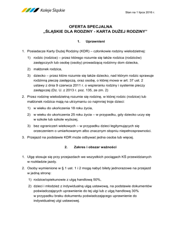 Stan na 1 lipca 2016 r. OFERTA SPECJALNA „ŚLĄSKIE DLA RODZINY - KARTA DUŻEJ RODZINY” 1. Uprawnieni 1. Posiadacze Karty Dużej Rodziny (KDR) – członkowie rodziny wielodzietnej: 1) rodzic (rodzice) – przez którego rozumie się także rodzica (rodziców) zastępczych lub osobę (osoby) prowadzącą rodzinny dom dziecka, 2) małżonek rodzica, 3) dziecko – przez które rozumie się także dziecko, nad którym rodzic sprawuje rodzinną pieczę zastępczą, oraz osobę, o której mowa w art. 37 ust. 2 ustawy z dnia 9 czerwca 2011 r. o wspieraniu rodziny i systemie pieczy zastępczej (Dz. U. z 2013 r. poz. 135, ze zm. 2) 2. Przez rodzinę wielodzietną rozumie się rodzinę, w której rodzic (rodzice) lub małżonek rodzica mają na utrzymaniu co najmniej troje dzieci: 1) w wieku do ukończenia 18 roku życia, 2) w wieku do ukończenia 25 roku życia – w przypadku, gdy dziecko uczy się w szkole lub szkole wyższej, 3) bez ograniczeń wiekowych – w przypadku dzieci legitymujących się orzeczeniem o umiarkowanym albo znacznym stopniu niepełnosprawności. 3. Przejazd na podstawie KDR może odbywać jedna osoba lub więcej. 2. Zakres i obszar ważności 1. Ulgę stosuje się przy przejazdach we wszystkich pociągach KŚ przewidzianych w rozkładzie jazdy. 2. Osoby wymienione w § 1 ust. 1 i 2 mogą nabyć bilety jednorazowe na przejazd w jedną stronę: 1) rodzice/opiekunowie z ulgą handlową 50%, 2) dzieci i młodzież z indywidualną ulgą ustawową, na podstawie dokumentów poświadczających uprawnienie do tej ulgi lub z ulgą handlową 30% w przypadku braku dokumentu poświadczającego uprawnienie do indywidualnej ulgi ustawowej. 3. Warunki stosowania 1. Bilety można nabyć w kasach biletowych KŚ, w biletomatach, w systemie internetowej sprzedaży biletów e-KŚ, w „punktach na mieście” najwcześniej na 7 dni przed dniem wyjazdu oraz w pociągach u personelu pokładowego wyłącznie w dniu wyjazdu. 2. Oferta obowiązuje od dnia poprzedzającego dzień wolny od pracy od godz. 14:00, do ostatniego dnia wolnego od pracy do godz. 24:00. 3. Bilet uprawnia do ulgowego przejazdu jednorazowego, w terminie ważności określonym na bilecie: 1) do 100 km wynosi 6 godzin, 2) powyżej 100 km wynosi 1 dzień. 4. Ulgę handlową 50% i 30% stosuje się na podstawie Karty Dużej Rodziny (KDR) (wzór karty stanowi załącznik Nr 1 do niniejszej oferty). 5. Ulgę ustawową dla dzieci i młodzieży, stosuje się na podstawie dokumentów poświadczających uprawnienie do tej ulgi. 6. Oferty dla posiadaczy „KARTY DUŻEJ RODZINY” nie łączy się z innymi ofertami. strona 2 z 6 4. Opłaty Tabela 1. Bilety jednorazowe z ulgą handlową 30% Za odległość w km do 5 6 - 10 11 - 15 16 - 20 21 - 25 26 - 30 31 - 35 36 - 40 41 - 45 46 - 50 51 - 55 56 - 60 61 - 70 71 - 80 81 - 90 91 - 100 101 - 110 111 - 120 121 - 140 141 - 160 161 - 180 181 - 200 201 - 220 221 - 240 241 - 260 261 - 280 281 - 300 301 - 320 321 - 340 341 - 360 361 - 380 381 - 400 401 - 420 421 - 440 441 - 460 461 - 480 481 - 500 501 - 520 521 - 540 541 - 560 561 - 580 581 - 600 601 - 620 621 - 640 641 - 660 661 - 680 681 - 700 701 - 720 721 - 740 741 - 760 761 - 780 781 - 800 Ceny biletów Cena brutto PTU 2,80 3,50 4,20 4,90 5,60 6,30 7,00 7,70 8,40 9,10 9,80 10,50 11,20 11,90 13,30 14,00 14,70 15,40 16,10 16,80 17,50 18,20 18,90 19,25 19,60 19,95 20,30 20,65 21,00 21,35 21,70 22,05 22,40 22,75 23,10 23,45 23,80 24,15 24,50 24,85 25,20 25,55 25,90 26,25 26,60 26,95 27,30 27,65 28,00 28,35 28,70 29,05 w złotych 0,21 0,26 0,31 0,36 0,41 0,47 0,52 0,57 0,62 0,67 0,73 0,78 0,83 0,88 0,99 1,04 1,09 1,14 1,19 1,24 1,30 1,35 1,40 1,43 1,45 1,48 1,50 1,53 1,56 1,58 1,61 1,63 1,66 1,69 1,71 1,74 1,76 1,79 1,81 1,84 1,87 1,89 1,92 1,94 1,97 2,00 2,02 2,05 2,07 2,10 2,13 2,15 Cena netto 2,59 3,24 3,89 4,54 5,19 5,83 6,48 7,13 7,78 8,43 9,07 9,72 10,37 11,02 12,31 12,96 13,61 14,26 14,91 15,56 16,20 16,85 17,50 17,82 18,15 18,47 18,80 19,12 19,44 19,77 20,09 20,42 20,74 21,06 21,39 21,71 22,04 22,36 22,69 23,01 23,33 23,66 23,98 24,31 24,63 24,95 25,28 25,60 25,93 26,25 26,57 26,90 strona 3 z 6 Tabela 2. Bilety jednorazowe z ulgą handlową 50% Ceny biletów Za odległość w km do 5 6 - 10 11 - 15 16 - 20 21 - 25 26 - 30 31 - 35 36 - 40 41 - 45 45 - 50 51 - 55 56 - 60 60 - 70 71 - 80 81 - 90 91 - 100 101 - 110 111 - 120 121 - 140 141 - 160 161 - 180 181 - 200 201 - 220 221 - 240 241 - 260 261 - 280 281 - 300 301 - 320 321 - 340 341 - 360 361 - 380 381 - 400 401 - 420 421 - 440 441 - 460 461 - 480 481 - 500 501 - 520 521 - 540 541 - 560 561 - 580 581 - 600 601 - 620 621 - 640 641 - 660 661 - 680 681 - 700 701 - 720 721 - 740 741 - 760 761 - 780 781 - 800 Cena brutto PTU 2,00 2,50 3,00 3,50 4,00 4,50 5,00 5,50 6,00 6,50 7,00 7,50 8,00 8,50 9,50 10,00 10,50 11,00 11,50 12,00 12,50 13,00 13,50 13,75 14,00 14,25 14,50 14,75 15,00 15,25 15,50 15,75 16,00 16,25 16,50 16,75 17,00 17,25 17,50 17,75 18,00 18,25 18,50 18,75 19,00 19,25 19,50 19,75 20,00 20,25 20,50 20,75 w złotych 0,15 0,19 0,22 0,26 0,30 0,33 0,37 0,41 0,44 0,48 0,52 0,56 0,59 0,63 0,70 0,74 0,78 0,81 0,85 0,89 0,93 0,96 1,00 1,02 1,04 1,06 1,07 1,09 1,11 1,13 1,15 1,17 1,19 1,20 1,22 1,24 1,26 1,28 1,30 1,31 1,33 1,35 1,37 1,39 1,41 1,43 1,44 1,46 1,48 1,50 1,52 1,54 Cena netto 1,85 2,31 2,78 3,24 3,70 4,17 4,63 5,09 5,56 6,02 6,48 6,94 7,41 7,87 8,80 9,26 9,72 10,19 10,65 11,11 11,57 12,04 12,50 12,73 12,96 13,19 13,43 13,66 13,89 14,12 14,35 14,58 14,81 15,05 15,28 15,51 15,74 15,97 16,20 16,44 16,67 16,90 17,13 17,36 17,59 17,82 18,06 18,29 18,52 18,75 18,98 19,21 strona 4 z 6 5. Zmiana umowy przewozu 1. Zmiany umowy przewozu w zakresie przejazdu poza stację przeznaczenia, drogą inną oraz terminu wyjazdu można dokonać na warunkach określonych w § 8-11 TP-KŚ oraz § 12 ust. 4 RPO-KŚ. 2. Przejście do pociągu innego przewoźnika nie jest dozwolone. 6. Inne W sprawach nieuregulowanych w niniejszych warunkach stosuje się odpowiednie postanowienia Regulaminu przewo