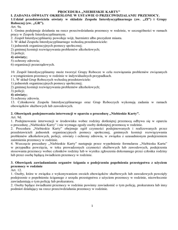 PROCEDURA „NIEBIESKIE KARTY” I. ZADANIA OŚWIATY OKREŚLONE W USTAWIE O PRZECIWDZIAŁANIU PRZEMOCY. 1.Udział przedstawiciela oświaty w składzie Zespołu Interdyscyplinarnego (zw. „ZI”) i Grupy Roboczej (zw. „GR”). Art. 9a. 1. Gmina podejmuje działania na rzecz przeciwdziałania przemocy w rodzinie, w szczególności w ramach pracy w Zespole Interdyscyplinarnym. 2. Zespół Interdyscyplinarny powołuje wójt, burmistrz albo prezydent miasta. 3. W skład Zespołu Interdyscyplinarnego wchodzą przedstawiciele: 1) jednostek organizacyjnych pomocy społecznej; 2) gminnej komisji rozwiązywania problemów alkoholowych; 3) policji; 4) oświaty; 5) ochrony zdrowia; 6) organizacji pozarządowych. 10. Zespół Interdyscyplinarny może tworzyć Grupy Robocze w celu rozwiązania problemów związanych z wystąpieniem przemocy w rodzinie w indywidualnych przypadkach. 11. W skład Grup Roboczych wchodzą przedstawiciele: 1) jednostek organizacyjnych pomocy społecznej; 2) gminnej komisji rozwiązywania problemów alkoholowych; 3) policji; 4) oświaty; 5) ochrony zdrowia. 13. Członkowie Zespołu Interdyscyplinarnego oraz Grup Roboczych wykonują zadania w ramach obowiązków służbowych lub zawodowych. 2. Obowiązek podejmowania interwencji w oparciu o procedurę ,,Niebieskie Karty”. Art. 9d. 1. Podejmowanie interwencji w środowisku wobec rodziny dotkniętej przemocą odbywa się w oparciu o procedurę ,,Niebieskie Karty” i nie wymaga zgody osoby dotkniętej przemocą w rodzinie. 2. Procedura „Niebieskie Karty” obejmuje ogół czynności podejmowanych i realizowanych przez przedstawicieli jednostek organizacyjnych pomocy społecznej, gminnych komisji rozwiązywania problemów alkoholowych, policji, oświaty i ochrony zdrowia, w związku z uzasadnionym podejrzeniem zaistnienia przemocy w rodzinie. 4. Wszczęcie procedury ,,Niebieskie Karty” następuje przez wypełnienie formularza ,,Niebieska Karta” w przypadku powzięcia, w toku prowadzonych czynności służbowych lub zawodowych, podejrzenia stosowania przemocy wobec członków rodziny lub w wyniku zgłoszenia dokonanego przez członka rodziny lub przez osobę będącą świadkiem przemocy w rodzinie. 3. Obowiązek zawiadamiania organów ścigania o podejrzeniu popełnienia przestępstwa z użyciem przemocy w rodzinie Art. 12. 1. Osoby, które w związku z wykonywaniem swoich obowiązków służbowych lub zawodowych powzięły podejrzenie o popełnieniu ściganego z urzędu przestępstwa z użyciem przemocy w rodzinie, niezwłocznie zawiadamiają o tym policję lub prokuratora. 2. Osoby będące świadkami przemocy w rodzinie powinny zawiadomić o tym policję, prokuratora lub inny podmiot działający na rzecz przeciwdziałania przemocy w rodzinie. 1 II. ZADANIA Z ROZPORZĄDZENIA RADY MINISTRÓW W SPRAWIE PROCEDURY „NIEBIESKIE KARTY” - dotyczące oświaty. § 15. W ramach procedury przedstawiciel oświaty: 1) podejmuje działania, o których mowa w § 11 pkt 2 lit. a i c oraz pkt 3 i 5; 2) diagnozuje sytuację i potrzeby osoby, co do której istnieje podejrzenie, że jest dotknięta przemocą w rodzinie, w tym w szczególności wobec dzieci; 3) udziela kompleksowych informacji rodzicowi, opiekunowi prawnemu, faktycznemu lub osobie najbliższej o możliwościach pomocy psychologicznej prawnej, socjalnej i pedagogicznej oraz wsparcia w rodzinie, w tym o formach pomocy dzieciom świadczonych przez instytucje i podmioty na rzecz osób dotkniętych przemocą w rodzinie. Zaleca się, aby każda szkoła, w porozumieniu z instytucjami lokalnymi zaangażowanymi w działania związane z przeciwdziałaniem przemocy w rodzinie, opracowała materiał informacyjny w dowolnej formie - w którym zostaną zawarte informacje o miejscach i zakresie dostępnej pomocy. § 11. W ramach procedury pracownik socjalny jednostki organizacyjnej pomocy społecznej: 1) diagnozuje sytuację i potrzeby osoby, co do której istnieje podejrzenie, że jest dotknięta przemocą w rodzinie; 2) udziela kompleksowych informacji o: a) możliwościach uzyskania pomocy, w szczególności psychologicznej, prawnej, socjalnej i pedagogicznej, oraz wsparcia, w tym o instytucjach i podmiotach świadczących specjalistyczną pomoc na rzecz osób dotkniętych przemocą w rodzinie; b) formach pomocy dzieciom doznającym przemocy w rodzinie oraz instytucjach i podmiotach świadczących tę pomoc; c) możliwościach podjęcia dalszych działań mających na celu poprawę sytuacji osoby, co do której istnieje podejrzenie, że jest dotknięta przemocą w rodzinie; 3) organizuje niezwłocznie dostęp do pomocy medycznej, jeżeli wymaga tego stan zdrowia osoby, co do której istnieje podejrzenie, że jest dotknięta przemocą w rodzinie; 4) zapewnia osobie, co do której istnieje podejrzenie, że jest dotknięta przemocą w rodzinie, w zależności od potrzeb, schronienie w całodobowej placówce świadczącej pomoc, w tym w szczególności w specjalistycznym ośrodku wsparcia dla ofiar przemocy w rodzinie; 5) może prowadzić rozmowy z osobami, wobec których istnieje podejrzenie, że stosują przemoc w rodzinie, na temat konsekwencji stosowania przemocy w rodzinie oraz informuje te osoby o możliwościach podjęcia leczenia lub terapii i udziale w programach oddziaływań korekcyjnoedukacyjnych dla osób stosujących przemoc w rodzinie. Zaleca się, aby każda szkoła gromadziła informacje i wiedzę o takich programach i możliwościach – miejscach ich realizacji. 2 III. ZADANIA SZKÓŁ I PRACOWNIKÓW OŚWIATY Każda placówka oświatowa, udzielając pomocy krzywdzonemu dziecku powinna kierować się następującymi zasadami: 1. Nadzór nad działaniami związanymi z pomocą sprawuje dyrektor placówki oświatowej, który udziela wsparcia i pomocy osobom bezpośrednio zaangażowanym w pomoc danemu dziecku. 2. Pedagog szkolny powinien być koordynatorem pomocy krzywdzonemu dziecku. Dyrektor szkoły może powierzyć zadania związane z koordynacją innej osobie, przy
