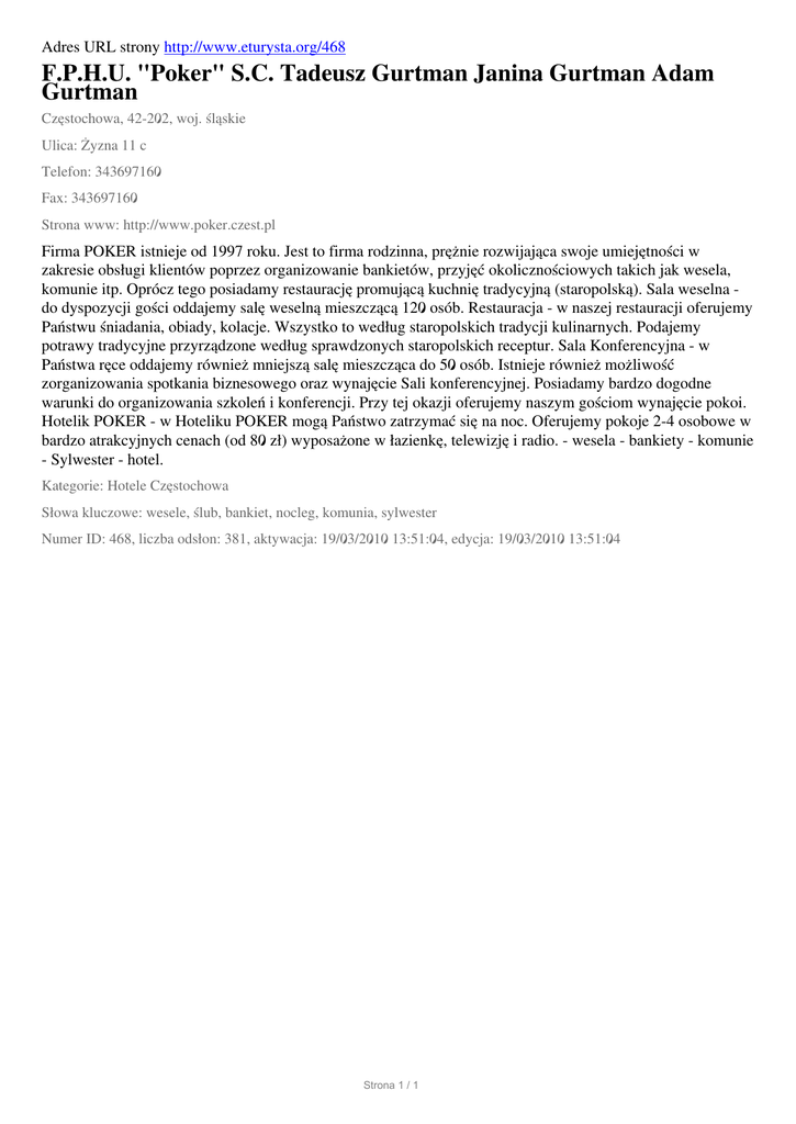 Adres URL strony http://www.eturysta.org/468 F.P.H.U. "Poker" S.C. Tadeusz Gurtman Janina Gurtman Adam Gurtman Częstochowa, 42-202, woj. śląskie Ulica: Żyzna 11 c Telefon: 343697160 Fax: 343697160 Strona www: http://www.poker.czest.pl Firma POKER istnieje od 1997 roku. Jest to firma rodzinna, prężnie rozwijająca swoje umiejętności w zakresie obsługi klientów poprzez organizowanie bankietów, przyjęć okolicznościowych takich jak wesela, komunie itp. Oprócz tego posiadamy restaurację promującą kuchnię tradycyjną (staropolską). Sala weselna do dyspozycji gości oddajemy salę weselną mieszczącą 120 osób. Restauracja - w naszej restauracji oferujemy Państwu śniadania, obiady, kolacje. Wszystko to według staropolskich tradycji kulinarnych. Podajemy potrawy tradycyjne przyrządzone według sprawdzonych staropolskich receptur. Sala Konferencyjna - w Państwa ręce oddajemy również mniejszą salę mieszcząca do 50 osób. Istnieje również możliwość zorganizowania spotkania biznesowego oraz wynajęcie Sali konferencyjnej. Posiadamy bardzo dogodne warunki do organizowania szkoleń i konferencji. Przy tej okazji oferujemy naszym gościom wynajęcie pokoi. Hotelik POKER - w Hoteliku POKER mogą Państwo zatrzymać się na noc. Oferujemy pokoje 2-4 osobowe w bardzo atrakcyjnych cenach (od 80 zł) wyposażone w łazienkę, telewizję i radio. - wesela - bankiety - komunie - Sylwester - hotel. Kategorie: Hotele Częstochowa Słowa kluczowe: wesele, ślub, bankiet, nocleg, komunia, sylwester Numer ID: 468, liczba odsłon: 381, aktywacja: 19/03/2010 13:51:04, edycja: 19/03/2010 13:51:04 Strona 1 / 1