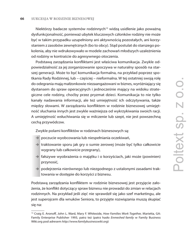 SUKCESJA W RODZINIE BIZNESOWEJ Niektórzy badacze systemów rodzinnych13 widzą usidlenie jako poważną dysfunkcjonalność, ponieważ ubytek kluczowych członków rodziny nie może być w takim przypadku uzupełniony ani aktywnością pozostałych, ani korzystaniem z zasobów zewnętrznych (bo to obcy). Stąd postulat do starszego pokolenia, aby nie wdrukowywało w modele zachowań młodszych uzależnienia od rodziny w kontraście do agresywnego otoczenia. Podstawą zarządzania konfliktami jest właściwa komunikacja. Zwykle odpowiedzialność za jej zorganizowanie spoczywa w naturalny sposób na starszej generacji. Może to być komunikacja formalna, na przykład poprzez spotkania Rady Rodzinnej, lub – częściej – nieformalna. W tej ostatniej swoją rolę do odegrania mają małżonkowie niezaangażowani w biznes, wyróżniający się dystansem do spraw operacyjnych i jednocześnie mający na widoku strategiczne cele rodziny, choćby przez pryzmat dzieci. Komunikacja to nie tylko kanały nadawania informacji, ale też umiejętność ich odczytywania, także między słowami. W zarządzaniu konfliktem w rodzinie biznesowej umiejętność słuchania innych jest zwykle ważniejsza od wykrzykiwania swoich racji. A umiejętność wsłuchiwania się w milczenie lub szept, nie jest powszechną cechą przywódcow. Zwykle polami konfliktów w rodzinach biznesowych są: poczucie wyobcowania lub niespełniania oczekiwań, traktowanie sporu jak gry o sumie zerowej (może być tylko całkowicie wygrany lub całkowicie przegrany), fałszywe wyobrażenia o majątku i o korzyściach, jaki może (powinien) przynosić, podejrzenia nierównego lub niezgodnego z ustalonymi zasadami trak- towania w dostępie do korzyści z biznesu. Podstawą zarządzania konfliktem w rodzinie biznesowej jest przyjęcie założenia, że konflikt dotyczący spraw biznesu nie prowadzi do zmian w relacjach rodzinnych. Na przykład jeśli zięć nie sprawdził się jako szef marketingu, ale jest superojcem dla wnuków Seniora, to przyjęte rozwiązania muszą skupiać się na: 13 Craig E. Aronoff, John L. Ward, Mary F. Whiteside, How Families Work Together, Marietta, GA: Family Enterprise Publisher 1993, patrz też (patrz hasło Enmeshed family w Family Business Wiki.org pod adresem http://www.familybusinesswiki.org) Poltext sp. z o.o. 66