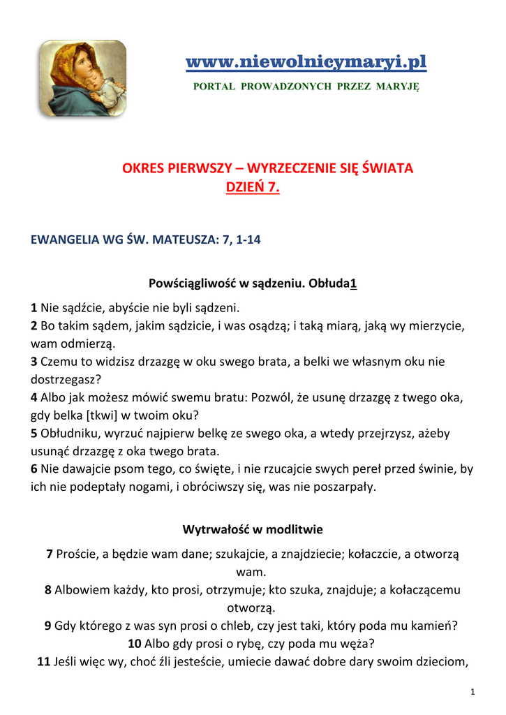 www.niewolnicymaryi.pl PORTAL PROWADZONYCH PRZEZ MARYJĘ OKRES PIERWSZY – WYRZECZENIE SIĘ ŚWIATA DZIEŃ 7. EWANGELIA WG ŚW. MATEUSZA: 7, 1-14 Powściągliwość w sądzeniu. Obłuda1 1 Nie sądźcie, abyście nie byli sądzeni. 2 Bo takim sądem, jakim sądzicie, i was osądzą; i taką miarą, jaką wy mierzycie, wam odmierzą. 3 Czemu to widzisz drzazgę w oku swego brata, a belki we własnym oku nie dostrzegasz? 4 Albo jak możesz mówić swemu bratu: Pozwól, że usunę drzazgę z twego oka, gdy belka [tkwi] w twoim oku? 5 Obłudniku, wyrzuć najpierw belkę ze swego oka, a wtedy przejrzysz, ażeby usunąć drzazgę z oka twego brata. 6 Nie dawajcie psom tego, co święte, i nie rzucajcie swych pereł przed świnie, by ich nie podeptały nogami, i obróciwszy się, was nie poszarpały. Wytrwałość w modlitwie 7 Proście, a będzie wam dane; szukajcie, a znajdziecie; kołaczcie, a otworzą wam. 8 Albowiem każdy, kto prosi, otrzymuje; kto szuka, znajduje; a kołaczącemu otworzą. 9 Gdy którego z was syn prosi o chleb, czy jest taki, który poda mu kamień? 10 Albo gdy prosi o rybę, czy poda mu węża? 11 Jeśli więc wy, choć źli jesteście, umiecie dawać dobre dary swoim dzieciom, 1 o ileż bardziej Ojciec wasz, który jest w niebie, da to, co dobre, tym, którzy Go proszą. Złota zasada postępowania 12 Wszystko więc, co byście chcieli, żeby wam ludzie czynili, i wy im czyńcie! Albowiem na tym polega Prawo i Prorocy. Ciasna brama 13 Wchodźcie przez ciasną bramę! Bo szeroka jest brama i przestronna ta droga, która prowadzi do zguby, a wielu jest takich, którzy przez nią wchodzą. 14 Jakże ciasna jest brama i wąska droga, która prowadzi do życia, a mało jest takich, którzy ją znajdują! O NAŚLADOWANIU CHRYSTUSA, KSIĘGA III, Rozdz. 10. 4. Cóż Ci dam za te stokrotne dary? Obym tylko mógł służyć Ci przez wszystkie dni życia! Obym choć przez jeden dzień potrafił godnie wypełniać swoją służbę! Bo Ty godny jesteś wszelkiej służby, wszelkiej czci i wiekuistej chwały. O tak, Tyś jest moim Panem, a ja Twoim ubogim sługą, który oby służył Ci ze wszystkich sił i nigdy nie zmęczył się głoszeniem Twojej chwały. Tego tylko chcę, tego pragnę, a czego mi nie dostaje, racz dopełnić, Panie. 5. Wielka to cześć, wielki zaszczyt być w Twojej służbie i wszystko porzucić dla Ciebie. Jakże to wielka łaska, jeśli ktoś dobrowolnie oddaje się w Twoją najświętszą służbę. Ci, którzy dla Twojej miłości wyrzekną się miłości ziemskiej, odnajdą dogłębną pociechę Ducha Świętego. Ci, którzy dla Twojego imienia wybiorą wąską ścieżkę i wyzbędą się doczesnych trosk, zdobędą prawdziwą wolność ducha. 6. O, jakże szczęśliwa i radosna jest służba Bogu, w której człowiek staje się rzeczywiście wolny i święty. O, jakże święty jest stan zakonnego poddaństwa, który czyni człowieka podobnym aniołom, miłym Bogu, postrachem dla złych duchów, wzorem dla wiernych! O, ukochana i upragniona na zawsze służbo, która obiecujesz najwyższe dobro i pomagasz osiągnąć radość trwającą bez końca. Teraz odmawiamy modlitwy przeznaczone na pierwszy etap. 2