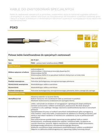 KABLE DO ZASTOSOWAŃ SPECJALNYCH Kable do zastosowań specjalnych w górnictwie i wojskowości służą do transmisji sygnałów cyfrowych i analogowych w całym paśmie optycznym wy korzystywanym we wszystkich systemach transmisji głosu i danych w liniach budowanych w ekstremalnych warunkach użytkowych wymagających dużej odporności mechanicznej kabli. PSKD MIN -40 C MAX +70 C OUTSIDE +70 C -40 C RoHS Polowe kable światłowodowe do specjalnych zastosowań Norma ZN-TF-017 Opis PSKD – polowy kabel światłowodowy (PSKD) KONSTRUKCJA: Włókno optyczne w buforze Jednomodowe (J) Jednomodowe z niezerową przesuniętą dyspersją (Jn) Wielomodowe (G/50) Wielomodowe (G/62,5) ze specjalnym buforem elastycznym w ścisłej tubie Tuba Tuba ścisła Ø 0,9 mm Powłoka wewnętrzna Poliuretan bezhalogenowy nierozprzestrzeniający płomienia Wzmocnienie wewnętrzne Wodnoblokujące włókna aramidowe Wzmocnienie Wodnoblokujące włókna aramidowe Powłoka zewnętrzna Poliuretan bezhalogenowy nierozprzestrzeniający płomienia; koloru szarego lub czarnego CHARAKTERYSTYKA: Identyfikacja tub Sekwencja kolorów na życzenie klienta. Nadruk metryczny oraz oznakowanie kabli są naniesione na powłoce. Możliwość dostosowania oznakowania do wymogów klienta. Właściwości użytkowe Lekkie, wytrzymałe (na działanie sił rozciągających i zgniatających) dzięki podwójnej warstwie wzmocnienia z włókien aramidowych, przeznaczone dla służb zbrojnych i cywilnych w celu szybkiego i łatwego utworzenia światłowodowej łączności w warunkach polowych Zaprojektowane do pracy w trudnych warunkach środowiskowych gdzie wymagane są niska średnica i mała masa kabla, przystosowane do układania na otwartej przestrzeni, pod ziemią w warunkach narażenia na mechaniczne uszkodzenia czy też w pomieszczeniach zamkniętych Dwie poliuretanowe powłoki kabla zapewniają wysoką giętkość kabla w niskich temperaturach, umożliwiają wielokrotne zwijanie i rozwijanie kabla, są odporne na czynniki chemiczne, ścieranie, drgania mechaniczne, uniepalnione dzięki zastosowaniu bezhalogenowego poliuteranu nierozprzestrzeniającego płomienia Wzdłużnie uszczelnione dzięki zastosowaniu wodnoblokujących włókien aramidowych Odporne na zakłócenia elektromagnetyczne, zapewniają szybką transmisję danych 142 Zastosowanie Wojskowa łączność polowa Łączność polowa na terenach gdzie prowadzone są prace geologiczne, górnicze, archeologiczne itp. na otwartej przestrzeni oraz pod ziemią Łączność polowa na terenach przemysłowych, gdzie prowadzone są prace remontowobudowlane szczególnie w przemyśle chemicznym i naftowym, na otwartej przestrzeni i pod ziemią oraz wszędzie tam, gdzie występują narażenia na oddziaływanie szkodliwych czynników chemicznych i mechanicznych Czasowe systemy łączności, przesylania danych oraz sygnałów telewizyjnych np. dla ekip obsługujących przekazy z wydarzeń i imprez na terenie otwartym oraz w obszarach zabudowanych Czasowe systemy nadzoru terenów i obiektów wymagających transmisji sygnałów o dużej przepływności np. z kamer wizyjnych Zakres temperatur Transportu i przechowywania: Instalacji: Pracy: Inne parametry kabla Odporność na zgniot: 3 kN Odporność na udar: 3 Nm Odporność na wielokrotne zginanie: 5000 zgięć Odporność na wielokrotne przewijanie: 100000 cykli Informacje dodatkowe Kable światłowodowe typu PSKD są lekkie i wytrzymałe (maks. siła rozciągająca 2,5 kN) dzięki zastosowaniu dwóch warstw wzmocnienia z włókien aramidowych. Wyjątkowa giętkość kabli, szczególnie w niskich temperaturach (pozytywny test 100 000 cykli wielokrotnego przewijania) osiągnięta została poprzez zastosowanie specjalnego materiału, jakim jest poliuretan. Zastosowanie poliuretanu w wersji uniepalnionej sprawia, że kable mogą pracować także w pomiesczeniach zamkniętych. Wodoszczelność wzdłużną kabli zapewniają włókna aramidowe puchnące pod wpływem wody. Dzięki zastosowaniu specjalego buforu elastycznego na włókanch światłowodych temperatura pracy kabli wynosi od -40 °C do +70 °C. Dodatkowym atutem kabli PSKD jest zastosowanie ścisłych tub osłaniających włókna światłowodowe i umożliwiającycj ich bezpośrednie zakończenie odpowiednimi złączami, również w warunkach polowych. Kable zostały zaprojektowane do stosowania w trudnych warunkach terenowych, zarówno wojskowych jak i cywilnych, na otwartej przestrzeni jak i w pomieszczeniach zamkniętych. Zalecane są szczególnie w przypadku, gdy występuje konieczność wielokroitnego zwijania i rozwijania. Wysoka wytrzymałość na rozciaganie pozwala na stosowanie szybkich zautomatyzowanyh metod zaciągania kabli (np. z jadącego samochodu, wozu bojowego itp.). Transmisja sygnału optycznego zapewnia wysoką przepływność danych, odporność na zakłócenia elektromagnetyczne i brak możliwości podsłuchu Kable te mogą być również wykorzystywane do łączności telewizyjnych wozów transmisyjnych i kamer -55 0C – +75 0C -40 0C – +70 0C -40 0C – +70 0C PARAMETRY: Liczba włókien światłowod. w kablu Średnica zewnętrzna kabla Masa kabla n mm kg/km 2 5,8 24 85 110 4 5,8 25 85 110 6 6,3 29 85 110 8 6,5 32 90 120 12 7,1 38 100 130 Maks. siła ciągnienia Dynamiczna Statyczna Min. promień zginania Dynamiczny N 2500 Statyczny mm 1250 143 TELE - FONIKA Kable I NFORMACJE OGÓLNE KABLE ŚWIATŁOWODOWE Dzisiejsza gospodarka jest w ogromnym stopniu oparta na sprawnym i szybkim przepływie wiedzy i informacji. Ponieważ ilość przesyłanych danych ciągle wzrasta, rośnie też zapotrzebowanie na pasmo przesyłowe. Transmisja danych oparta na kablach miedzianych ma ograniczony potencjał rozwoju i pomimo ciągłego postępu, nie będzie w stanie sprostać przyszłym wymaganiom dotyczącym przesyłu danych. Powszechnie uważa się, że rozwiązaniem najbardziej przyszłościowym są kable światłowodowe, czyli kable w których medium zamiast żył miedzi