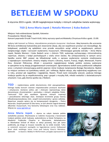 BETLEJEM W SPODKU 6 stycznia 2015 o godz. 18.00 najpiękniejsze kolędy z różnych zakątków świata wykonają: TGD | Anna Maria Jopek | Natalia Niemen | Kuba Badach Miejsce: hala widowiskowa Spodek, Katowice Prowadzenie: Marek Zając Koncert poprzedzi Orszak Trzech Króli, który wyruszy spod archikatedry Chrystusa Króla o godz. 15.00. Jedyny taki koncert w Polsce, niecodzienne przeżycie muzyczne i duchowe. Ideą koncertu dla uczczenia 90-‐lecia archidiecezji katowickiej jest stworzenie okazji, aby we wspólnocie przeżyć coś niezwykłego. By kolędować, podzielić się opłatkiem oraz przede wszystkim wziąć udział w wyjątkowym, pełnym świątecznego ciepła i wzruszeń wydarzeniu muzycznym. Olśniewające gwiazdy estrady – Anna Maria Jopek, Natalia Niemen i Kuba Badach wraz z chórem TGD, wykonają zachwycający różnorodnością repertuar, złożony z kolęd pochodzących z wielu stron świata. Na umiejscowionej w samym sercu Spodka scenie 360° pojawi się kilkadziesiąt osób, a oprawa wydarzenia zostanie zrealizowana z największym rozmachem. Utwory między innymi z Ukrainy, Austrii, Francji, Anglii, Wenezueli, Puerto Rico, Ameryki Północnej, Afryki i oczywiście najpiękniejsze kolędy polskie zostaną wykonane w specjalnie na tę okazję przygotowanych aranżacjach. Zgromadzona wokół sceny publiczność odbędzie wraz z artystami emocjonującą podróż poprzez różne tradycje świętowania Bożego Narodzenia. Będzie tu miejsce zarówno na żywiołową radość, jak i refleksję. Będzie okazja, aby najbardziej wyjątkowy czas w roku, przeżyć jak najpełniej i najpiękniej. Razem. Przed nami niezwykły wieczór, podczas którego tradycja spotka się ze współczesnością, pop i gospel z muzyką folk, młodzi wokaliści z doświadczonymi artystami. Czas, gdy Ziemia spotka się z Niebem. TGD – najsłynniejszy polski ekumeniczny chór pop-‐gospelowy, którego każdy koncert stanowi niepowtarzalne przeżycie duchowe i artystyczne. Zarówno soliści, jak i chórzyści reprezentują różne denominacje chrześcijańskie i pochodzą z różnych zakątków Polski. Twórczość TGD jest wynikiem łączenia różnych inspiracji i poszukiwania własnego stylu. Dzisiejsze brzmienie grupy tworzy kilkudziesięcioosobowy chór, zespół instrumentalny i grono solistów. Repertuar zespołu opiera się na kompozycjach dyrygenta – Piotra Nazaruka. Zespół powstał 32 lata temu, w tym okresie nagrał dziewięć albumów muzycznych, trzy koncerty telewizyjne oraz trzy radiowe. Więcej na: www.tgd.kdm.pl. Anna Maria Jopek – słynna na całym świecie polska wokalistka jazzowa. Wychowana w rodzinie muzycznej z korzeniami tradycji polskiej sztuki ludowej, wykształcona w klasie fortepianu na Akademii Fryderyka Chopina w Warszawie, doświadczona w Manhattan School of Music w sekcji jazzowej, lecz jak sama podkreśla, jej droga w muzyce rozwidla się na wiele ścieżek. Tylko w ostatnich sezonach wystąpiła na legendarnej scenie Hollywood Bowl obok wielkiego Ivana Linsa pod batutą Vince’a Mendozy, śpiewała w duecie z Bobby’m McFerrinem, przyjęła zaproszenie na koncerty z Chrisem Botti, wystąpiła w słynnej Queen Elizabeth Hall i tego samego dnia u boku Nigela Kennedy‘ego w Royal Festival Hall. Przygotowała również światową wersję słynnej płyty Pat Metheny & Anna Maria Jopek „Upojenie“, stworzyła muzykę do filmu animowanego i obdarowała fanów przejmującą, koncertową płytą „Jo & Co“, gdzie partnerują jej m.in. Richard Bona, Mino Cinelu i Dhafer Youssef. www.annamariajopek.pl Natalia Niemen – piosenkarka, autorka muzyki i tekstów. Jako starsza córka Czesława Niemena z muzyką związana jest od najmłodszych lat. Jest absolwentką warszawskiej szkoły muzycznej II stopnia im. Karola Szymanowskiego w klasie altówki. Od ponad dekady współpracuje z zespołami New life’m i TGD. Zarówno w tworzeniu muzyki, jak i w wyrazie wokalnym artystka inspiruje się starym rhytm’n’bluesem, rock’n’rollem, ekspresją pieśniarzy flamenco, ale także chorałem gregoriańskim i muzyką cerkiewną. Osobowość i głos artystki należą do jednych z najbardziej charakterystycznych i nietuzinkowych dzisiejszej muzyki polskiej. Zdjęcie: Mateusz Otremba www.facebook.com/NataliaNiemenOficjalnie Kuba Badach – wokalista, instrumentalista, kompozytor, aranżer, producent muzyczny, lider zespołu Poluzjanci (dawniej Polucjanci) oraz członek grupy The Globetrotters. Od początku poszukiwaniu własnej artystycznej drogi towarzyszyły Kubie sprzyjające okoliczności. Jako niespełna dwunastolatek dołączył do międzynarodowego zespołu musicalu „Peace Child”, a kilka miesięcy później towarzyszył występom muzyków Big Bandu Wiesława Pieregorólki. Spiewał m.in. z Andrzejem Zauchą, Mieczysławem Szcześniakiem, Ryszardem Rynkowskim, Katarzyną Gaertner, Robertem Jansonem, Ewą Bem i Kayah. Ma na swoim koncie także albumy solowe. www.kubabadach.pl Bilety w cenach: 40, 50, 60 i 80 zł będą do nabycia w parafiach oraz w sieciach Ticketpro i Ticketportal. Całkowity dochód z koncertu dofinansuje Światowe Dni Młodzieży 2016.
