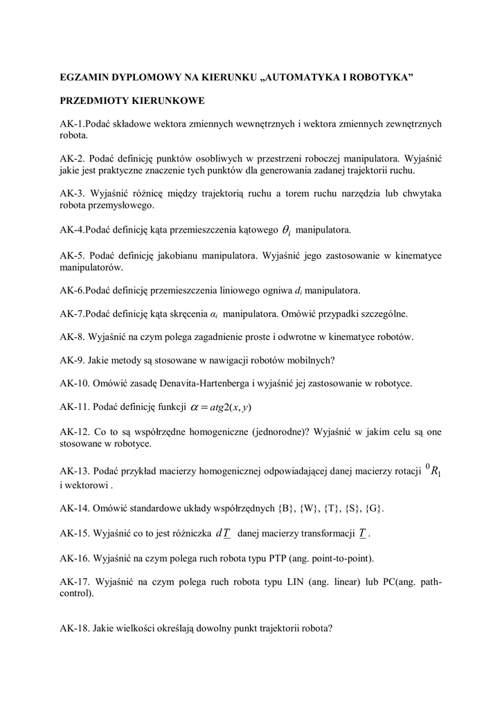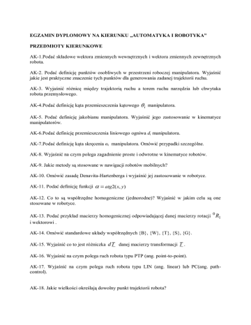EGZAMIN DYPLOMOWY NA KIERUNKU „AUTOMATYKA I ROBOTYKA”