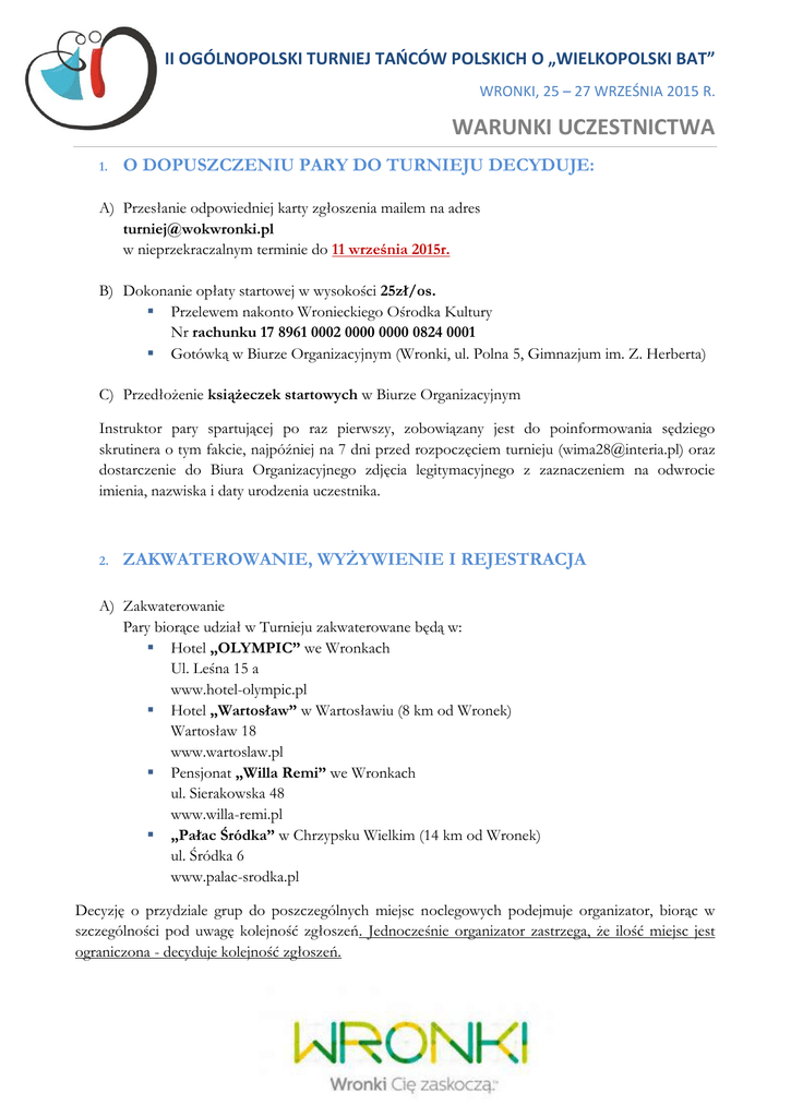 II OGÓLNOPOLSKI TURNIEJ TAŃCÓW POLSKICH O „WIELKOPOLSKI BAT” WRONKI, 25 – 27 WRZEŚNIA 2015 R. WARUNKI UCZESTNICTWA 1. O DOPUSZCZENIU PARY DO TURNIEJU DECYDUJE: A) Przesłanie odpowiedniej karty zgłoszenia mailem na adres [email protected] w nieprzekraczalnym terminie do 11 września 2015r. B) Dokonanie opłaty startowej w wysokości 25zł/os. Przelewem nakonto Wronieckiego Ośrodka Kultury Nr rachunku 17 8961 0002 0000 0000 0824 0001 Gotówką w Biurze Organizacyjnym (Wronki, ul. Polna 5, Gimnazjum im. Z. Herberta) C) Przedłożenie książeczek startowych w Biurze Organizacyjnym Instruktor pary spartującej po raz pierwszy, zobowiązany jest do poinformowania sędziego skrutinera o tym fakcie, najpóźniej na 7 dni przed rozpoczęciem turnieju ([email protected]) oraz dostarczenie do Biura Organizacyjnego zdjęcia legitymacyjnego z zaznaczeniem na odwrocie imienia, nazwiska i daty urodzenia uczestnika. 2. ZAKWATEROWANIE, WYŻYWIENIE I REJESTRACJA A) Zakwaterowanie Pary biorące udział w Turnieju zakwaterowane będą w: Hotel „OLYMPIC” we Wronkach Ul. Leśna 15 a www.hotel-olympic.pl Hotel „Wartosław” w Wartosławiu (8 km od Wronek) Wartosław 18 www.wartoslaw.pl Pensjonat „Willa Remi” we Wronkach ul. Sierakowska 48 www.willa-remi.pl „Pałac Śródka” w Chrzypsku Wielkim (14 km od Wronek) ul. Śródka 6 www.palac-srodka.pl Decyzję o przydziale grup do poszczególnych miejsc noclegowych podejmuje organizator, biorąc w szczególności pod uwagę kolejność zgłoszeń. Jednocześnie organizator zastrzega, że ilość miejsc jest ograniczona - decyduje kolejność zgłoszeń. II OGÓLNOPOLSKI TURNIEJ TAŃCÓW POLSKICH O „WIELKOPOLSKI BAT” WRONKI, 25 – 27 WRZEŚNIA 2015 R. WARUNKI UCZESTNICTWA B) Wyżywienie Śniadania – w miejscu zakwaterowania Obiady i kolację, w miejscu rozgrywania turnieju C) Rejestracja W Biurze Organizacyjnym na terenie Gimnazjum im. Z. Herberta we Wronkach przy ul. Polnej Piątek : od godz. 17:00 do 21:00 Sobota: od godz. 8:00 3. KOSZTY A) Opłata startowa – 25zł/os. B) Opłata akredytacyjna dla uczestników turnieju – 140zł/os. (obejmuje 2 noclegi, wyżywienie od kolacji w dniu 25.09 do obiadu 27.09) dla osób towarzyszących – 165zł/os. (obejmuje 2 noclegi, wyżywienie od kolacji w dniu 25.09 do obiadu 27.09) Opłata akredytacyjna nie pokrywa całości kosztów związanych z zakwaterowaniem i wyżywieniem. Organizator dofinansowuje różnicę ze środków własnych. C) Jeden instruktor z każdego zespołu zwolniony jest z wszelkich opłat. 4. INFORMACJE DODATKOWE Uczestnicy przyjeżdżają na koszt własny i ubezpieczają się we własnym zakresie. 5. DANE KONTAKTOWE Wroniecki Ośrodek Kultury Ul. Poznańska 59 64-510 Wronki tel 67 2540141 [email protected] Jan Galasiński tel. 601989286 [email protected] Hanna Jaworska tel. 695442684 [email protected]