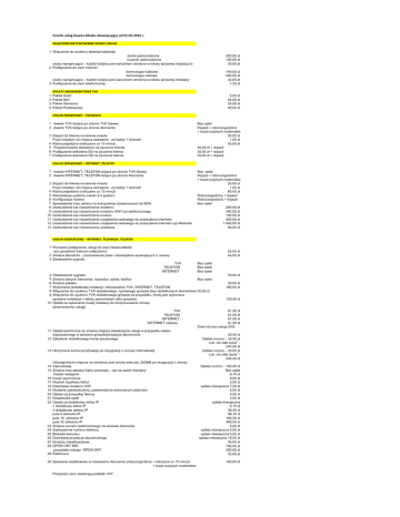 Cennik usług Gawex-Media obowiązujący od 01.05.2016 r. WŁĄCZENIE/AKTYWOWANIE NOWEJ USŁUGI 1 Włączenie do systemu telewizji kablowej 200,00 zł 100,00 zł 30,00 zł domki jednorodzinne budynki wielorodzinne osoby wynajmujące – każde kolejne pod warunkiem istnienia w lokalu sprawnej instalacji tv 2 Podłączenie do sieci internet technologia kablowa technologia radiowa osoby wynajmujące – każde kolejne pod warunkiem istnienia w lokalu sprawnej instalacji 3 Podłączenie do sieci telefonicznej 1 2 3 4 149,00 zł 500,00 zł 30,00 zł 1,23 zł OPŁATY ABONAMENTOWE TVK Pakiet Azart Pakiet Mini Pakiet Standard Pakiet Podstawowy 5,00 zł 25,00 zł 35,00 zł 46,00 zł USŁUGI SERWISOWE – TELEWIZJA 1 Awarie TVK leżące po stronie TVK Gawex 2 Awarie TVK leżące po stronie Abonenta Bez opłat Dojazd + roboczogodzina + koszt zużytych materiałów 25,00 zł 1,00 zł 50,00 zł 40,00 zł + dojazd 35,00 zł + dojazd 35,00 zł + dojazd 3 Dojazd do klienta na terenie miasta Poza miastem od miejsca wezwania - za każdy 1 kilometr 4 Roboczogodzina (naliczane co 15 minut) 5 Programowanie telewizora na życzenie klienta 6 Podłączenie dekodera SD na życzenie klienta 7 Podłączenie dekodera HD na życzenie klienta USŁUGI SERWISOWE – INTERNET, TELEFON 1 Awarie INTERNET, TELEFON leżące po stronie TVK Gawex 2 Awarie INTERNET, TELEFON leżące po stronie Abonenta 3 Dojazd do klienta na terenie miasta Poza miastem od miejsca wezwania - za każdy 1 kilometr 4 Roboczogodzina (naliczane co 15 minut) 5 Reinstalacja systemu (około 2-3 godzin) 6 Konfiguracja routera 7 Sprawdzenie mac adresu na komputerze dostarczonym do BOK 8 Uszkodzenie lub niezwrócenie modemu 9 Uszkodzenie lub niezwrócenie modemu WiFi lub telefonicznego 10 Uszkodzenie lub niezwrócenie routera 11 Uszkodzenie lub niezwrócenie urządzenia radiowego do przesyłania internetu 12 Uszkodzenie lub niezwrócenie urządzenia radiowego do przesyłania internetu typ Motorola 13 Uszkodzenie lub niezwrócenie zasilacza Bez opłat Dojazd + roboczogodzina + koszt zużytych materiałów 25,00 zł 1,00 zł 80,00 zł Roboczogodziny + dojazd Roboczogodzina + dojazd Bez opłat 200,00 zł 350,00 zł 100,00 zł 500,00 zł 1 000,00 zł 60,00 zł USŁUGI DODATKOWE – INTERNET, TELEWIZJA, TELEFON 1 Ponowne podłączenie usługi do sieci Gawex-Media (po uprzednim karnym odłączeniu) 2 Zmiana abonenta – przeniesienie praw i obowiązków wynikających z umowy 3 Zawieszenie sygnału TVK TELEFON INTERNET 4 5 6 7 8 9 10 11 12 13 14 15 16 17 18 19 20 21 22 23 24 25 26 27 28 29 25,00 zł 40,00 zł Bez opłat Bez opłat Bez opłat Odwieszenie sygnału 35,00 zł Zmiana danych Abonenta: nazwisko, adres, telefon Bez opłat Zmiana pakietu 30,00 zł Wykonanie dodatkowej instalacji i aktywowanie TVK, INTERNET, TELEFON 180,00 zł Włączenie do systemu TVK dodatkowego, sprawnego gniazda (bez dodatkowych elementów) 50,00 zł Włączenie do systemu TVK dodatkowego gniazda (w przypadku, kiedy jest wykonana 100,00 zł sprawna instalacja i należy zamontować tylko gniazdo) Opłata za wykonanie nowej instalacji do kontynuowania umowy (przeniesienie usługi) TVK 61,00 zł TELEFON 61,00 zł INTERNET 61,00 zł INTERNET radiowy 61,00 zł Dwie lub trzy usługi 50% Opłata techniczna za zmianę miejsca świadczenia usługi w przypadku lokalu wyposażonego w sprawne gniazdo/przyłącze abonenckie 20,00 zł Założenie dodatkowego konta pocztowego Opłata roczna – 30,00 zł Lub „na całe życie” 244,00 zł Utrzymanie konta pocztowego po rezygnacji z umowy internetowej Opłata roczna – 30,00 zł Lub „na całe życie” 244,00 zł Udostępnienie miejsca na serwerze pod stronę www poj. 200MB po rezygnacji z umowy Opłata roczna – 100,00 zł internetowej Zmiana mac-adresu/ karty sieciowej – raz na sześć miesięcy Bez opłat Każda następna 6,15 zł Koszt upomnienia 8,00 zł 2,00 zł Wydruk duplikatu faktur Dzierżawa modemu WiFi opłata miesięczna 7,00 zł Wydanie zaświadczenia, potwierdzenie dokonanych płatności 5,00 zł Opłata za przesyłkę faktury 5,00 zł Książeczka opłat 3,00 zł Opłata za dodatkowy adres IP opłata miesięczna 1 dodatkowy adres IP 6,15 zł 4 dodatkowe adresy IP 36,90 zł pula 8 adresów IP 96,10 zł pula 16 adresów IP 184,50 zł pula 32 adresów IP 492,00 zł Zmiana numeru telefonicznego na wniosek Abonenta 5,00 zł Zastrzeżenie numeru telefonu opłata miesięczna 5,00 zł Blokada kierunku opłata miesięczna 5,00 zł Dzierżawa przyłącza abonenckiego opłata miesięczna 10,00 zł Gniazdo światłowodowe 30,00 zł GPON ONT 668 700,00 zł pozostałe rodzaje GPON ONT 500,00 zł Patchcord 30,00 zł 30 Spawanie światłowodu w mieszkaniu Abonenta (roboczogodzina - naliczane co 15 minut) + koszt zużytych materiałów Powyższe ceny zawierają podatek VAT. 100,00 zł