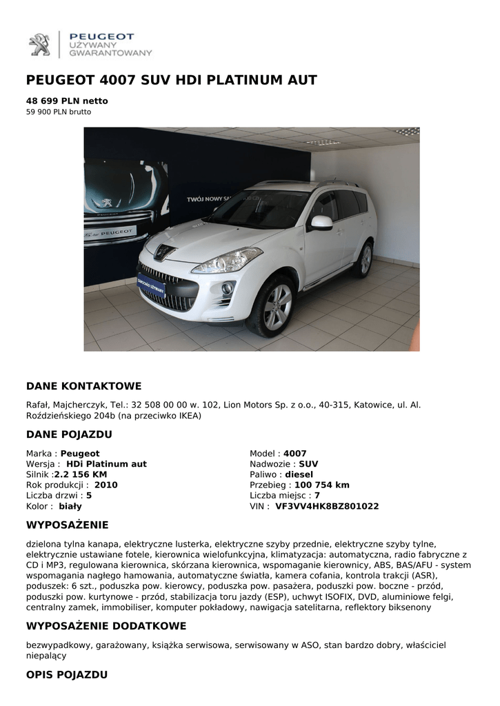 PEUGEOT 4007 SUV HDI PLATINUM AUT 48 699 PLN netto 59 900 PLN brutto DANE KONTAKTOWE Rafał, Majcherczyk, Tel.: 32 508 00 00 w. 102, Lion Motors Sp. z o.o., 40-315, Katowice, ul. Al. Roździeńskiego 204b (na przeciwko IKEA) DANE POJAZDU Marka : Peugeot Wersja : HDi Platinum aut Silnik :2.2 156 KM Rok produkcji : 2010 Liczba drzwi : 5 Kolor : biały Model : 4007 Nadwozie : SUV Paliwo : diesel Przebieg : 100 754 km Liczba miejsc : 7 VIN : VF3VV4HK8BZ801022 WYPOSAŻENIE dzielona tylna kanapa, elektryczne lusterka, elektryczne szyby przednie, elektryczne szyby tylne, elektrycznie ustawiane fotele, kierownica wielofunkcyjna, klimatyzacja: automatyczna, radio fabryczne z CD i MP3, regulowana kierownica, skórzana kierownica, wspomaganie kierownicy, ABS, BAS/AFU - system wspomagania nagłego hamowania, automatyczne światła, kamera cofania, kontrola trakcji (ASR), poduszek: 6 szt., poduszka pow. kierowcy, poduszka pow. pasażera, poduszki pow. boczne - przód, poduszki pow. kurtynowe - przód, stabilizacja toru jazdy (ESP), uchwyt ISOFIX, DVD, aluminiowe felgi, centralny zamek, immobiliser, komputer pokładowy, nawigacja satelitarna, reflektory biksenony WYPOSAŻENIE DODATKOWE bezwypadkowy, garażowany, książka serwisowa, serwisowany w ASO, stan bardzo dobry, właściciel niepalący OPIS POJAZDU Autoryzowany Dealer Peugeot Lion Motors Al. Roździeńskiego 204b, 40-315 Katowice (naprzeciwko IKEA Katowice) OFERUJEMY * Peugeot 4007 2.2 HDi 156 KM Platinium Rodzaj skrzyni: automatyczna Rodzaj paliwa: diesel Rok produkcji: 2010 Data I rejestracji: 30 grudzień 2010 Samochód wyjątkowo zadbany, z niskim przebiegiem 100 754 km. Samochód bezwypadkowy, przebieg oryginalny. Wyjątkowe wnętrze pojazdu dzięki skórzanej tapicerce. Ponadprzeciętnie bogate wyposażenie obejmujące wysokiej klasy system nagłośnienia Hi-Fi Rockford Fostgate, system nawigacji satelitarnej i kamerę cofania. FORMA SPRZEDAŻY * Umowa kupna - sprzedaży, sprzedaż bezpośrednia od pracownika Lion Motors. NAJWAŻNIEJSZE ELEMENTY WYPOSAŻENIA * skórzana tapicerka reflektory ksenonowe Hi-Fi Rockford Fostgate kamera cofania czujniki parkowania skrzynia automatyczna automatyczna klimatyzacja aluminiowe obręcze kół elektrycznie sterowane szyby i lusterka boczne kierownica wielofunkcyjna ESP, ASR, EBD, ABS relingi napęd 4x4 (3 tryby pracy - 2WD, 4WD, 4WD Lock) i wiele innych elementów wyposażenia. WAŻNE INFORMACJE * przyjmujemy samochody używane w rozliczeniu (każdej marki) przy zakupie mogą Państwo skorzystać z finansowania (formalności załatwiamy na miejscu lub zdalnie) Kontakt * Lion Motors. Jakość, która Cię zachwyci. Szybka informacja, 7 dni w tygodniu: Rafał Majcherczyk +48 508 568 735 QR CODE DLA OGŁOSZENIA W SERWISIE UZYWANYGWARANTOWANY.PL Powered by TCPDF (www.tcpdf.org)