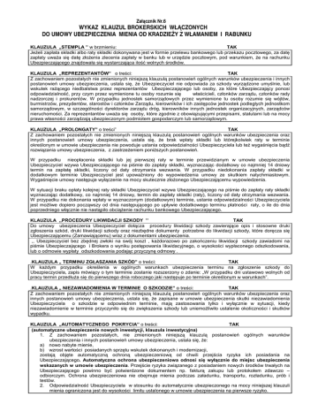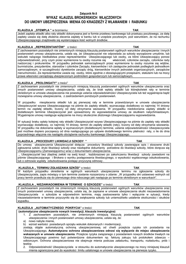 Załącznik Nr.6 WYKAZ KLAUZUL BROKERSKICH WŁĄCZONYCH DO UMOWY UBEZPIECZENIA MIENIA OD KRADZIEŻY Z WŁAMANIEM I RABUNKU KLAUZULA „STEMPLA ” w brzmieniu: TAK Jeżeli zapłata składki albo raty składki dokonywana jest w formie przelewu bankowego lub przekazu pocztowego, za datę zapłaty uważa się datę złożenia zlecenia zapłaty w banku lub w urzędzie pocztowym, pod warunkiem, że na rachunku Ubezpieczającego znajdowała się wystarczająca ilość wolnych środków. KLAUZULA „REPREZENTANTÓW” o treści: TAK Z zachowaniem pozostałych nie zmienionych niniejszą klauzulą postanowień ogólnych warunków ubezpieczenia i innych postanowień umowy ubezpieczenia, ustala się, że Ubezpieczyciel nie odpowiada za szkody wyrządzone umyślnie, lub wskutek rażącego niedbalstwa przez reprezentantów Ubezpieczającego lub osoby, za które Ubezpieczający ponosi odpowiedzialność, przy czym przez wymienione tu osoby rozumie się właścicieli, członków zarządu, członków rady nadzorczej i prokurentów. W przypadku jednostek samorządowych przez wymienione tu osoby rozumie się wójtów, burmistrzów, prezydentów, starostów i członków Zarządu, kierowników i ich zastępców jednostek podległych jednostkom samorządowym, w szczególności dyrektorów zarządu dróg, kierowników innych jednostek organizacyjnych, zarządców nieruchomości. Za reprezentantów uważa się osoby, które zgodnie z obowiązującymi przepisami, statutami lub na mocy prawa własności zarządzają ubezpieczonym podmiotem gospodarczym lub samorządowym. KLAUZULA „PROLONGATY” o treści” TAK Z zachowaniem pozostałych nie zmienionych niniejszą klauzulą postanowień ogólnych warunków ubezpieczenia oraz innych postanowień umowy ubezpieczenia, ustala się, że brak wpłaty składki lub którejkolwiek raty w terminie określonym w umowie ubezpieczenia nie powoduje ustania odpowiedzialności Ubezpieczyciela lub też wygaśnięcia bądź rozwiązania umowy ubezpieczenia, z zastrzeżeniem poniższych postanowień. W przypadku nieopłacenia składki lub jej pierwszej raty w terminie przewidzianym w umowie ubezpieczenia Ubezpieczyciel wzywa Ubezpieczającego na piśmie do zapłaty składki, wyznaczając dodatkowy co najmniej 14 dniowy termin na zapłatę składki, liczony od daty otrzymania wezwania. W przypadku niedokonania zapłaty składki w dodatkowym terminie Ubezpieczyciel jest upoważniony do wypowiedzenia umowy ze skutkiem natychmiastowym. Wygaśnięcie umowy następuje wyłączenie na mocy skutecznie złożonego Ubezpieczającemu wypowiedzenia. W sytuacji braku opłaty kolejnej raty składki Ubezpieczyciel wzywa Ubezpieczającego na piśmie do zapłaty raty składki wyznaczając dodatkowy, co najmniej 14 dniowy, termin do zapłaty składki (raty), liczony od daty otrzymania wezwania. W przypadku nie dokonania wpłaty w wyznaczonym (dodatkowym) terminie, ustanie odpowiedzialności Ubezpieczyciela jest możliwe dopiero począwszy od dnia następującego po upływie dodatkowego terminu płatności raty, o ile do dnia poprzedniego włącznie nie nastąpiło obciążenie rachunku bankowego Ubezpieczającego. KLAUZULA ,,PROCEDURY LIKWIDACJI SZKODY ’’ TAK Do umowy ubezpieczenia Ubezpieczyciel dołącza procedury likwidacji szkody zawierające opis i stosowne druki zgłoszenia szkód, druki likwidacji szkody oraz niezbędne dokumenty potrzebne do likwidacji szkody, które doręcza się Ubezpieczającemu (Zamawiającemu) wraz z dokumentami ubezpieczenia. ,, Ubezpieczyciel bez zbędnej zwłoki na swój koszt , każdorazowo po zakończeniu likwidacji szkody zawiadomi na piśmie Ubezpieczającego i Brokera o wyniku postępowania likwidacyjnego, o wysokości wypłaconego odszkodowania, lub o odmowie wypłaty odszkodowania podając przyczynę odmowy . .KLAUZULA „ TERMINU ZGŁASZANIA SZKÓD” o treści: TAK W każdym przypadku określenia w ogólnych warunkach ubezpieczenia terminu na zgłoszenie szkody do Ubezpieczyciela, zapis mówiący o tym terminie zostanie rozszerzony o zdanie: „W przypadku dni ustawowo wolnych od pracy termin przedłuża się do pierwszego dnia roboczego jaki następuje po terminie określonym w warunkach”. .KLAUZULA „ NIEZAWIADOMIENIA W TERMINIE O SZKODZIE” o treści: TAK Z zachowaniem pozostałych nie zmienionych niniejszą klauzulą postanowień ogólnych warunków ubezpieczenia oraz innych postanowień umowy ubezpieczenia, ustala się, że zapisane w umowie ubezpieczenia skutki niezawiadomienia Ubezpieczyciela o szkodzie w odpowiednim terminie, mają zastosowania tylko i wyłącznie w sytuacji, kiedy niezawiadomienie w terminie przyczyniło się do zwiększenia szkody lub uniemożliwiło ustalenie okoliczności i skutków wypadku. KLAUZULA „AUTOMATYCZNEGO POKRYCIA” o treści: TAK (automatyczne ubezpieczenie nowych inwestycji, klauzula inwestycyjna) 1. Z zachowaniem pozostałych, nie zmienionych niniejszą klauzulą postanowień ogólnych warunków ubezpieczenia i innych postanowień umowy ubezpieczenia, ustala się, że: a) nowo nabyte mienie, b) wzrost wartości posiadanych sprzętu wskutek dokonanych i modernizacji, zostają objęte automatyczną ochroną ubezpieczeniową od chwili przejścia ryzyka ich posiadania na Ubezpieczającego. Automatyczna ochrona ubezpieczeniowa odnosi się wyłącznie do miejsc ubezpieczenia wskazanych w umowie ubezpieczenia. Przejście ryzyka związanego z posiadaniem nowych środków trwałych na Ubezpieczającego powinno być potwierdzone dokumentem np. fakturą zakupu lub protokołem zdawczo – odbiorczym. Ochrona ubezpieczeniowa nie obejmuje mienia podczas załadunku, transportu, rozładunku, prób i testów. 2. Odpowiedzialność Ubezpieczyciela w stosunku do automatycznie ubezpieczonego na mocy niniejszej klauzuli mienia ograniczona jest do wysokości limitu ustalonego w umowie ubezpieczenia na pierwsze ryzyko. KLAUZULA AUTOMATYCZNEJ OCHRONY DLA NOWYCH LOKALIZACJI (KLAUZULA MIEJSCA UBEZPIECZENIA) o treści: (automaty