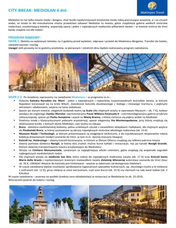CITY-BREAK: MEDIOLAN 4 dni Mediolan to nie tylko miasto mody i designu, choć butiki najsłynniejszych kreatorów mody robią piorunujące wrażenie, a i na ulicach widać, że moda to dla mieszkańców miasta prawdziwa zabawa! Mediolan to miasto, gdzie znajdziecie galerie wielkich mistrzów malarstwa, oszałamiającą katedrę, wspaniałą operę i jeden z największych stadionów piłkarskich świata – w mieście mistrza da Vinci każdy znajdzie coś dla siebie! PROGRAM RAMOWY: DZIEŃ 1: Zbiórka na wybranym lotnisku na 2 godziny przed wylotem, odprawa i przelot do Mediolanu Bergamo. Transfer do hotelu, zakwaterowanie i nocleg. Uwaga! Jeśli pozwolą na to godziny przelotów, w pierwszym i ostatnim dniu będzie realizowany program zwiedzania. DZIEŃ 2-3: Po śniadaniu zapraszamy na zwiedzanie Mediolanu – w programie m.in.: Gotycka Katedra Narodzin św. Marii - jeden z największych i najbardziej rozpoznawalnych kościołów świata, w którym Napoleon koronował się na króla Włoch. Zwiedzanie kościoła zbudowanego z białego i różowego marmuru, z pięknymi witrażami i zdobieniami, wejście na taras widokowy Spacer po starym mieście: elegancki budynek teatru La Scala (dla chętnych wizyta w operowym Muzeum – ok. 7 €), bulwar wiodący do ceglanego Zamku Sforzów; reprezentacyjny Pasaż Wiktora Emanuela II - czterokondygnacyjna galeria przykryta szklaną kopułą: spacer po Parku Sempione i wjazd na Wieżę Branca, z której roztacza się piękny widok na Mediolan Dzielnica mody z klasycystycznymi pałacami arystokracji, spacer elegancką Via Montenapoleone, przy której znajdują się ekskluzywne butiki, z których słynie Mediolan; czas wolny na zakupy Brera - dzielnica mediolańskiej bohemy, pełna urokliwych uliczek z niewielkimi sklepikami i kafejkami, dla chętnych wejście do Pinakoteki Brera, w której wystawione są obrazy największych mistrzów włoskiego malarstwa (ok. 13 €) Muzeum Nauki i Technologii, w którym prezentowane są osiągnięcia techniczne, a do najciekawszych eksponatów należy kolekcja drewnianych modeli Leonarda da Vinci, w tym m.in. słynnej maszyny latającej Kościół św. Ambrożego – dawny kościół koronacyjny, w którym w Złotym Ołtarzu znajdują się relikwie patrona miasta Dawna portowa dzielnica Navigli, w której dziś znaleźć można liczne kafejki i restauracje; rejs po kanale Navigli Grande, którym dawniej transportowano towary przybywające do Mediolanu Wizyta na Cimitero Monumentale, uważanym za najpiękniejszy włoski cmentarz, gdzie znajdują się wspaniałe nagrobki najbogatszych mediolańskich rodzin Dla chętnych wizyta na stadionie San Siro, który należy do największych stadionów świata (ok. 17 €) oraz Kościół Santa Maria delle Grazie z najsłynniejszym ściennym malowidłem świata Ostatnią Wieczerzą autorstwa Leonarda da Vinci (tour ok. 35 €, UWAGA! Wejście do kościoła jest limitowane - wejście w zależności od dostępności biletów!) W czasie zwiedzania będzie możliwość spróbowania regionalnych specjałów kulinarnych, np. złocistego risotto a la milanese z szafranem (ok. 12 €), giczy cielęcej w sosie warzywnym, czyli osso bucco (ok. 15 €) czy słynnych na cały świat lodów (ok. 2 €/kulka) W czasie zwiedzania – przerwa na posiłek (średnia cena obiadokolacji w restauracji w Mediolanie to ok. 15-20 €). Wieczorami powrót do hotelu i nocleg. DZIEŃ 4: Po śniadaniu wykwaterowanie. Transfer na lotnisko, odprawa i przelot do kraju. HOTELE 3* położone w niewielkim oddaleniu od ścisłego centrum Mediolanu, w pobliżu przystanku komunikacji miejskiej. Wszystkie hotele oferują zakwaterowanie w pokojach 2-osobowych (możliwość 1 dostawki) z łazienką, TV i telefonem. Wyżywienie: Śniadania kontynentalne PRZYKŁADOWY HOTEL: ŚWIADCZENIA ZAWARTE W CENIE: Przelot na wybranej trasie (wraz z opłatami lotniskowymi) Bagaż podręczny (cena NIE zawiera bagażu głównego, istnieje możliwość dopłaty do dużej walizki) Transfer lotnisko – hotel – lotnisko 3 noclegi w hotelu 3* Pokoje 2-osobowe z łazienkami 3 śniadania Opieka pilota Ubezpieczenie podstawowe Signal Iduna (KL do 10.000 €, NNW do 15.000 zł, CHP i bagaż do 1.000 zł) KOSZTY DODATKOWE: Orientacyjny koszt realizacji programu zwiedzania to ok. 80-90€ (w zależności od wielkości grupy) - kwota ta obejmuje przejazdy komunikacją miejską podczas programu zwiedzania, bilety wstępu do zwiedzanych obiektów wraz z kosztami ich rezerwacji (Duomo Pass, Muzeum Nauki i Technologii, Wieża Branca), rejs po Navigli Grande oraz lokalnych przewodników. Cena nie zawiera podatku miejskiego w wysokości ok. 3-4 €/os/noc Opcje dla chętnych (Muzeum La Scala, Pinakoteka Brera, San Siro, Ostatnia Wieczerza) są dodatkowo płatne. INFORMACJE DODATKOWE: Promocja „S” - promocja dla osób podróżujących w pojedynkę, dokwaterowanie do pokoju 2- lub 3-osobowego Dopłata za pokój 1-osobowy +400 zł Zniżka dla trzeciej osoby w pokoju -100 zł Gwarancja niezmienności ceny +35 zł WYBIERZ SWÓJ BAGAŻ: Cena naszych weekendów zawiera jedynie bagaż podręczny, którego wymiar i wagę określa linia lotnicza operująca na danej trasie – szczegóły znajdziecie na naszej stronie www.matimpex.pl. Przypominamy, że w bagażu podręcznym nie mogą znajdować się płyny ani żele czy fluidy w opakowaniach większych niż 100 ml oraz ostre narzędzia (noże, metalowe pilniczki do paznokci, nożyczki, itp.). RYANAIR – REZERWACJA MIEJSC W SAMOLOCIE: Dotyczy wszystkich wylotów poza Warszawą! Z uwagi na zmiany w warunkach bezpłatnej odprawy on-line w liniach lotniczych Ryanair, nie jesteśmy w stanie zagwarantować, że Klienci z jednej rezerwacji będą w samolocie siedzieć obok siebie. Istnieje możliwość wykupienia miejsc w samolocie w opcji standard oraz premium (z większą przestrzenią na nogi). Wykupienie miejsc premium w zależności od dostępności na danym locie – szczegóły na www.matimpex.pl WAŻNE I