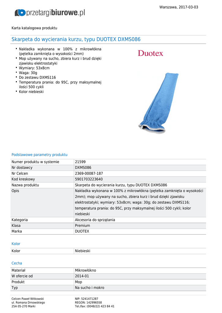 Warszawa, 2017-03-03 Karta katalogowa produktu Skarpeta do wycierania kurzu, typu DUOTEX DXMS086 Nakładka wykonana w 100% z mikrowłókna (pętelka zamknięta o wysokości 2mm) Mop używany na sucho, zbiera kurz i brud dzięki zjawisku elektrostatyki Wymiary: 53x8cm Waga: 30g Do zestawu DXMS116 Temperatura prania: do 95C, przy maksymalnej ilości 500 cykli Kolor niebieski Podstawowe parametry produktu Numer produktu w systemie 21599 Nr dostawcy DXMS086 Nr Celcen 2369-00087-187 Kod kreskowy 5901703223640 Nazwa produktu Skarpeta do wycierania kurzu, typu DUOTEX DXMS086 Opis Nakładka wykonana w 100% z mikrowłókna (pętelka zamknięta o wysokości 2mm); mop używany na sucho, zbiera kurz i brud dzięki zjawisku elektrostatyki; wymiary: 53x8cm; waga: 30g; do zestawu DXMS116; temperatura prania: do 95C, przy maksymalnej ilości 500 cykli; kolor niebieski Kategoria Akcesoria do sprzątania Klasa Premium Marka DUOTEX Kolor Kolor Niebieski Cecha Materiał Mikrowłókno W ofercie od 2014-01 Produkt Mop Typ Na sucho i mokro Celcen Paweł Witkowski ul. Romana Dmowskiego 25A 05-270 Marki NIP: 5241471287 REGON: 142996558 Tel./fax: (0048/22) 423 84 41 Warszawa, 2017-03-03 Wymiary Pojemność (ml) B.d. Rozmiar B.d. Certyfikaty Nowy produkt w ofercie Standard Hit Standard Wspólny słownik zamówień CPV 39224300-1 Miotły i szczotki i inne artykuły do sprzątania w gospodarstwie domowym Jesteśmy przekonani, że z pomocą przetargibiurowe.pl usprawnicie Państwo własne procesy biznesowe związane ze żmudnym poszukiwaniem odpowiadających Państwu produktów oraz opracowaniem specyfikacjii zapytań ofertowych. Serdecznie zapraszamy do wspópracy Zespół, PrzetargiBiurowe.pl Celcen Paweł Witkowski ul. Romana Dmowskiego 25A 05-270 Marki NIP: 5241471287 REGON: 142996558 Tel./fax: (0048/22) 423 84 41