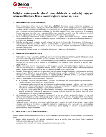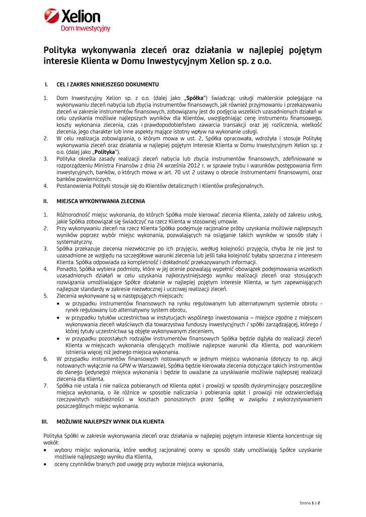 Polityka wykonywania zleceń oraz działania w najlepiej pojętym interesie Klienta w Domu Inwestycyjnym Xelion sp. z o.o. I. CEL I ZAKRES NINIEJSZEGO DOKUMENTU 1. 4. Dom Inwestycyjny Xelion sp. z o.o. (dalej jako „Spółka”) świadcząc usługi maklerskie polegające na wykonywaniu zleceń nabycia lub zbycia instrumentów finansowych, jak również przyjmowaniu i przekazywaniu zleceń w zakresie instrumentów finansowych, zobowiązany jest do podjęcia wszelkich uzasadnionych działań w celu uzyskania możliwie najlepszych wyników dla Klientów, uwzględniając cenę instrumentu finansowego, koszty wykonania zlecenia, czas i prawdopodobieństwo zawarcia transakcji oraz jej rozliczenia, wielkość zlecenia, jego charakter lub inne aspekty mające istotny wpływ na wykonanie usługi. W celu realizacja zobowiązania, o którym mowa w ust. 2, Spółka opracowała, wdrożyła i stosuje Politykę wykonywania zleceń oraz działania w najlepiej pojętym interesie Klienta w Domu Inwestycyjnym Xelion sp. z o.o. (dalej jako „Polityka”). Polityka określa zasady realizacji zleceń nabycia lub zbycia instrumentów finansowych, zdefiniowane w rozporządzeniu Ministra Finansów z dnia 24 września 2012 r. w sprawie trybu i warunków postępowania firm inwestycyjnych, banków, o których mowa w art. 70 ust 2 ustawy o obrocie instrumentami finansowymi, oraz banków powierniczych. Postanowienia Polityki stosuje się do Klientów detalicznych i Klientów profesjonalnych. II. MIEJSCA WYKONYWANIA ZLECENIA 1. Różnorodność miejsc wykonania, do których Spółka może kierować zlecenia Klienta, zależy od zakresu usług, jakie Spółka zobowiązał się świadczyć na rzecz Klienta w stosownej umowie. Przy wykonywaniu zleceń na rzecz Klienta Spółka podejmuje racjonalne próby uzyskania możliwie najlepszych wyników poprzez wybór miejsc wykonania, pozwalających na osiąganie takich wyników w sposób stały i systematyczny. Spółka przekazuje zlecenia niezwłocznie po ich przyjęciu, według kolejności przyjęcia, chyba że nie jest to uzasadnione ze względu na szczegółowe warunki zlecenia lub jeśli taka kolejność byłaby sprzeczna z interesem Klienta. Spółka odpowiada za kompletność i dokładność przekazywanych informacji. Ponadto, Spółka wybiera podmioty, które w jej ocenie pozwalają wypełnić obowiązek podejmowania wszelkich uzasadnionych działań w celu uzyskania najkorzystniejszego wyniku realizacji zleceń oraz stosujących rozwiązania umożliwiające Spółce działanie w najlepiej pojętym interesie Klienta, w tym zapewniających najlepsze standardy w zakresie niezwłocznej i uczciwej realizacji zleceń. Zlecenia wykonywane są w następujących miejscach: w przypadku instrumentów finansowych na rynku regulowanym lub alternatywnym systemie obrotu rynek regulowany lub alternatywny system obrotu, w przypadku tytułów uczestnictwa w instytucjach wspólnego inwestowania – miejsce zgodne z miejscem wykonywania zleceń właściwych dla towarzystwa funduszy inwestycyjnych / spółki zarządzającej, którego / której tytuły uczestnictwa są objęte wykonywanym zleceniem, w przypadku pozostałych rodzajów instrumentów finansowych Spółka będzie dążyła do realizacji zleceń Klienta w miejscach wykonania oferujących możliwie najlepsze warunki dla Klienta, pod warunkiem istnienia więcej niż jednego miejsca wykonania. W przypadku instrumentów finansowych notowanych w jednym miejscu wykonania (dotyczy to np. akcji notowanych wyłącznie na GPW w Warszawie), Spółka będzie kierowała zlecenia dotyczące takich instrumentów do danego (jedynego) miejsca wykonania i będzie to uważane za uzyskiwanie możliwie najlepszej realizacji zlecenia dla Klienta. Spółka nie ustala i nie nalicza pobieranych od Klienta opłat i prowizji w sposób dyskryminujący poszczególne miejsca wykonania, o ile różnice w sposobie naliczania i pobierania opłat i prowizji nie odzwierciedlają rzeczywistych rozbieżności w kosztach ponoszonych przez Spółkę w związku z wykorzystywaniem poszczególnych miejsc wykonania. 2. 3. 2. 3. 4. 5. 6. 7. III. MOŻLIWIE NAJLEPSZY WYNIK DLA KLIENTA Polityka Spółki w zakresie wykonywania zleceń oraz działania w najlepiej pojętym interesie Klienta koncentruje się wokół: wyboru miejsc wykonania, które według racjonalnej oceny w sposób stały umożliwiają Spółce uzyskanie możliwie najlepszego wyniku dla Klienta, oceny czynników branych pod uwagę przy wyborze miejsca wykonania, Strona 1 z 2 Polityka wykonywania zleceń oraz działania w najlepiej pojętym interesie Klienta w Domu Inwestycyjnym Xelion sp. z o.o. IV. 1. 2. 3. 4. 5. V. oceny charakterystyki Klienta, zarówno pod względem jego szczególnych wymagań określonych w odpowiedniej umowie o świadczenie usług, jak i rodzaju usługi, którą Spółki może zaoferować, żeby te wymagania spełnić. ZASADY DZIAŁANIA W NAJLEPIEJ POJĘTYM INTERESIE KLIENTA Realizując zobowiązanie działania w najlepiej pojętym interesie Klienta, Spółka bierze pod uwagę następujące czynniki: cenę instrumentu finansowego w danym miejscu wykonania, koszty ponoszone przez Klienta w związku z wykonaniem zlecenia - opłaty i prowizje związane bezpośrednio z wykonaniem zlecenia, czas zawarcia transakcji, prawdopodobieństwo wykonania i rozliczenia transakcji, wielkość zlecenia, charakter zlecenia oraz inne czynniki mające istotny wpływ na realizację zlecenia. Względną wagę czynników przypisuje się poprzez odniesienie do następujących kryteriów: klasyfikacji Klienta detalicznego bądź profesjonalnego, charakterystyki zlecenia Klienta, cechy instrumentu finansowego będącego przedmiotem zlecenia, charakterystyki miejsc realizacji, do których można skierować zlecenie. Spółka przypisuje następnie względne wagi czynnikom, o których mowa powyżej: wagę wysoką - w odniesieniu do ceny oraz kosztów transakcji, wagę średnią - w odniesieniu do bezzwłoczności r