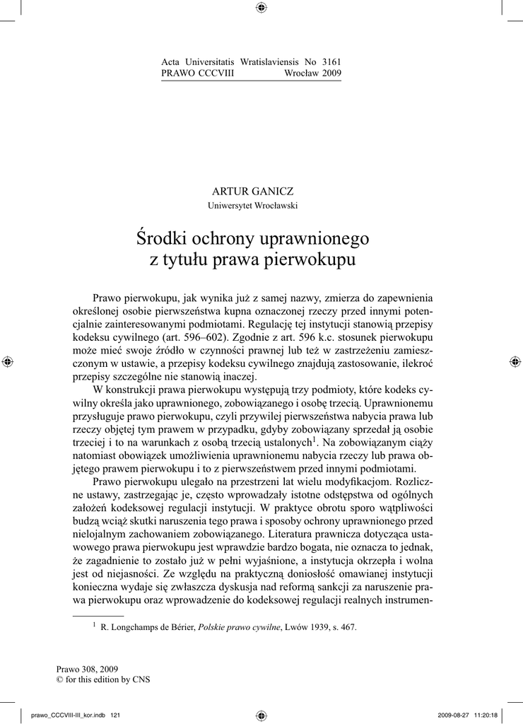 Acta Universitatis Wratislaviensis No 3161 PRAWO CCCVIII Wrocław 2009 ARTUR GANICZ Uniwersytet Wrocławski Środki ochrony uprawnionego z tytułu prawa pierwokupu Prawo pierwokupu, jak wynika już z samej nazwy, zmierza do zapewnienia określonej osobie pierwszeństwa kupna oznaczonej rzeczy przed innymi potencjalnie zainteresowanymi podmiotami. Regulację tej instytucji stanowią przepisy kodeksu cywilnego (art. 596–602). Zgodnie z art. 596 k.c. stosunek pierwokupu może mieć swoje źródło w czynności prawnej lub też w zastrzeżeniu zamieszczonym w ustawie, a przepisy kodeksu cywilnego znajdują zastosowanie, ilekroć przepisy szczególne nie stanowią inaczej. W konstrukcji prawa pierwokupu występują trzy podmioty, które kodeks cywilny określa jako uprawnionego, zobowiązanego i osobę trzecią. Uprawnionemu przysługuje prawo pierwokupu, czyli przywilej pierwszeństwa nabycia prawa lub rzeczy objętej tym prawem w przypadku, gdyby zobowiązany sprzedał ją osobie trzeciej i to na warunkach z osobą trzecią ustalonych1. Na zobowiązanym ciąży natomiast obowiązek umożliwienia uprawnionemu nabycia rzeczy lub prawa objętego prawem pierwokupu i to z pierwszeństwem przed innymi podmiotami. Prawo pierwokupu ulegało na przestrzeni lat wielu modyfikacjom. Rozliczne ustawy, zastrzegając je, często wprowadzały istotne odstępstwa od ogólnych założeń kodeksowej regulacji instytucji. W praktyce obrotu sporo wątpliwości budzą wciąż skutki naruszenia tego prawa i sposoby ochrony uprawnionego przed nielojalnym zachowaniem zobowiązanego. Literatura prawnicza dotycząca ustawowego prawa pierwokupu jest wprawdzie bardzo bogata, nie oznacza to jednak, że zagadnienie to zostało już w pełni wyjaśnione, a instytucja okrzepła i wolna jest od niejasności. Ze względu na praktyczną doniosłość omawianej instytucji konieczna wydaje się zwłaszcza dyskusja nad reformą sankcji za naruszenie prawa pierwokupu oraz wprowadzenie do kodeksowej regulacji realnych instrumen1 R. Longchamps de Bérier, Polskie prawo cywilne, Lwów 1939, s. 467. Prawo 308, 2009 © for this edition by CNS prawo_CCCVIII-III_kor.indb 121 2009-08-27 11:20:18 122 ARTUR GANICZ tów służących ochronie interesów podmiotów uprawnionych z tytułu prawa pierwokupu. Analiza obecnego stanu prawnego (art. 599 k.c.) pozwala na wyraźne wyodrębnienie dwóch rodzajów sankcji stosowanych w razie naruszenia prawa pierwokupu. Pierwszą z nich, przewidzianą w § 1 przytoczonego przepisu, jest odpowiedzialność odszkodowawcza zobowiązanego za szkodę wyrządzoną uprawnionemu wskutek zawarcia bezwarunkowej umowy sprzedaży lub zaniechania zawiadomienia go o dokonaniu sprzedaży, jak również w przypadku podania do jego wiadomości istotnych postanowień umowy sprzedaży niezgodnych z rzeczywistością. Z kolei § 2 przewiduje sankcję nieważności, jednak zawęża istotnie zakres jej zastosowania do wymienionych w nim przypadków ustawowego prawa pierwokupu. I. Sankcja bezwzględnej nieważności bezwarunkowej umowy sprzedaży Ustawodawca wprowadził wprawdzie sankcję bezwzględnej nieważności bezwarunkowej umowy sprzedaży przedmiotu objętego prawem pierwokupu, jednakże znacząco ograniczył zakres jej zastosowania. Nie tylko bowiem nie odnosi się ona do umownego prawa pierwokupu, ale także w ramach ustawowego prawa pierwokupu przewidziana została jedynie w sytuacji, gdy uprawnionymi są: Skarb Państwa, jednostki samorządu terytorialnego, współwłaściciele lub dzierżawcy2. Jakkolwiek przepis art. 599 § 2 brzmi dosyć jednoznacznie, to w doktrynie prawniczej powstały jednak wątpliwości co do następstw nieważności bezwarunkowej umowy sprzedaży. Część autorów opowiedziała się bowiem za stanowiskiem, zgodnie z którym nieważny jest jedynie bezwarunkowy charakter tej umowy, natomiast sama umowa przekształca się tym samym w umowę warunkową, wobec czego nadal dopuszczalne jest wykonanie prawa pierwokupu przez podmiot do tego uprawniony3. Uzasadnienie takiego rozumienia owego przepisu ma stanowić wzgląd na cele prawodawcy i ratione legis instytucji prawa pierwokupu, co – w przekonaniu Cz. Żuławskiej – ma akcentować ochronę osoby uprawnionej i sankcjonowanie nieuczciwych zachowań zobowiązanego. Dlatego przyjęcie przez uprawnionego treści nieważnej umowy poprzez złożenie jednostronnego oświadczenia woli prowadzić ma do powstania treści umowy między 2 Sankcja ta znajdzie też zastosowanie, gdy prawo pierwokupu przysługuje Agencji Nieruchomości Rolnych działającej jednak na rzecz Skarbu Państwa, jak wynika to z ustawy z 11 kwietnia 2003 r. o kształtowaniu ustroju rolnego (Dz.U. z 2003 r., Nr 64, poz. 592). 3 Tak m.in. A. Kunicki, Zakres skuteczności prawa pierwokupu, NP 1966/12, s. 1533–1534; Cz. Żuławska, [w:] Komentarz do Kodeksu cywilnego. Księga trzecia. Zobowiązania, t. 2, red. G. Bieniek, Warszawa 2006, s. 133. Prawo 308, 2009 © for this edition by CNS prawo_CCCVIII-III_kor.indb 122 2009-08-27 11:20:19 Środki ochrony uprawnionego z tytułu prawa pierwokupu 123 zobowiązanym a uprawnionym4. Obierając taki tok rozumowania, nieważność z § 2 art. 599 k.c. byłaby jedynie nieważnością ograniczoną podmiotowo i dotyczyła tylko kontrahentów, co w konsekwencji oznaczałoby, że złożone w takiej sytuacji oświadczenie o wykonaniu prawa pierwokupu czyniłoby umowę bezwarunkowej sprzedaży ważną i skuteczną między uprawnionym a zobowiązanym. Złożenie zatem oświadczenia woli o wykonaniu swego prawa przez uprawnionego z tytułu prawa pierwokupu stanowiłoby czynność konwalidującą nieważną pierwotnie czynność prawną. A. Kunicki idzie w swych rozważaniach nawet o krok dalej i zaznacza, że możliwe jest także złożenie, po zawarciu wspomnianej bezwarunkowej umowy sprzedaży, oświadczenia o treści negatywnej, które również spowoduje konwalidację nieważnej dotąd umowy5. W literaturze przeważa jednak pogląd, że niew